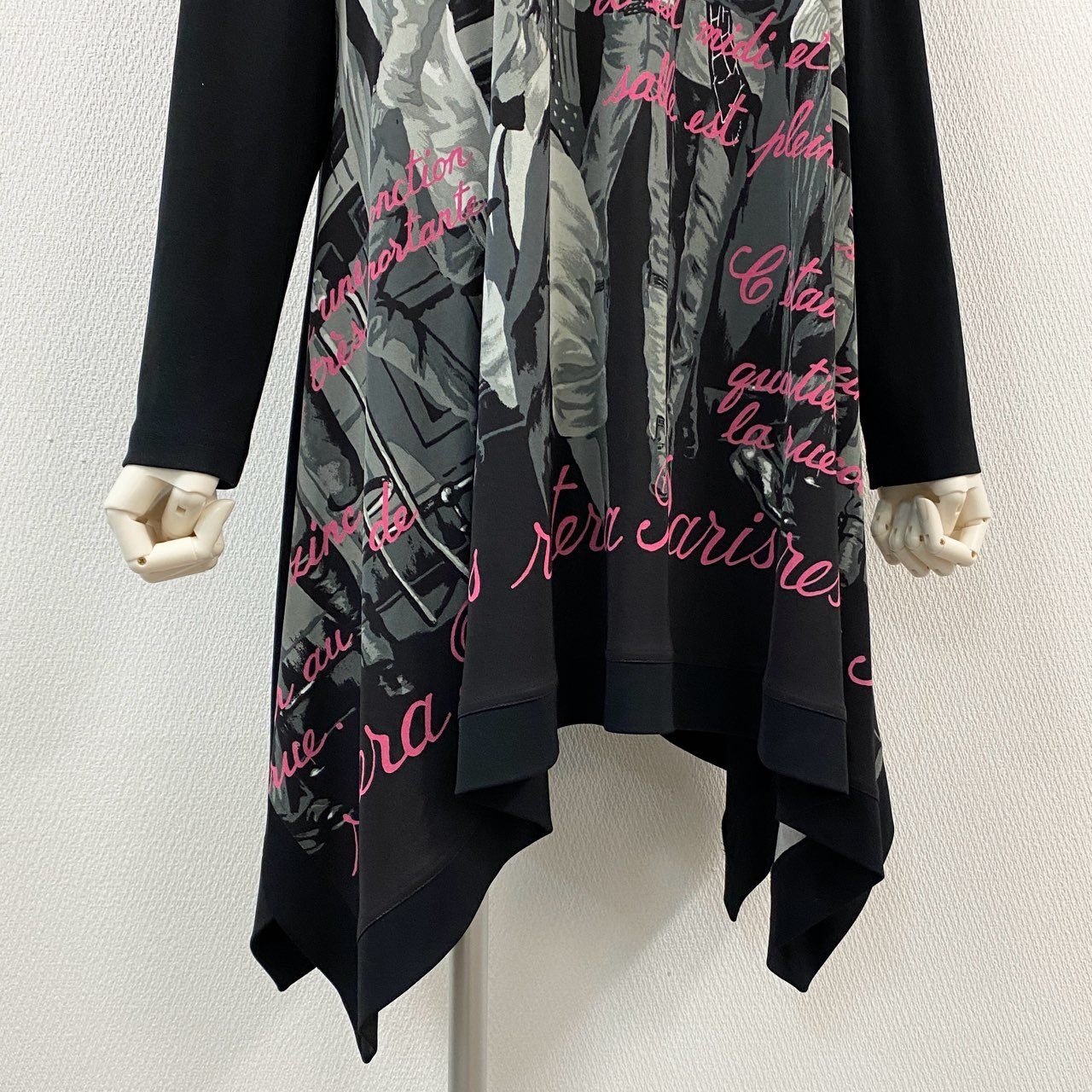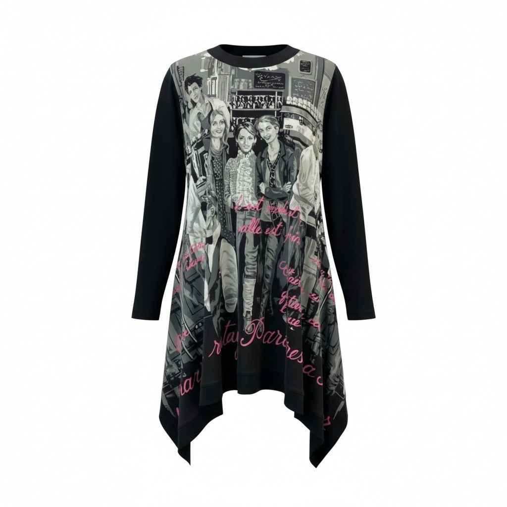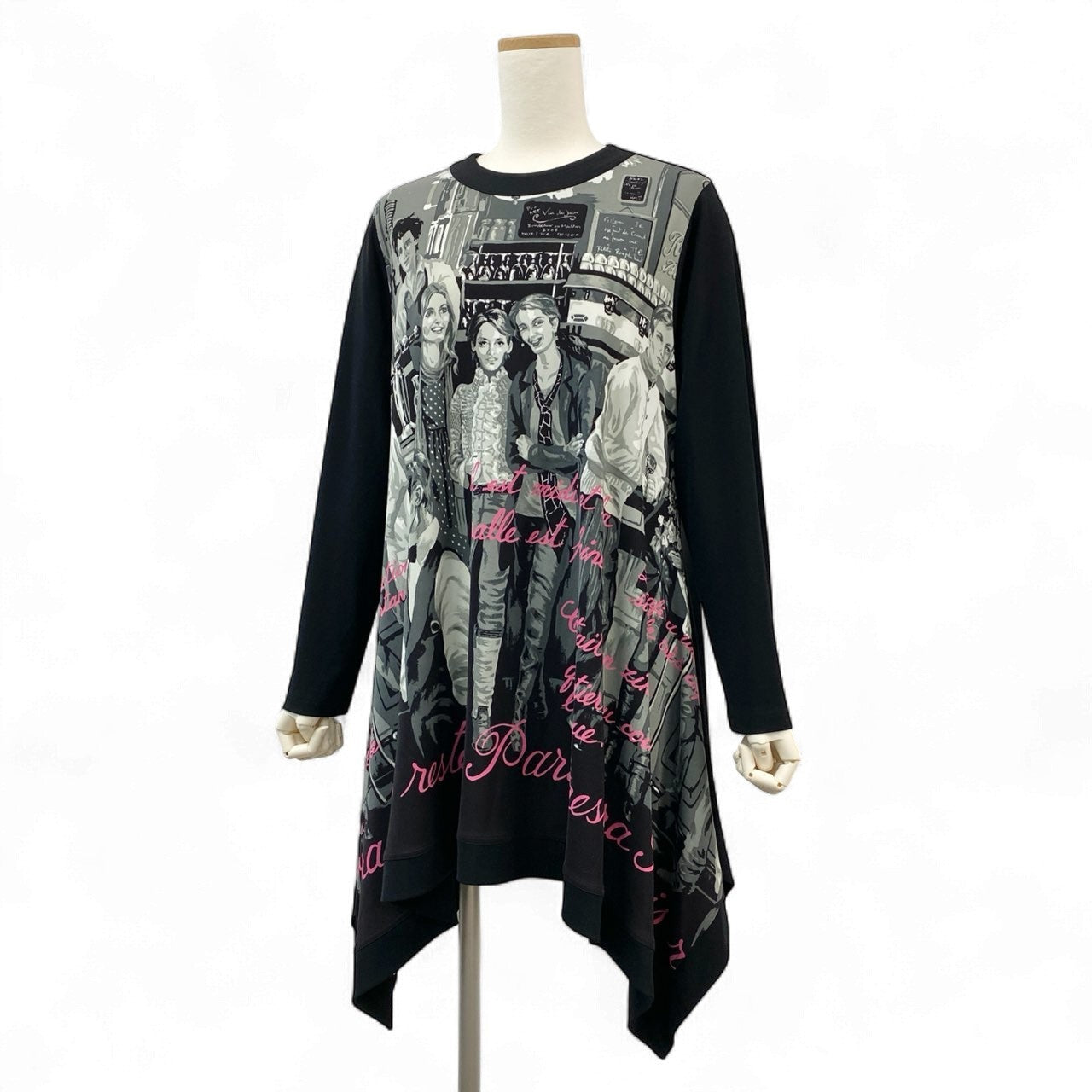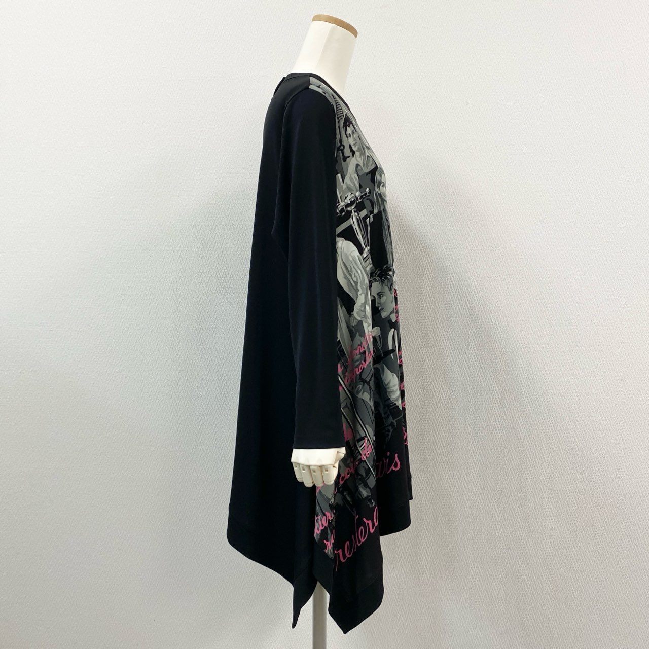 ブラック×グレーのモノトーンに、鮮やかなピンクの筆記体が映える、アート性の高いプリントワンピースです。前面には人物が描かれたグラフィックパターンを採用し、TOKUKO 1er VOL らしい個性的で都会的なデザインが際立つ一着。しなやかで落ち感のある素材が揺れ、裾はアシンメトリーに広がるため動くたびに美しいドレープ感を楽しめます。デイリーはもちろん、舞台観劇・イベント・お出かけなどにも映える存在感のあるアイテムです。