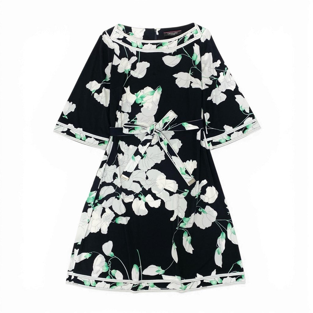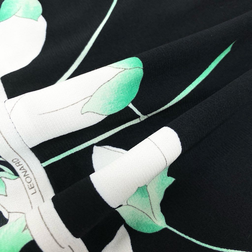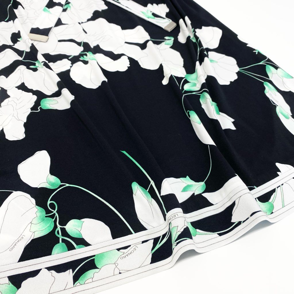 40l25 LEONARD レオナール カンカン素材ロングワンピース 7分袖 美しい花柄プリント 40 ブラック ホワイト レディースu02t