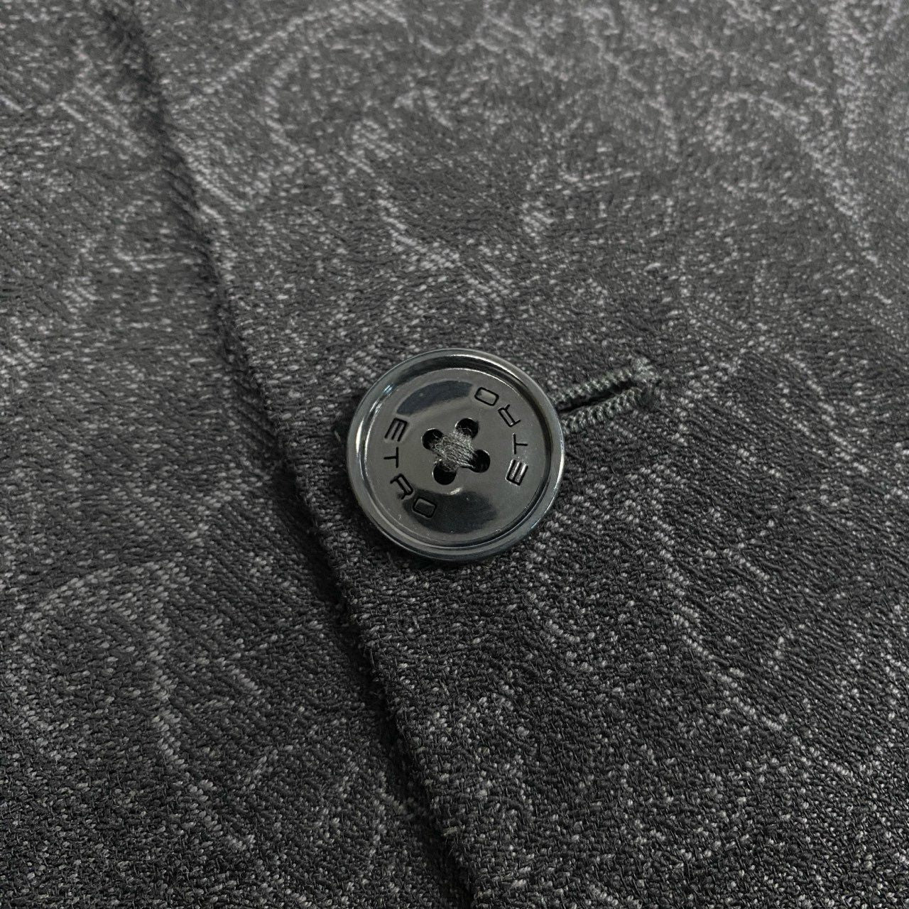 チャコールグレーにダークネイビーを重ねたような深みのあるカラーに、繊細なペイズリー柄を全面に配したETROのテーラードジャケットです。マットでやや起毛感のある上質素材が立体的な柄を引き立て、エレガントな雰囲気を演出します。裏地にはブルー系のオーナメント柄を採用し、ブランドらしい遊び心もプラス。ドレススタイルにはもちろん、デニムと合わせたラグジュアリーカジュアルにも映える一着です。