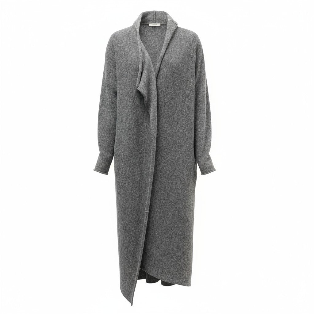 柔らかな ミドルグレー の色味に、マットで上質な ニット素材 が美しく落ちる JURGEN LEHL Babaghuri のロングカーディガンです。 前立てはボタンのないミニマルなデザインで、自然なドレープが大人の上品さを引き立てます。 足首近くまで届くロング丈ながら、軽やかな素材感でストレスなく羽織れるのが魅力。 ワンピースやワイドパンツとの相性も抜群で、日常使いからリラックスシーンまで活躍します。 ゆったりとしたシルエットが体型を選ばず、美しく整えてくれる万能な一着です。