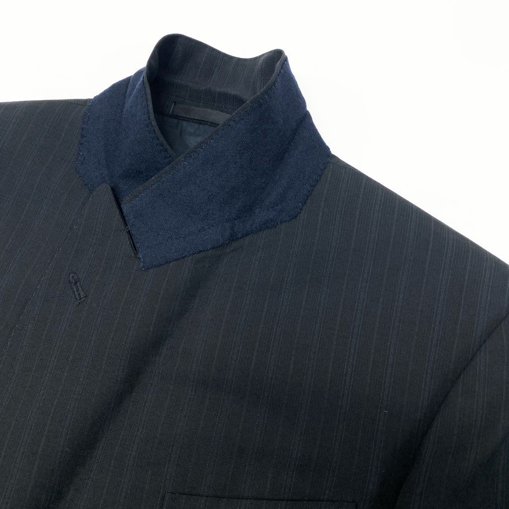 落ち着いたダークネイビー系に、控えめなピンストライプ柄が映えるクラシックなスーツセットアップ。マットで上品なウール素材が、端正なシルエットを引き立てます。ダブルブレスト仕様やフラップポケットなど、正統派ディテールが特徴。Burberrysらしい品格があり、通勤・商談から式典まで幅広く活躍する一着です。