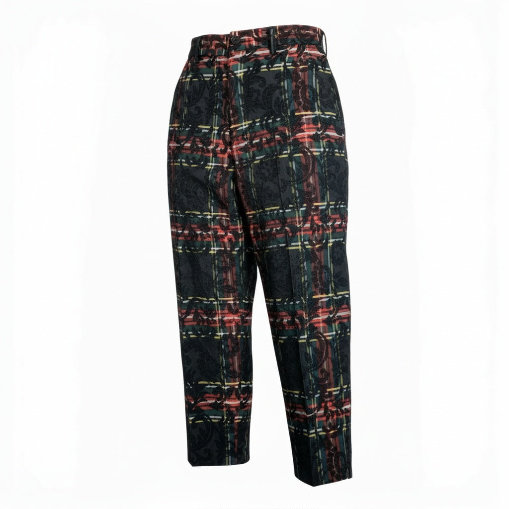 COMME des GARCONS HOMME PLUSのAD2012スラックスパンツ。 ブラックベース×レッド系のタータンチェックに、フラワーレース調モチーフを重ねた独創的な柄使いが特徴。 マットでしなやかな生地感に、腰回りのタックが立体的なシルエットを演出します。 モードスタイルの主役として、ジャケット合わせやロングトップスとも好相性な一本です。