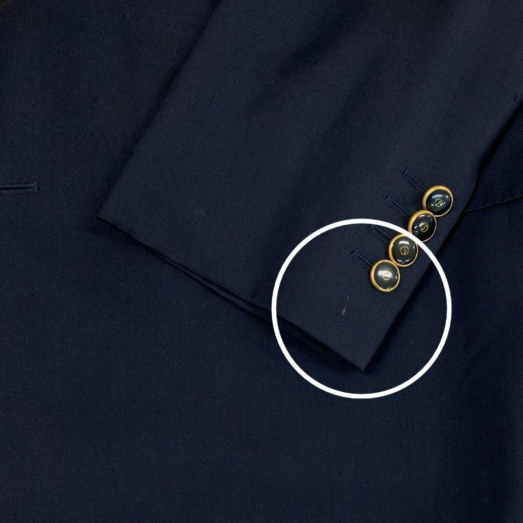 端正な**ダークネイビー**が品格を引き立てる、dunhillのテーラードジャケット。マットで上質なウール系素材感に、ダブルブレスト×ゴールド系メタルボタンがクラシックな存在感を演出します。シャープなラペルとフラップポケットで、構築的かつエレガントな印象。ビジネスから式典、ドレスコードのある場面まで対応し、装いを格上げする一着です。
