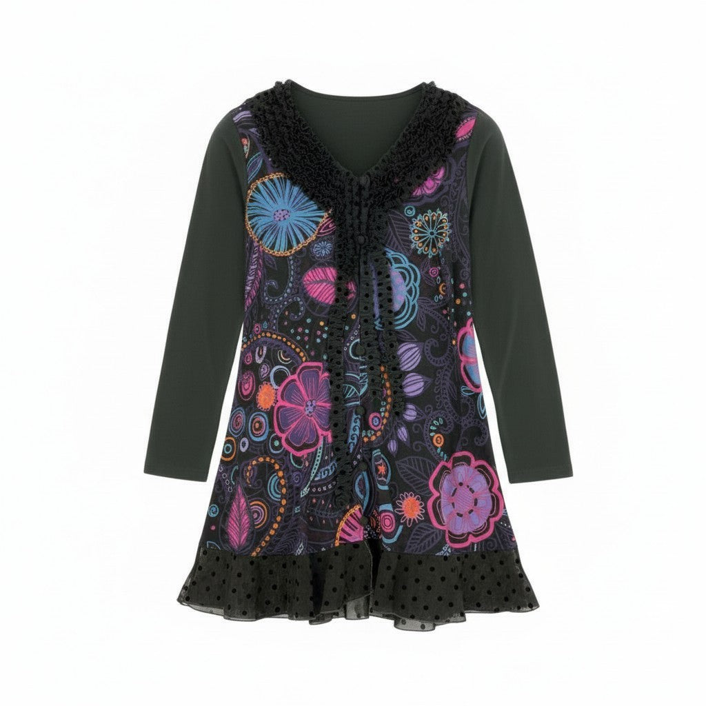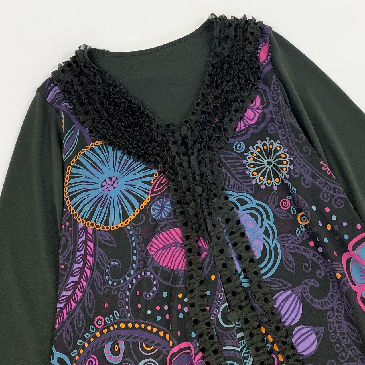 ダークカーキ×ブラックを基調としたボディに、鮮やかなピンク・ブルー・パープルの花柄プリントが映える、トクコプルミエヴォルらしい華やかなロングカーディガンです。前身頃には立体的なフリル装飾が施され、裾のドット柄のシアー切替が軽さと動きをプラス。Aラインに広がるシルエットで体型を美しくカバーしながら、コーデの主役になる存在感を持つ一着。長袖仕様でロングシーズン活躍し、ワンピースとしても羽織りとしても使える万能アイテムです。
