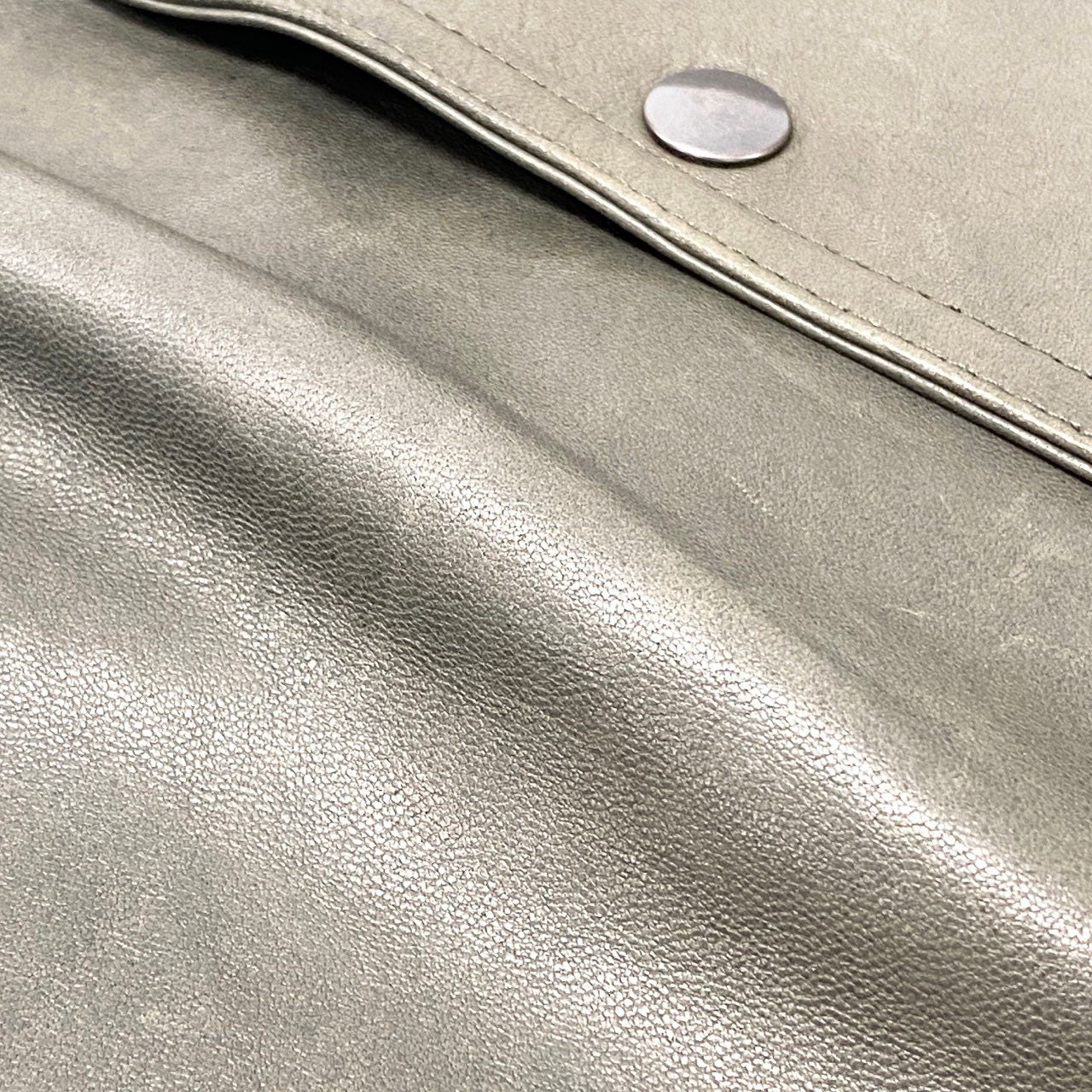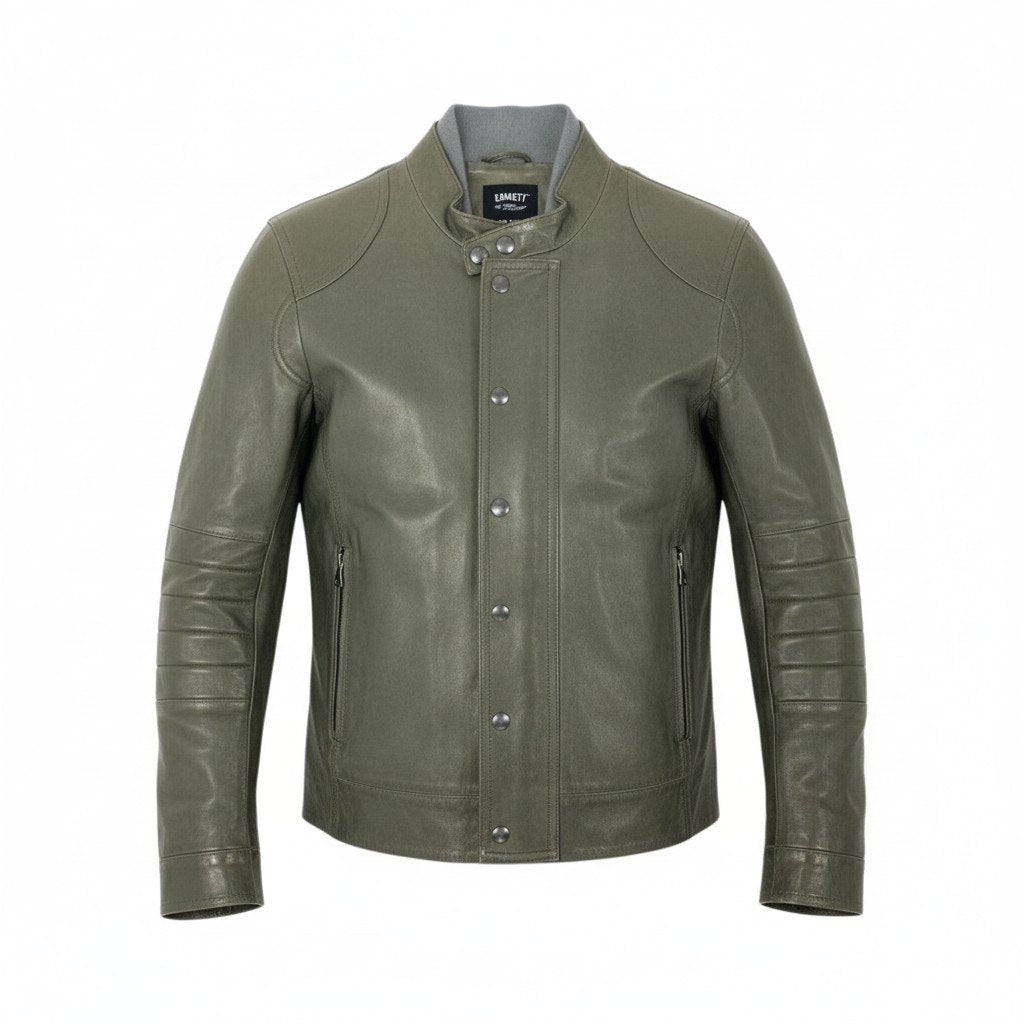 深みのある オリーブグリーン(カーキグリーン) の本革ラムスキンを使用した、EMMETI di Franco のレザージャケットです。 しっとりと柔らかく上質なラムスキン特有のマットな質感と、ミリタリーテイストのパネルステッチが高級感を引き立てます。 フロントは重ね襟+メタルスナップ仕様で、無骨さと洗練を兼ね備えたデザイン。 細身すぎない程よいシルエットで、Tシャツから薄手ニットまで合わせやすく、秋冬のアウターとして長く活躍します。 イタリアサイズ46は日本のM相当で、上質レザーを求める大人の男性におすすめの一着です。