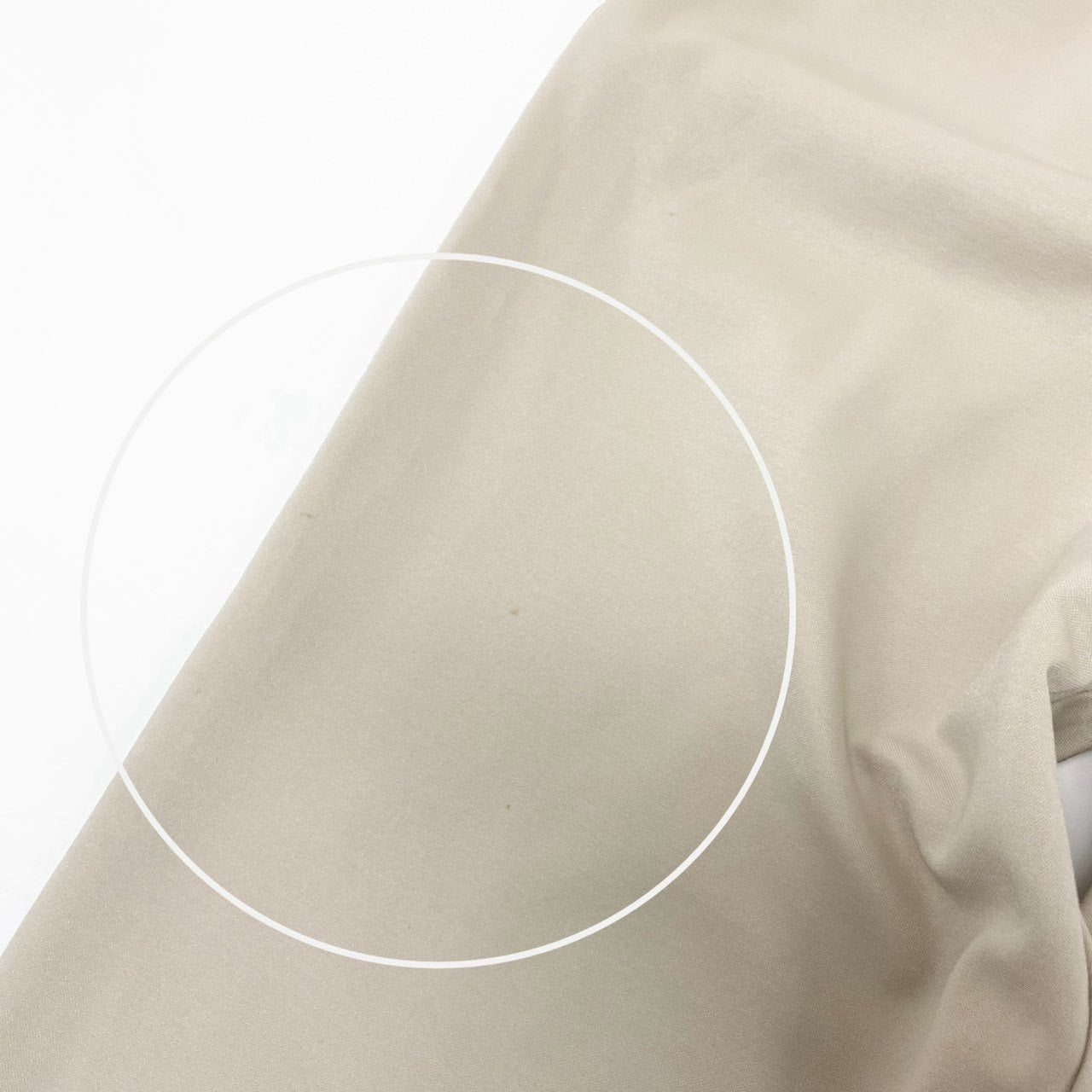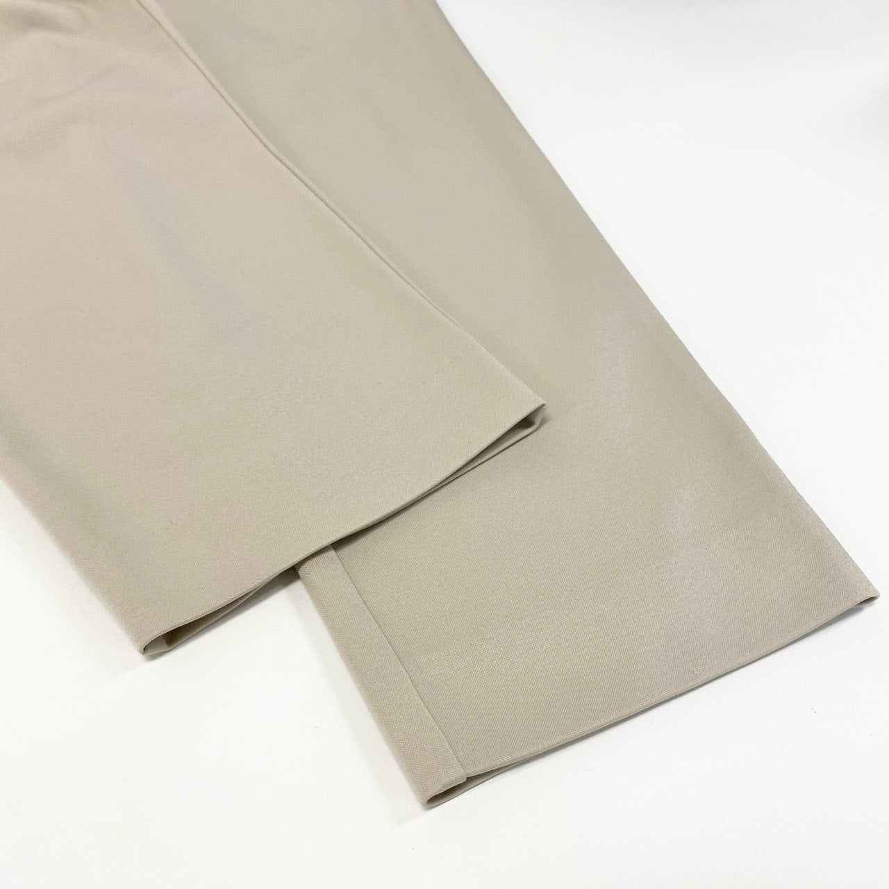 ポールスミスのレディースパンツセットアップです。色は上品なベージュで、無地のマットな素材感が落ち着いた印象を与えます。ジャケットはノーカラーデザインで1つボタン仕様、パンツはウエストゴムにリボン付きでイージーに着こなせるディテールが特徴です。シンプルながら女性らしいラインを引き立て、ビジネスからオケージョン、カジュアルな場面まで幅広く活躍します。