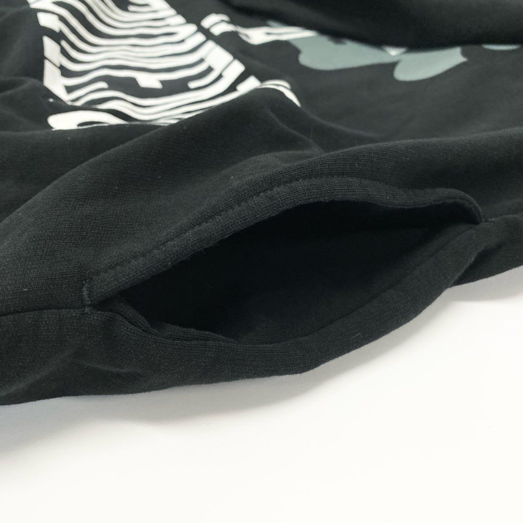 ブラックをベースに、フロントの大胆なタイポグラフィプリントが印象的なプルオーバーパーカーです。中央にはカモフラージュ調のモチーフを重ね、ストリート感のある存在感を演出。素材はコットン100%の裏毛スウェットで、マットな質感と程よい厚みが特徴です。フード付きのベーシックなディテールで着回しやすく、**フェノメノン**らしいグラフィック性を主役に、デニムやカーゴパンツと好相性の一着です。