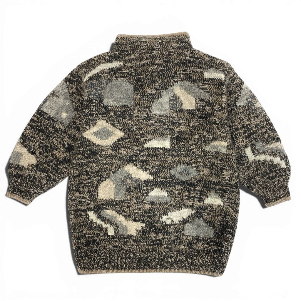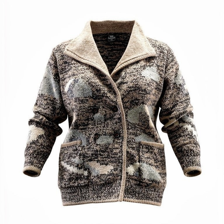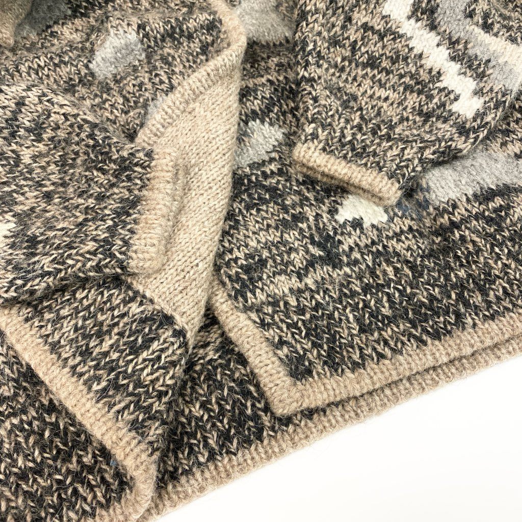 ナチュラルなベージュ×ブラウン系を基調とした、温かみのある総柄ニットが魅力のSIROGOJNOハンドニットジャケット。ざっくりとした肉厚ウール素材で、ハンドメイドならではの素朴で立体的な風合いが楽しめます。ショールカラー、フロントボタン、ポケット付きのデザインで、アウター感覚でも着用可能。デニムやワンピースと合わせやすく、北欧・民族調の雰囲気をコーデに取り入れられる一着。防寒性と雰囲気を重視したい方におすすめです。