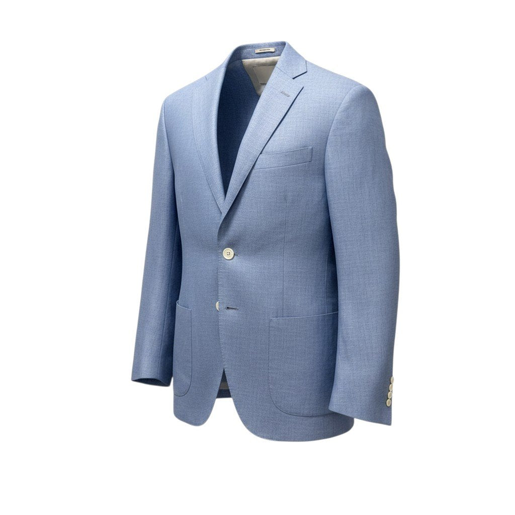 爽やかなライトブルー(サックスブルー系)が印象的なアンコンテーラードジャケットです。無地ながら繊細な織り感のあるマットな素材で、軽やかで上品な仕上がり。芯地を抑えたアンコン仕様により、柔らかく自然なシルエットを演出します。フラップポケットとベージュ系ボタンが程よいアクセントに。春夏のビジネスカジュアルやジャケパンスタイルに最適な一着です。