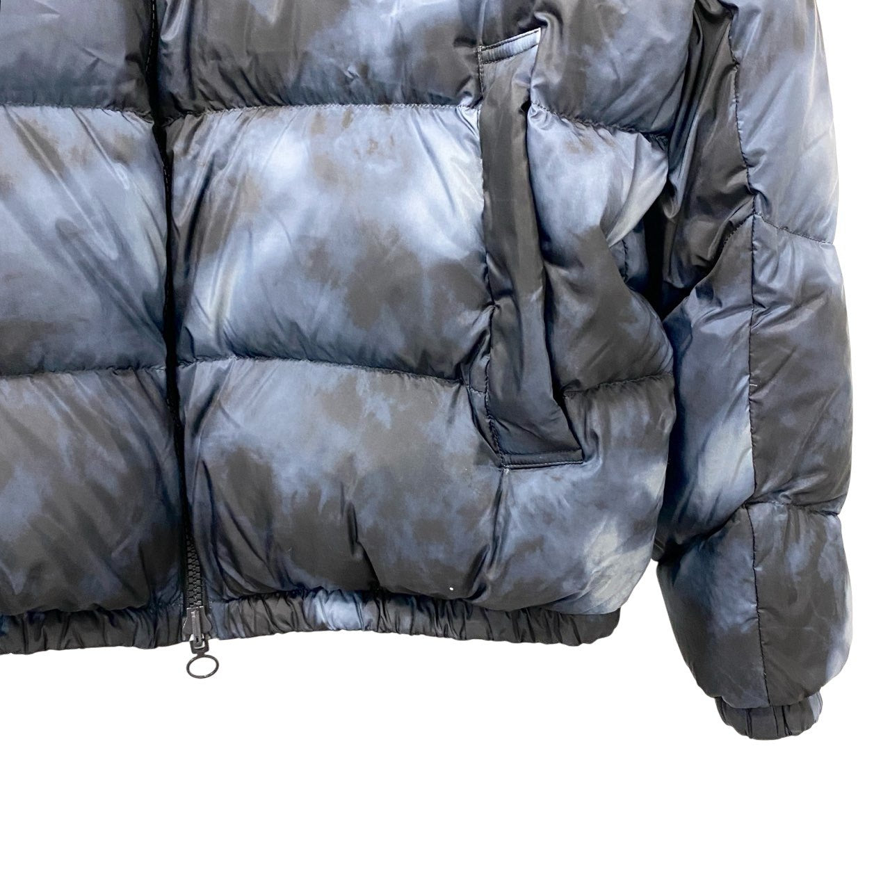 ネイビー(ミッドナイトネイビー系)をベースに、クラウド調のムラ染め柄が印象的なリバーシブルダウンジャケットです。程よい光沢のあるナイロン素材に、ボリューム感のあるダウンキルティングが防寒性を高めます。フロントはダブルジップ仕様で、スタイリングの幅も広がる2wayデザイン。胸元のロゴプリントがさりげないアクセントとなり、デイリーカジュアルからアウトドアシーンまで活躍する一着です。