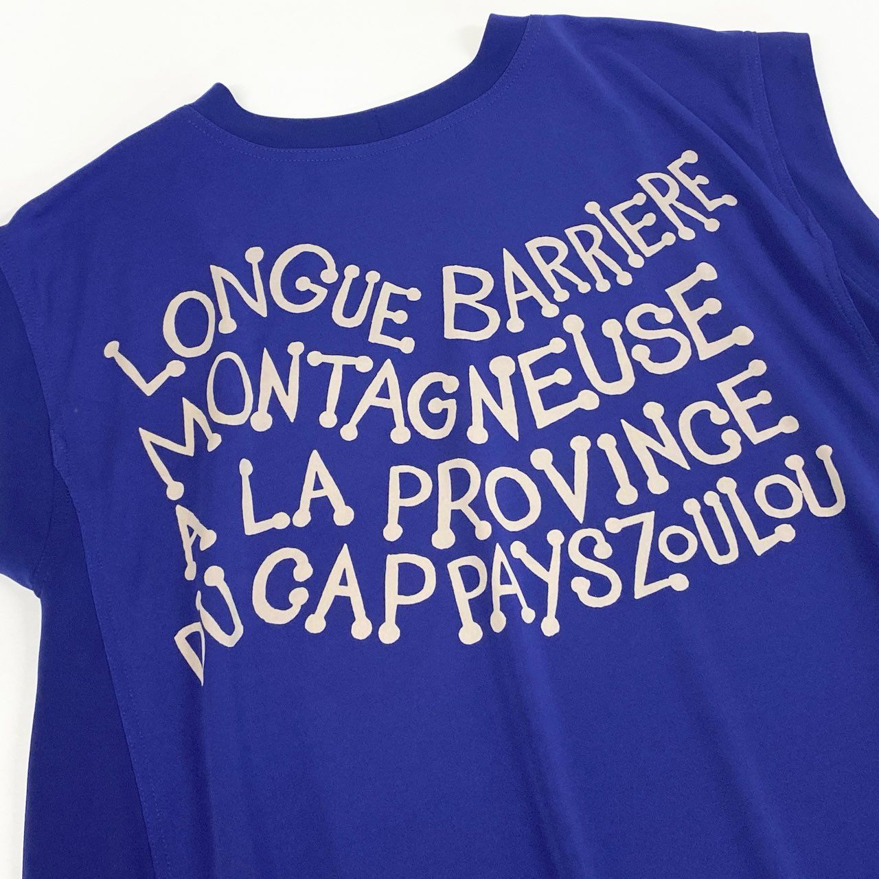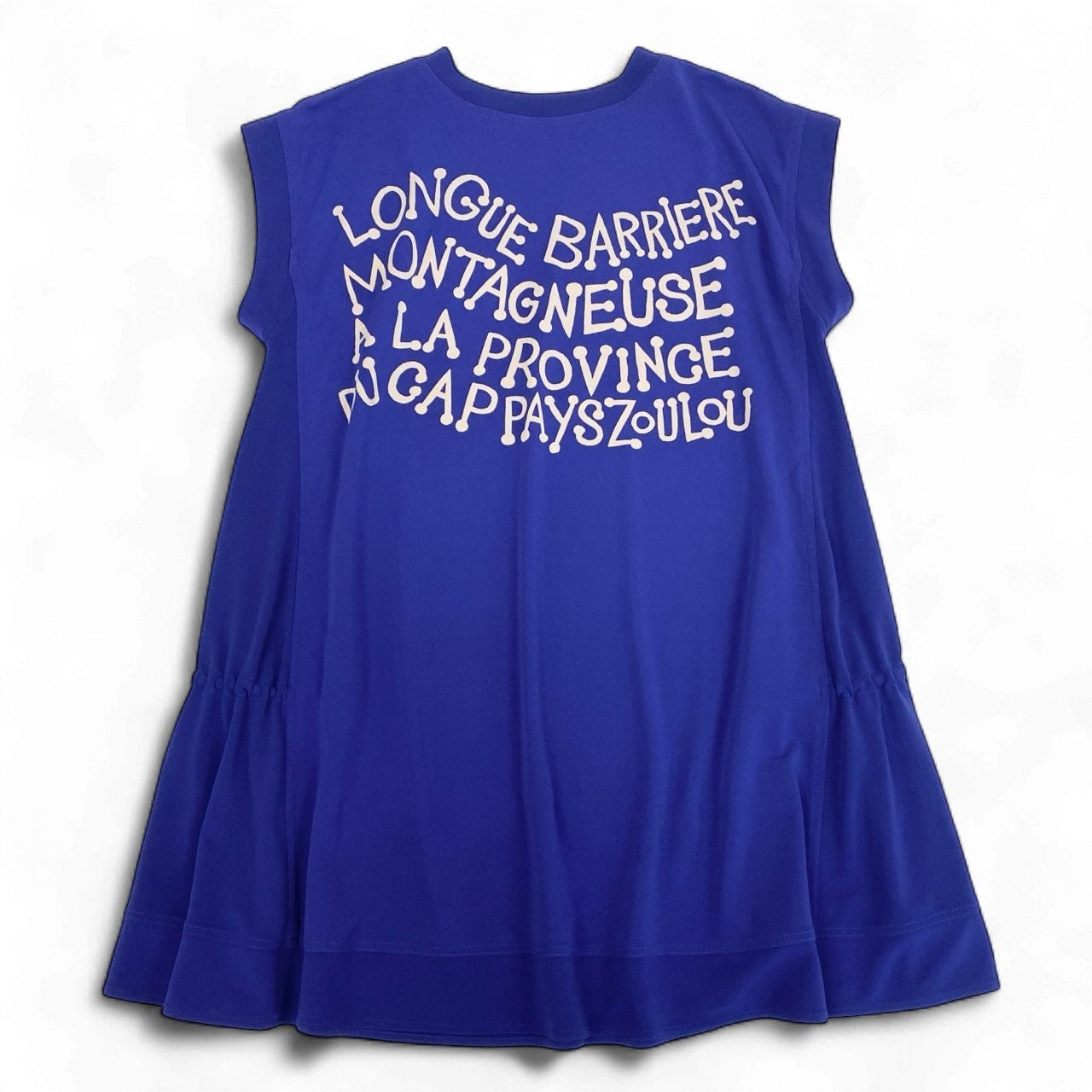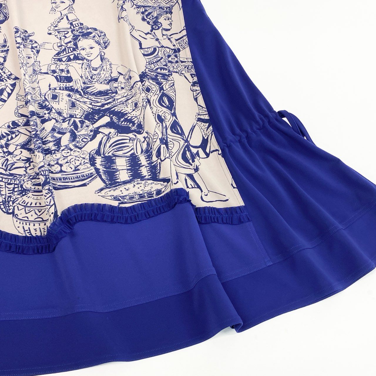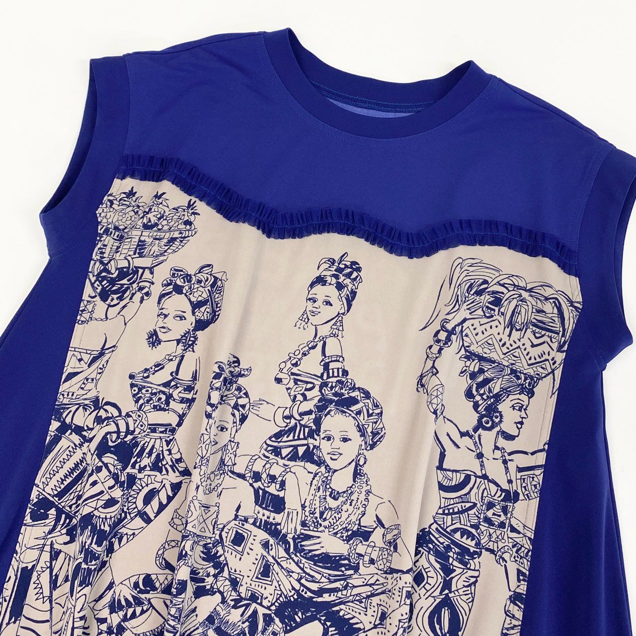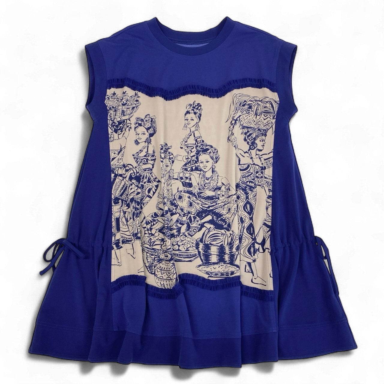 鮮やかなロイヤルブルーに、ベージュ地の民族テイストのアートプリントを組み合わせた、TOKUKO 1er VOL らしい存在感ある半袖チュニックです。フロントには精緻な人物イラストが描かれ、胸元には細かなプリーツディテールを施したデザイン性の高い一着。サイドのドローストリングによりシルエット調整ができ、気分やスタイリングに合わせてニュアンスの変化を楽しめます。軽やかな素材感で、デイリー使いからお出かけシーンまで幅広く活躍します。