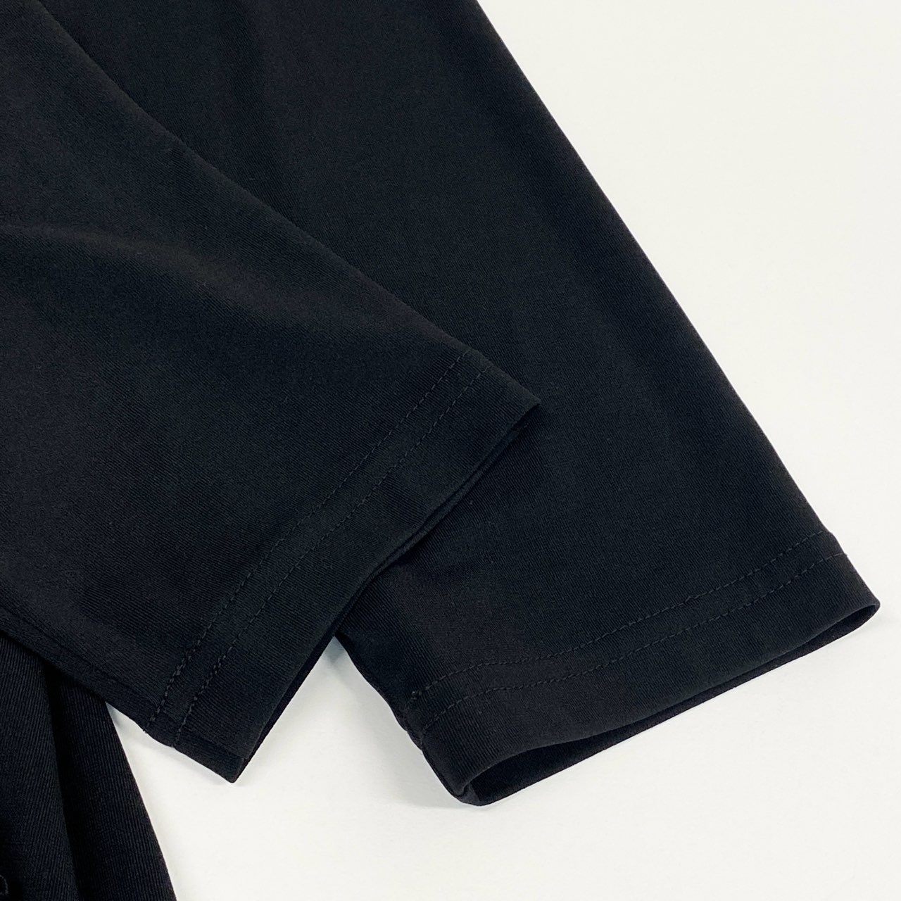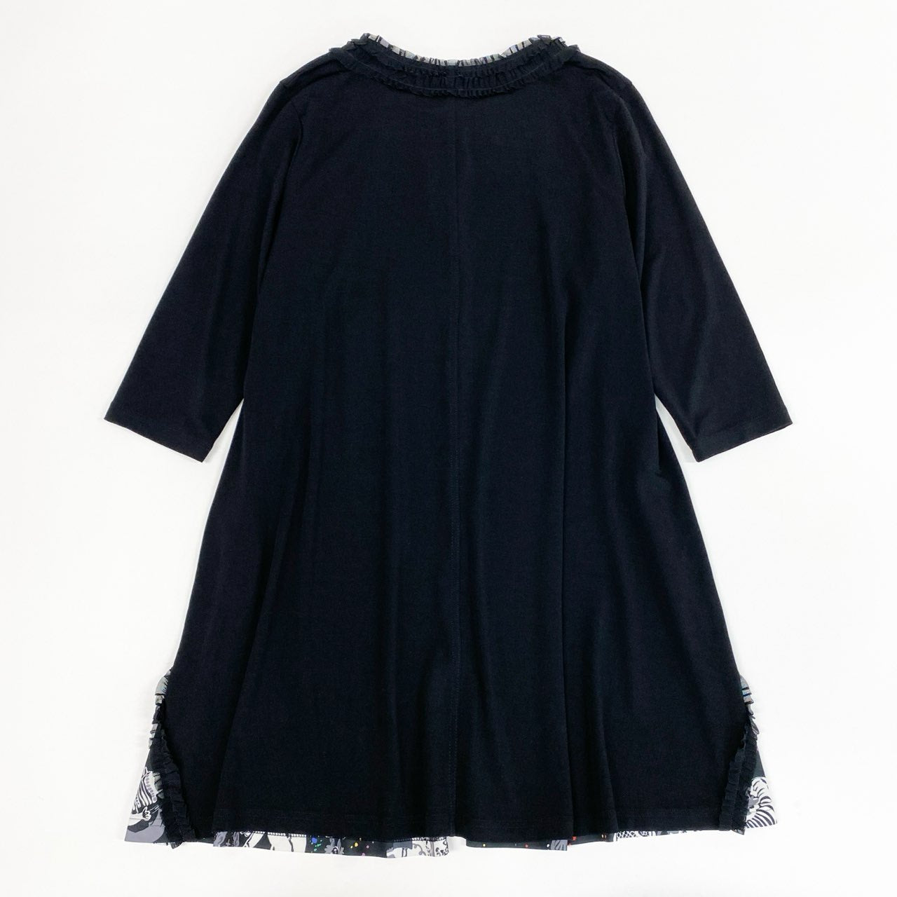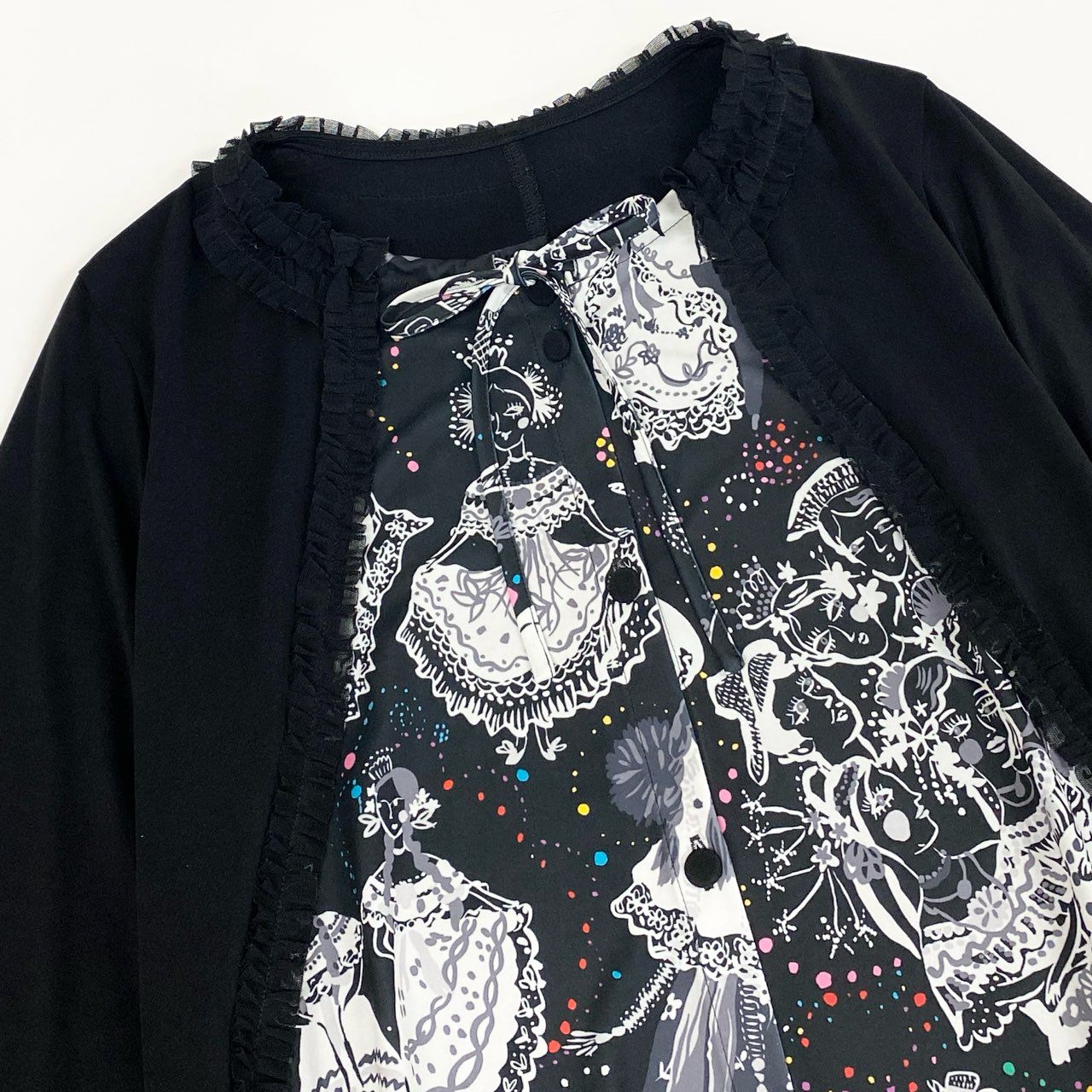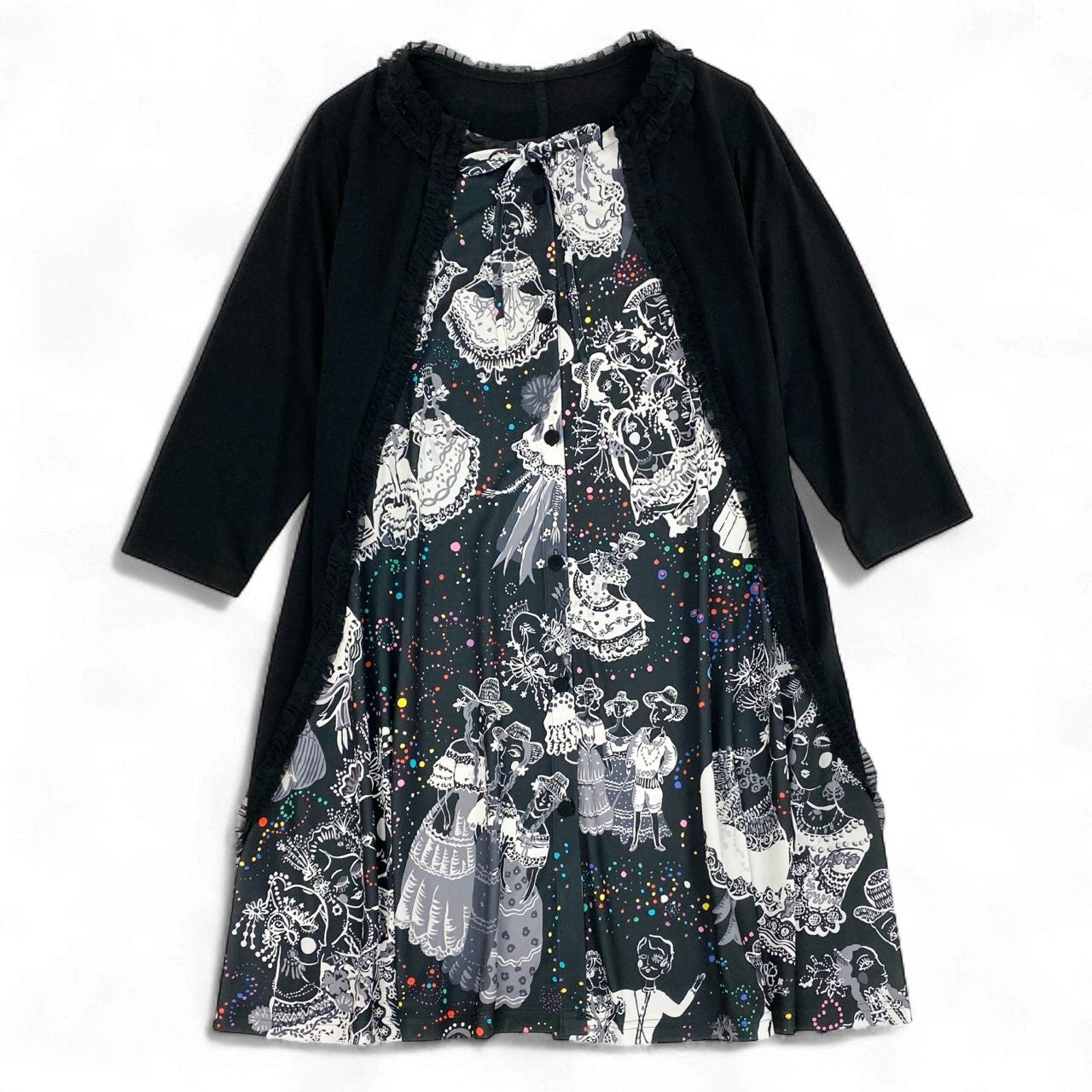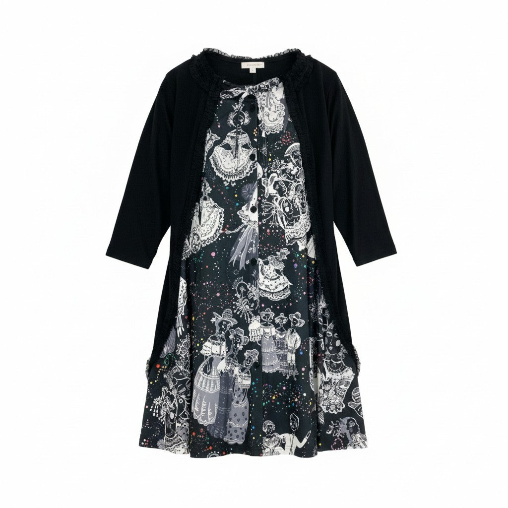ブラックベースにホワイトのイラスト柄を大胆に描いた、TOKUKO 1er VOLらしいアート性の高いロングワンピースです。柔らかいカットソー素材と落ち感のある生地を組み合わせ、快適な着心地と美しいドレープを両立。七分袖のブラックカーディガン風デザインが一体化しており、フロントのリボンディテールがアクセントになっています。日常のお出かけから特別なシーンまで、一枚で華やかさを演出できるアイテムです。