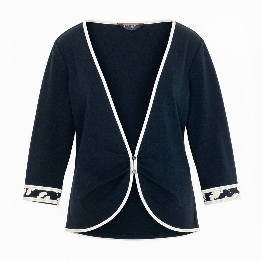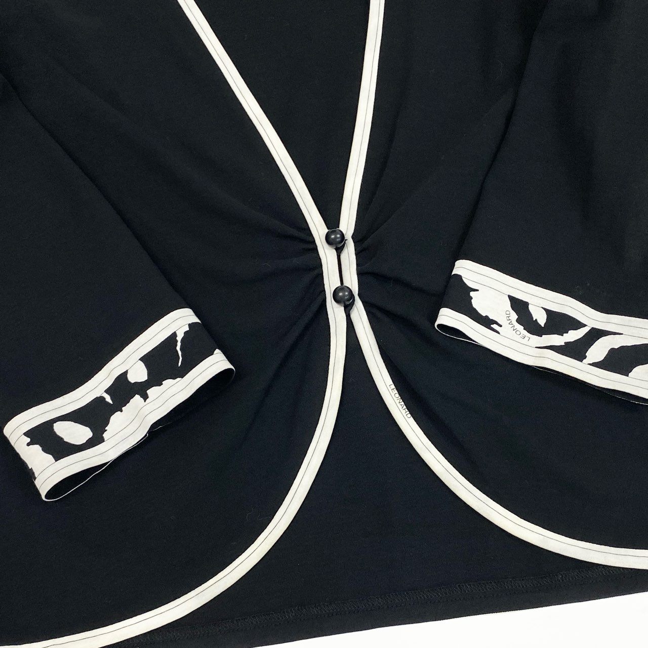 レオナールのレディースカーディガンです。落ち着いたブラック基調のモノトーンカラーに、縁取りのホワイトパイピングが映える上品なデザイン。フロントのくるみボタンと袖口にさりげなく施された柄切り替えディテールがブランドらしいアクセントです。素材はマットなコットン素材で、ロングシーズン着用しやすく、オン・オフ問わず活躍します。