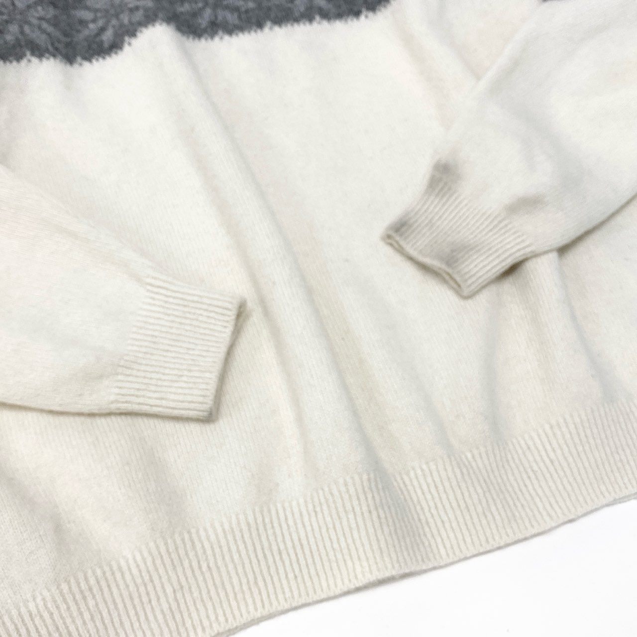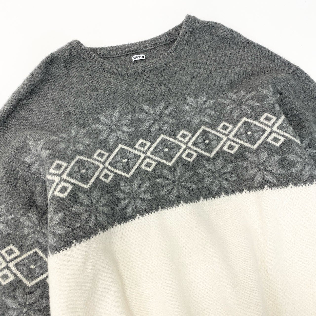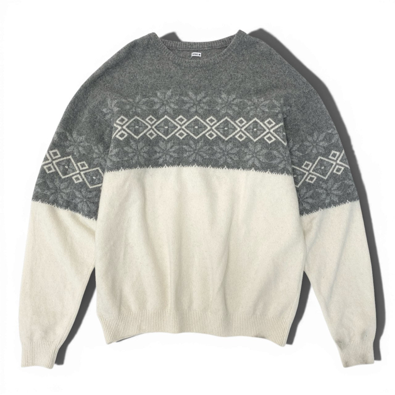 グレーメランジ×アイボリーホワイトの切替デザインに、ノルディック調の雪柄・ダイヤ柄をあしらったクラシカルな一着。落ち着いたミッドグレーと温かみのあるアイボリーの配色が上品な印象を与えます。 ふんわりと起毛感のあるウール調ニット素材で、柔らかく暖かみのある質感。袖口・裾はリブ仕様でシルエットを程よく引き締めます。 ゆったりとしたサイジングでトレンド感のある着こなしが可能。 デニムやスラックスと合わせた冬のカジュアルスタイルにおすすめのノルディックニットです。