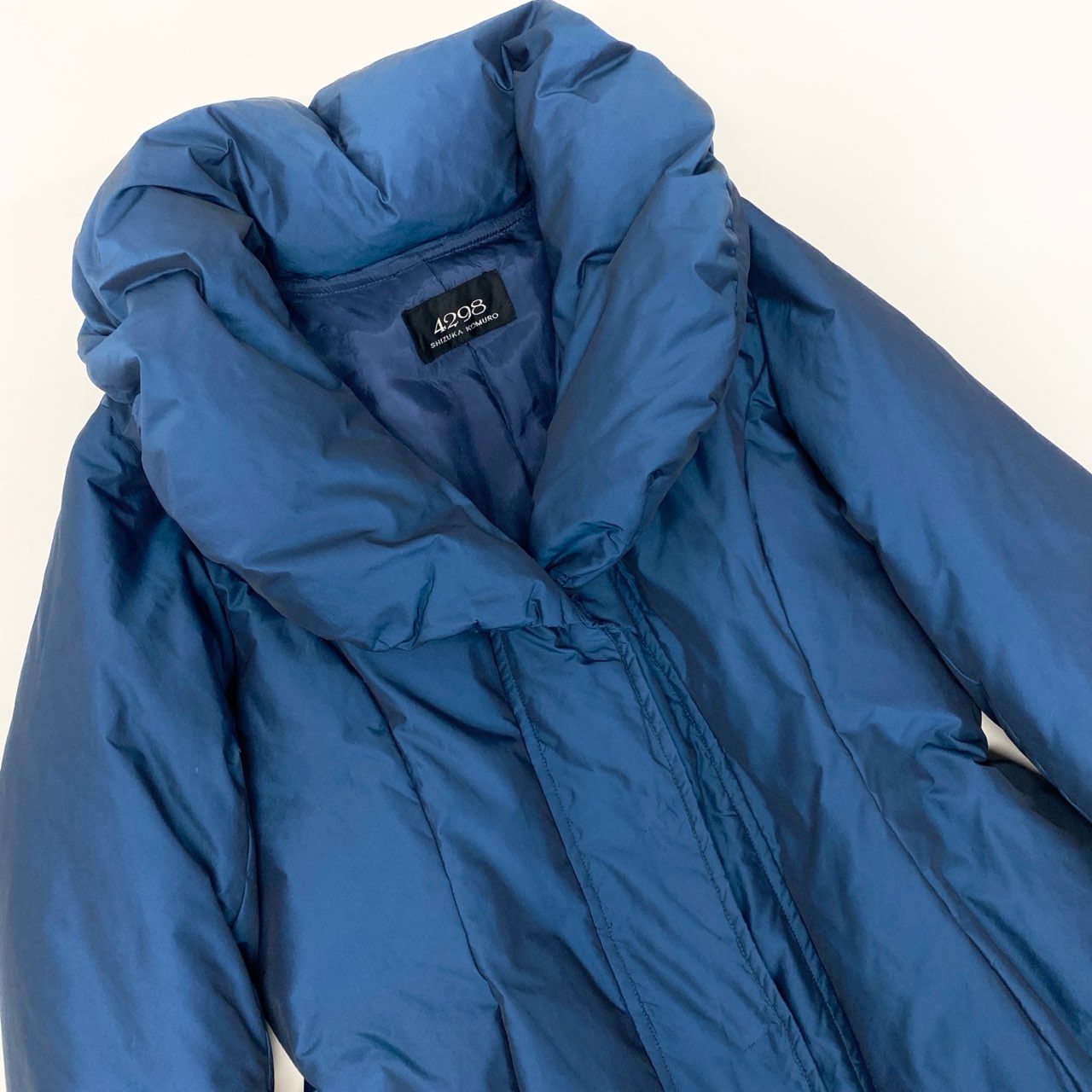 深みのあるディープブルーに、裾周りへ立体的なロゼット風フラワーモチーフをあしらった、SHIZUKA KOMUROらしいエレガントなダウンコートです。素材はほんのりと光沢のあるナイロンで、軽さと上品さを兼ね備えた仕上がり。大きく立ち上がるボリュームカラーが首元を暖かく包み、小顔効果も期待できます。華やかさがありつつも品のあるデザインで、冬のお出かけ・旅行・特別なシーンにも活躍。1枚で主役になる、女性らしさ溢れるアイテムです。