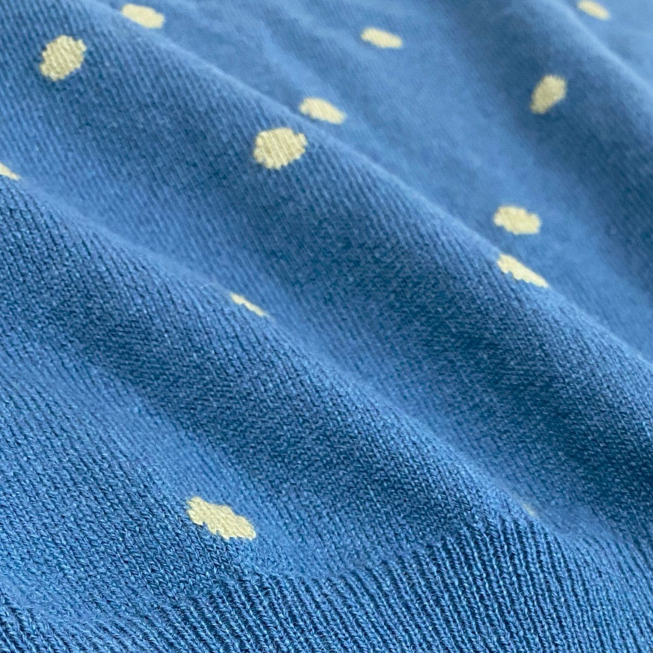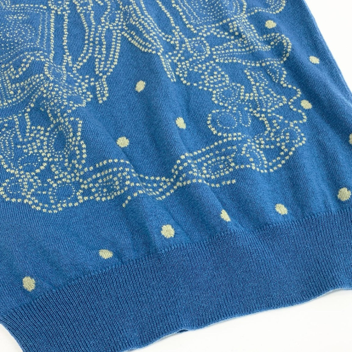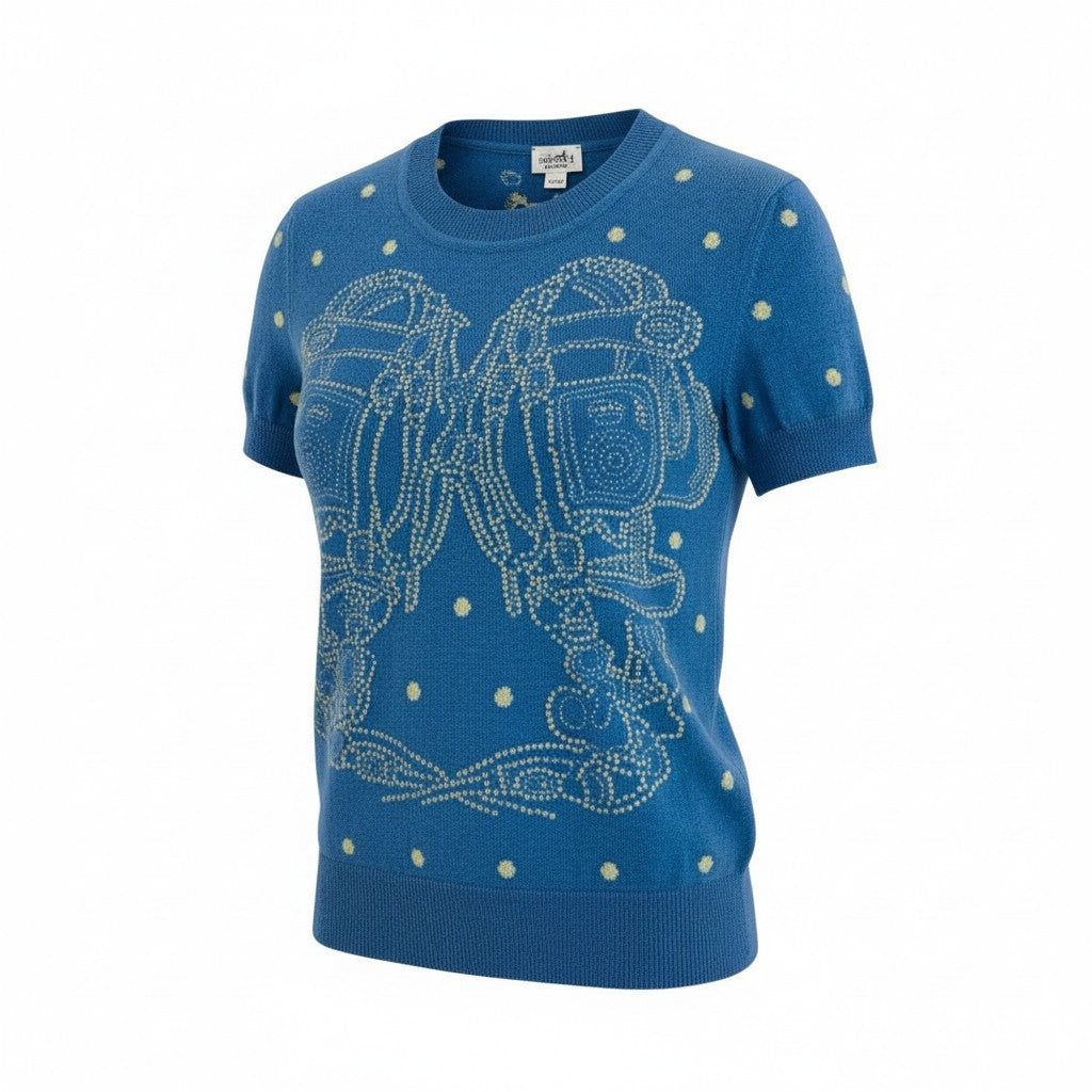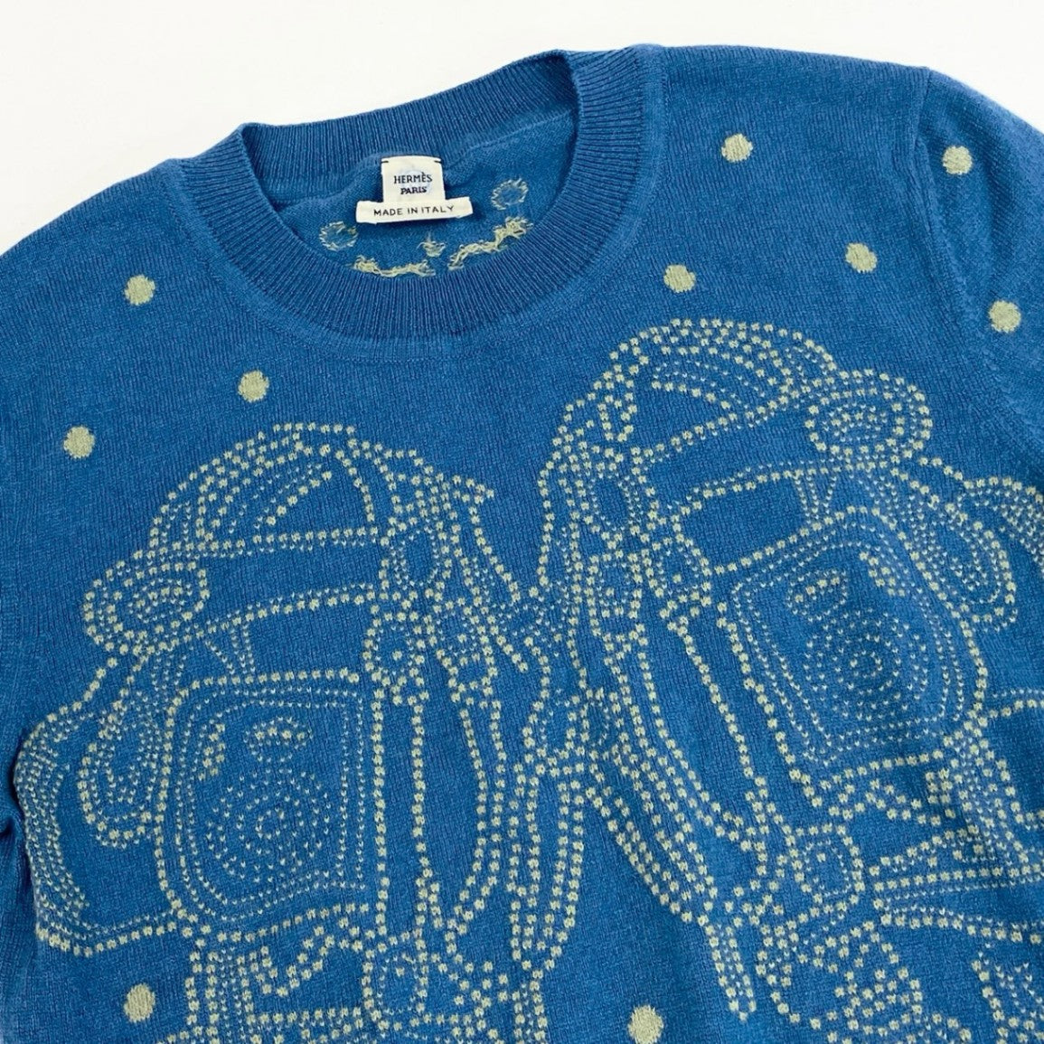 鮮やかなブルー系カラーに、エルメスを象徴する**「BRIDES DE GALA(ブリッド・ドゥ・ガラ)」モチーフをドット調で表現した上品な半袖ニットです。素材はカシミヤブレンド**で、なめらかで柔らかく、肌触りの良さが際立ちます。総柄ながら落ち着きがあり、デニムやスラックス、スカートまで幅広く合わせやすい一枚です。春夏は1枚で、秋口はジャケットのインナーとしても活躍します。