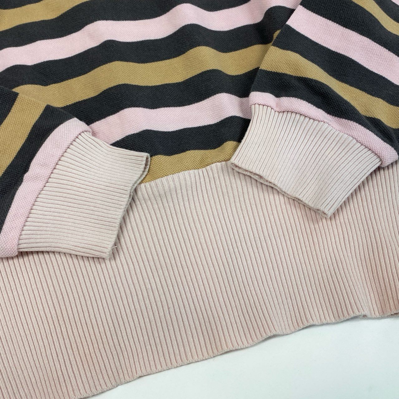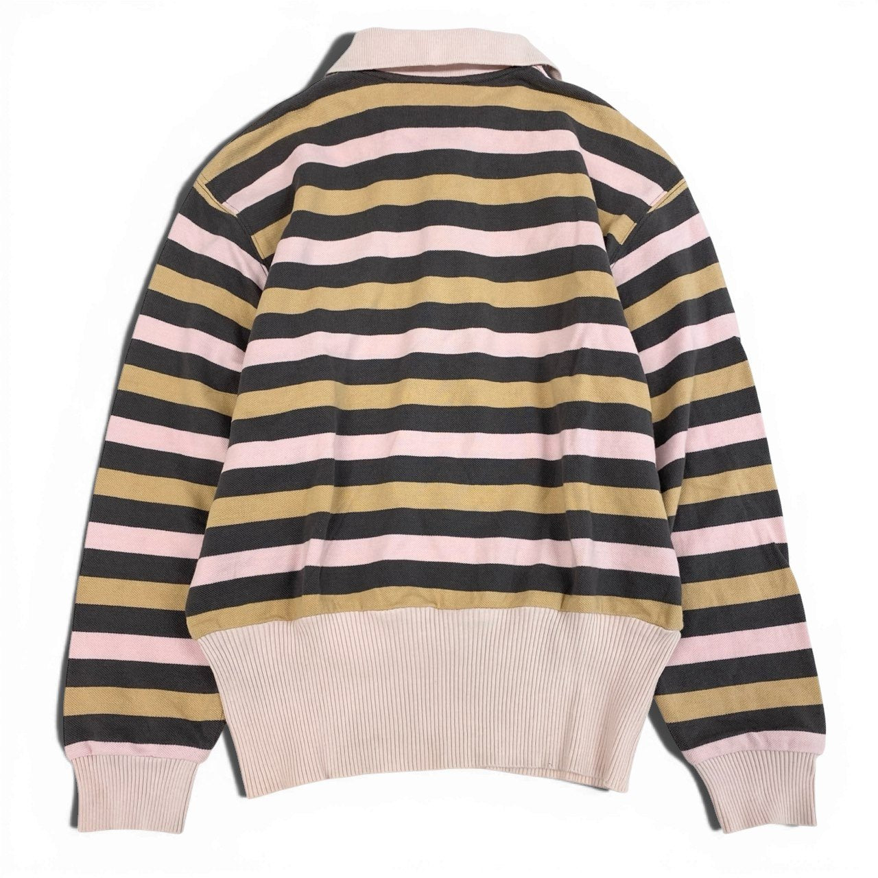 ブラック・ベージュ・ペールピンクの配色が上品な、ヴィンテージ クリスチャンディオールの長袖ポロシャツです。マットなコットン素材に、太めピッチのボーダー柄がクラシカルな雰囲気を演出します。胸元にはエンブレムロゴワッペンが配され、ブランドらしい存在感をプラス。デニムやスラックスと合わせたきれいめカジュアルから、ヴィンテージライクなコーディネートまで幅広く楽しめる一着です。