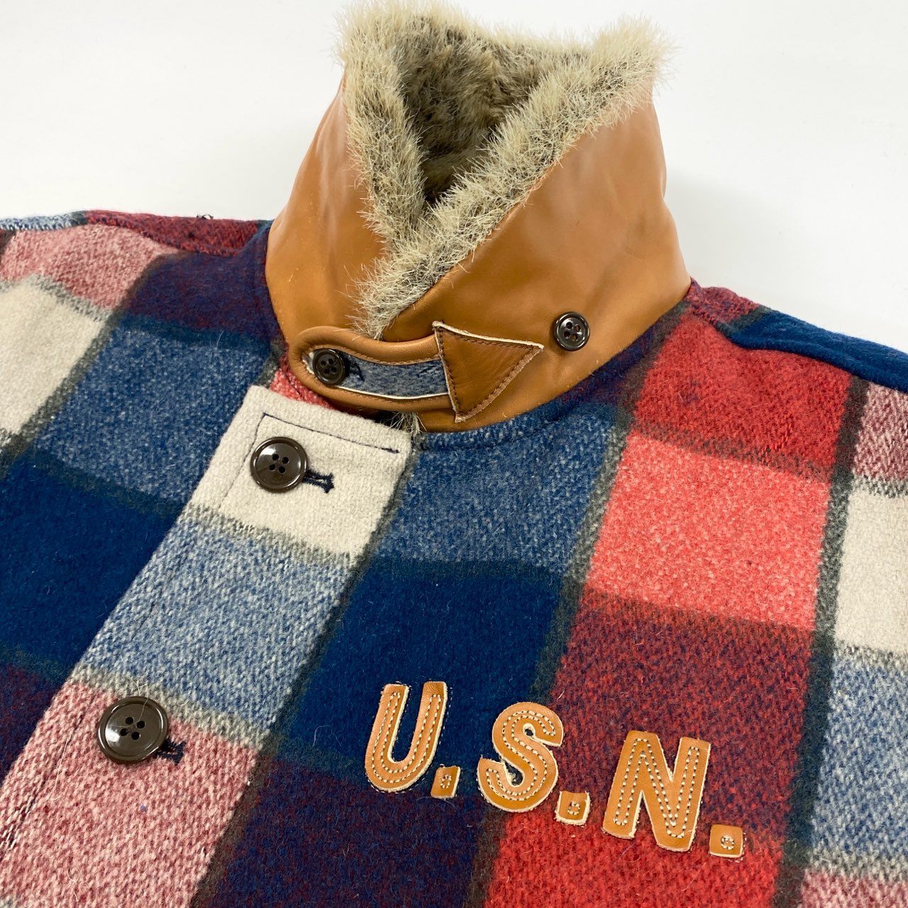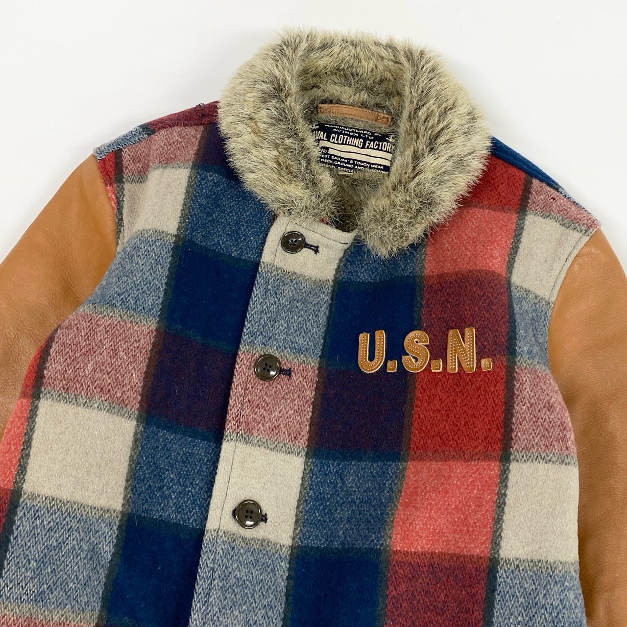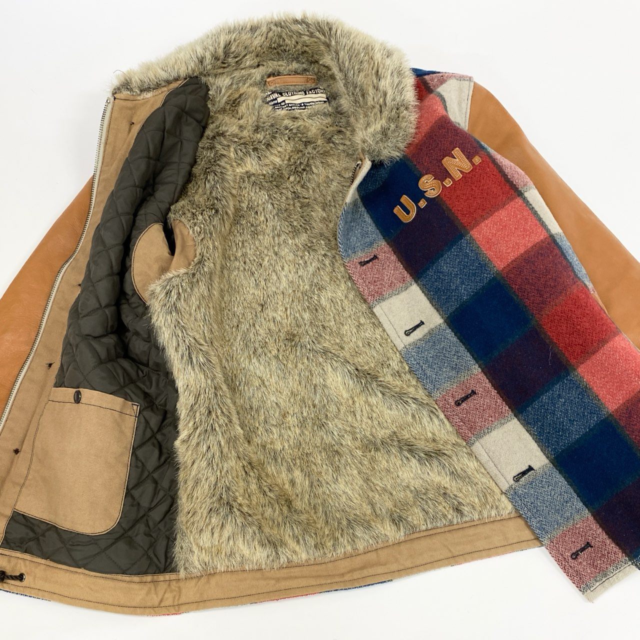 アヴィレックスの「6132040」N-1タイプ デッキジャケット。レッド×ネイビー×ベージュの大判チェック柄ボディに、キャメルブラウンのレザー袖を組み合わせた存在感抜群のデザイン。衿元には毛足の長いフェイクファーを採用し、胸の「U.S.N.」刺繍ロゴがミリタリーテイストを強調します。重厚感のあるウールブレンド素材で保温性にも優れ、街着からアウトドアまで幅広く活躍。無骨さとヴィンテージ感を兼ね備えた一着です。