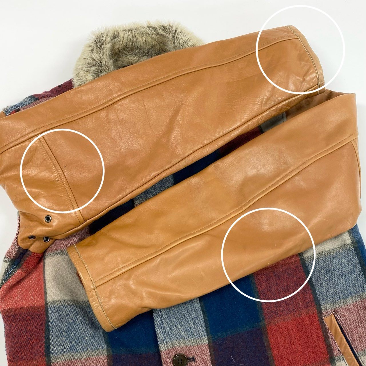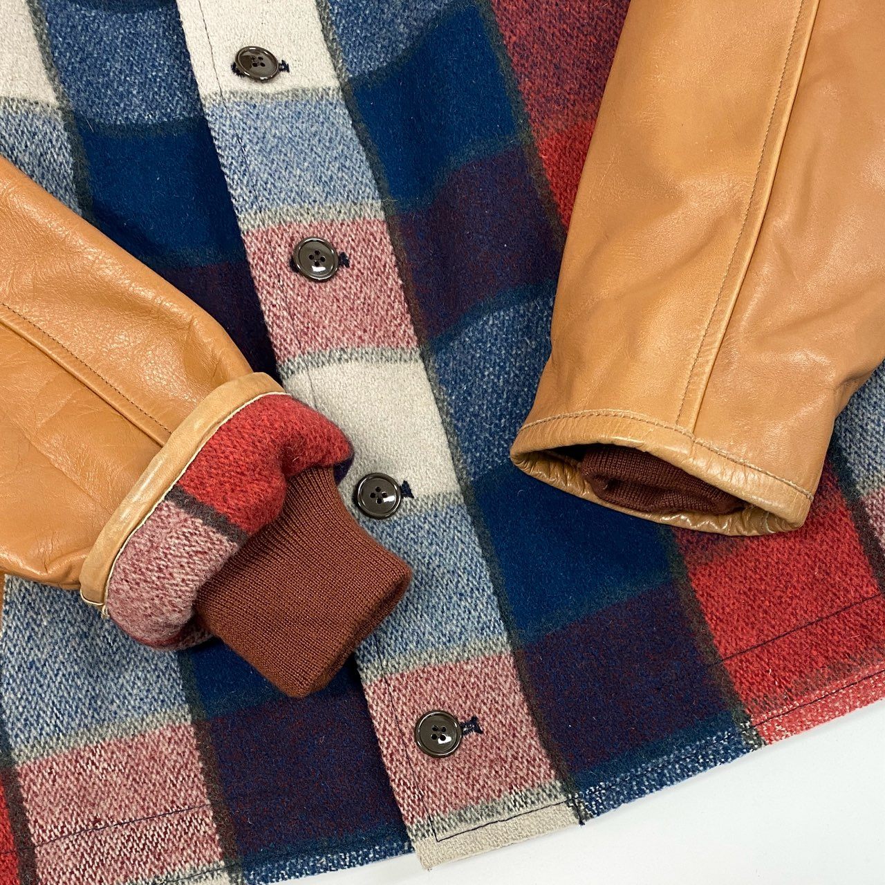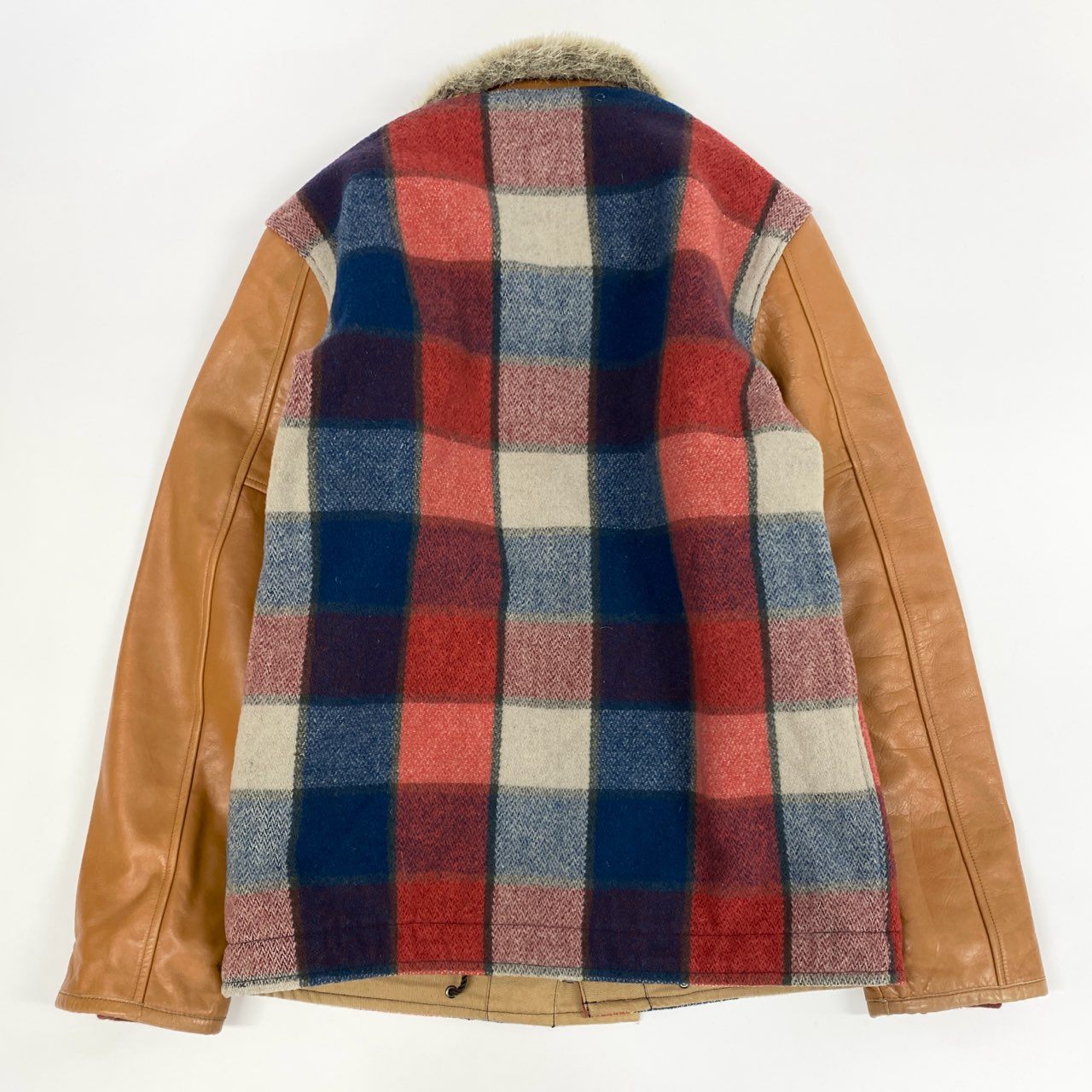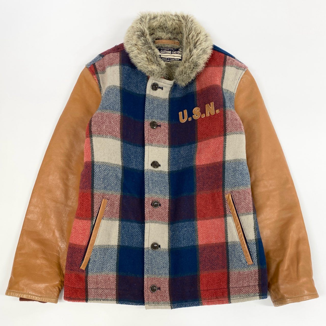 アヴィレックスの「6132040」N-1タイプ デッキジャケット。レッド×ネイビー×ベージュの大判チェック柄ボディに、キャメルブラウンのレザー袖を組み合わせた存在感抜群のデザイン。衿元には毛足の長いフェイクファーを採用し、胸の「U.S.N.」刺繍ロゴがミリタリーテイストを強調します。重厚感のあるウールブレンド素材で保温性にも優れ、街着からアウトドアまで幅広く活躍。無骨さとヴィンテージ感を兼ね備えた一着です。