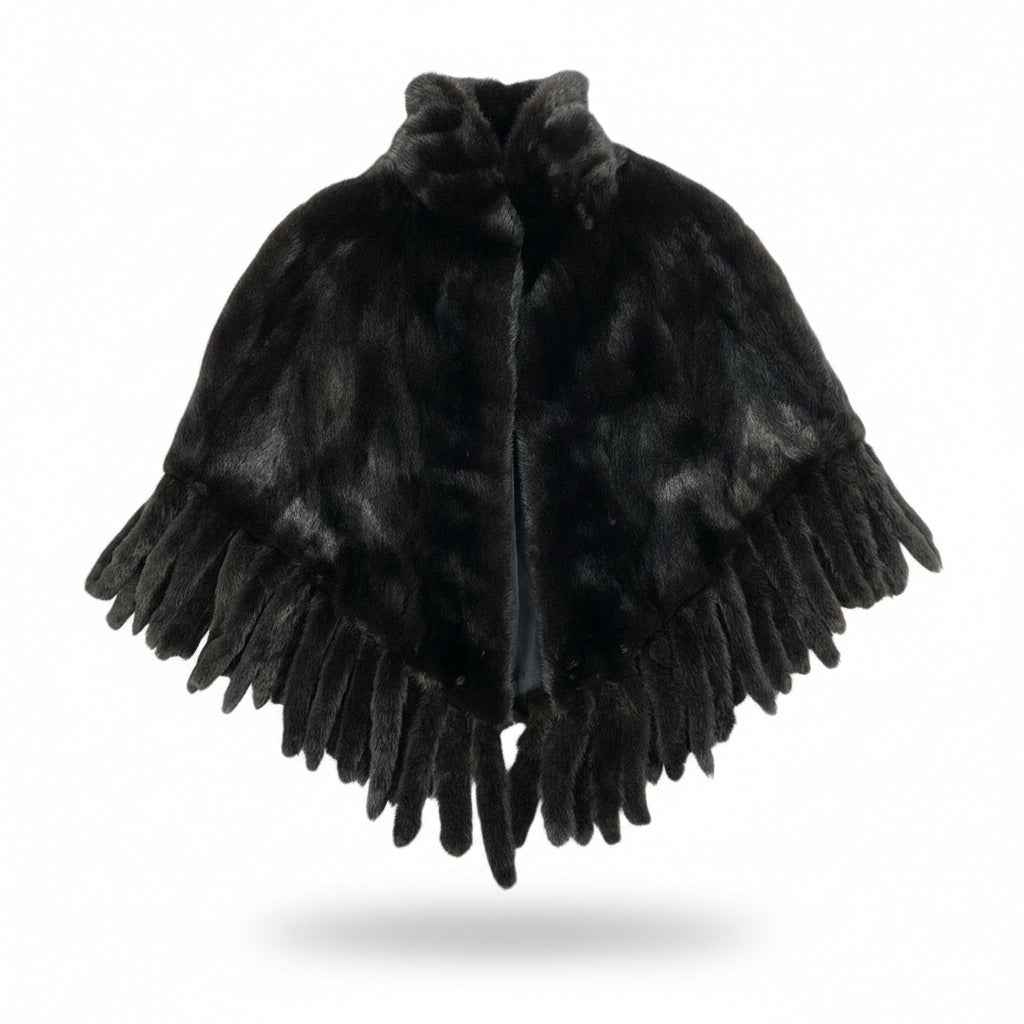 深みのあるブラック系カラーが印象的な、Black Jewelのダークミンク毛皮ポンチョです。毛足のそろったミンク特有のなめらかな触り心地と、上品な自然光沢が高級感を演出します。裾に広がるフリンジ調のカッティングが動きを出し、エレガントで存在感のあるデザインです。ドレススタイルやきれいめコーデのアクセントとして、またさっと羽織れる冬の主役アイテムとして活躍します。