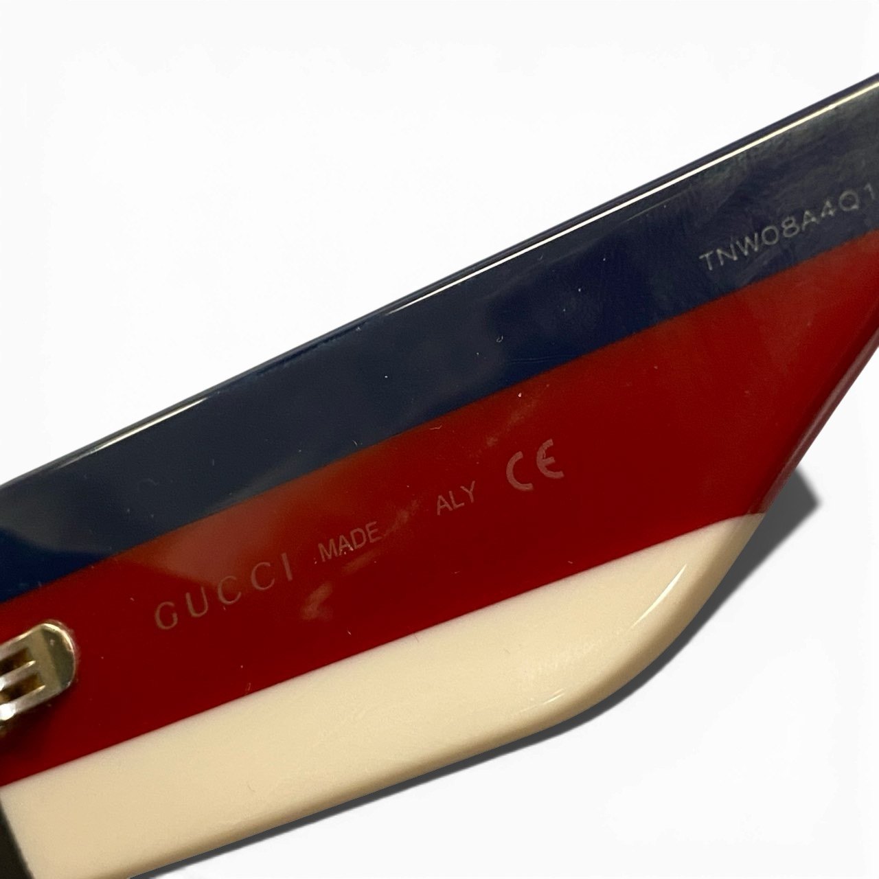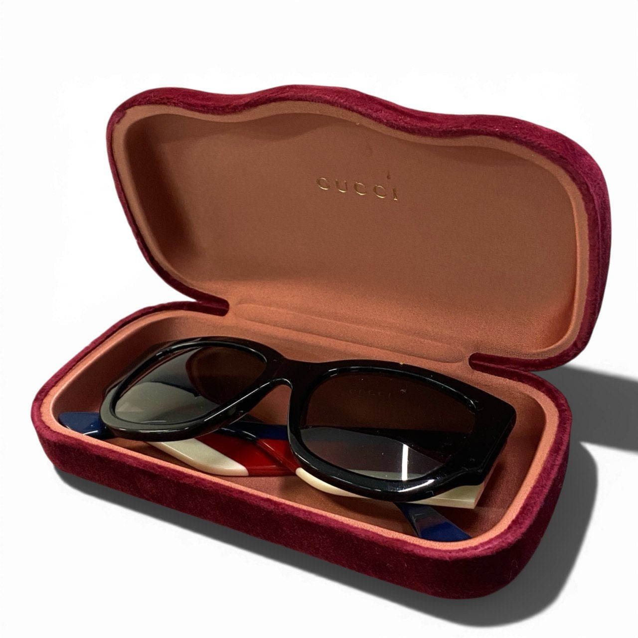 艶感のあるジェットブラックのアセテートフレームに、スモークグレーのグラデーションレンズを組み合わせたグッチのサングラスです。テンプルにはネイビー×レッド×ベージュのトリコロール配色を施し、ゴールドの立体GGメタルロゴが存在感を放ちます。厚みのあるフレームがモードで力強い印象を演出し、横顔までラグジュアリーに仕上げてくれるデザイン。デイリーコーデのアクセントからリゾートスタイルまで映える一本です。