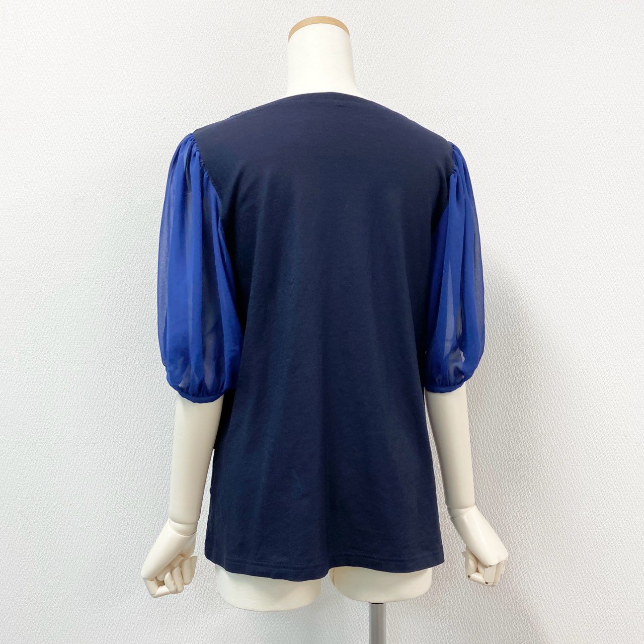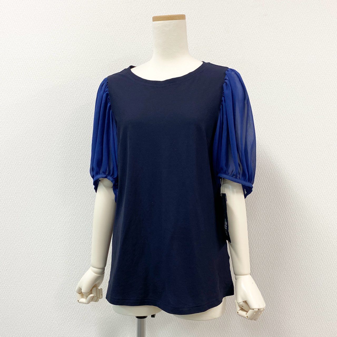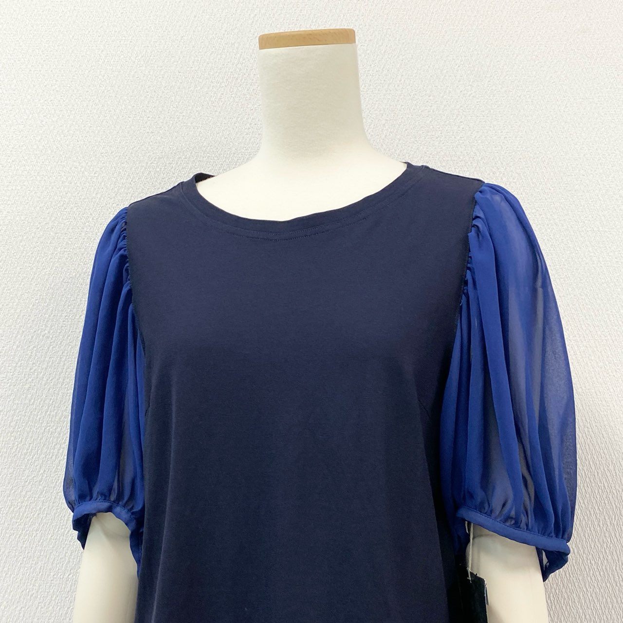 71h3《未使用保管品》タグ付 TOKUKO 1er Vol トクコプルミエヴォル 日本製 シフォン素材切替 パフスリーブ 半袖カットソー 9 Mサイズ ネイビー レディースo07t