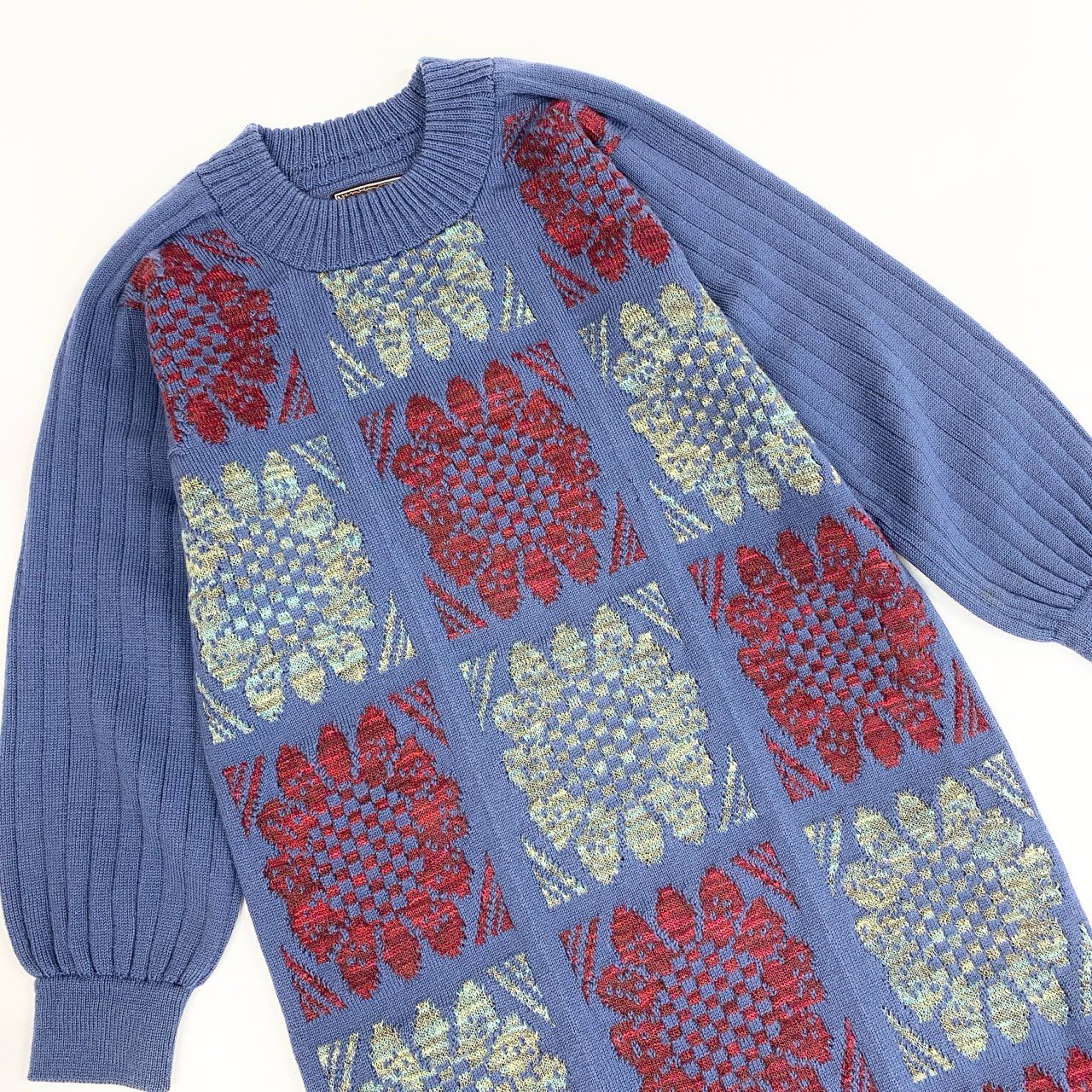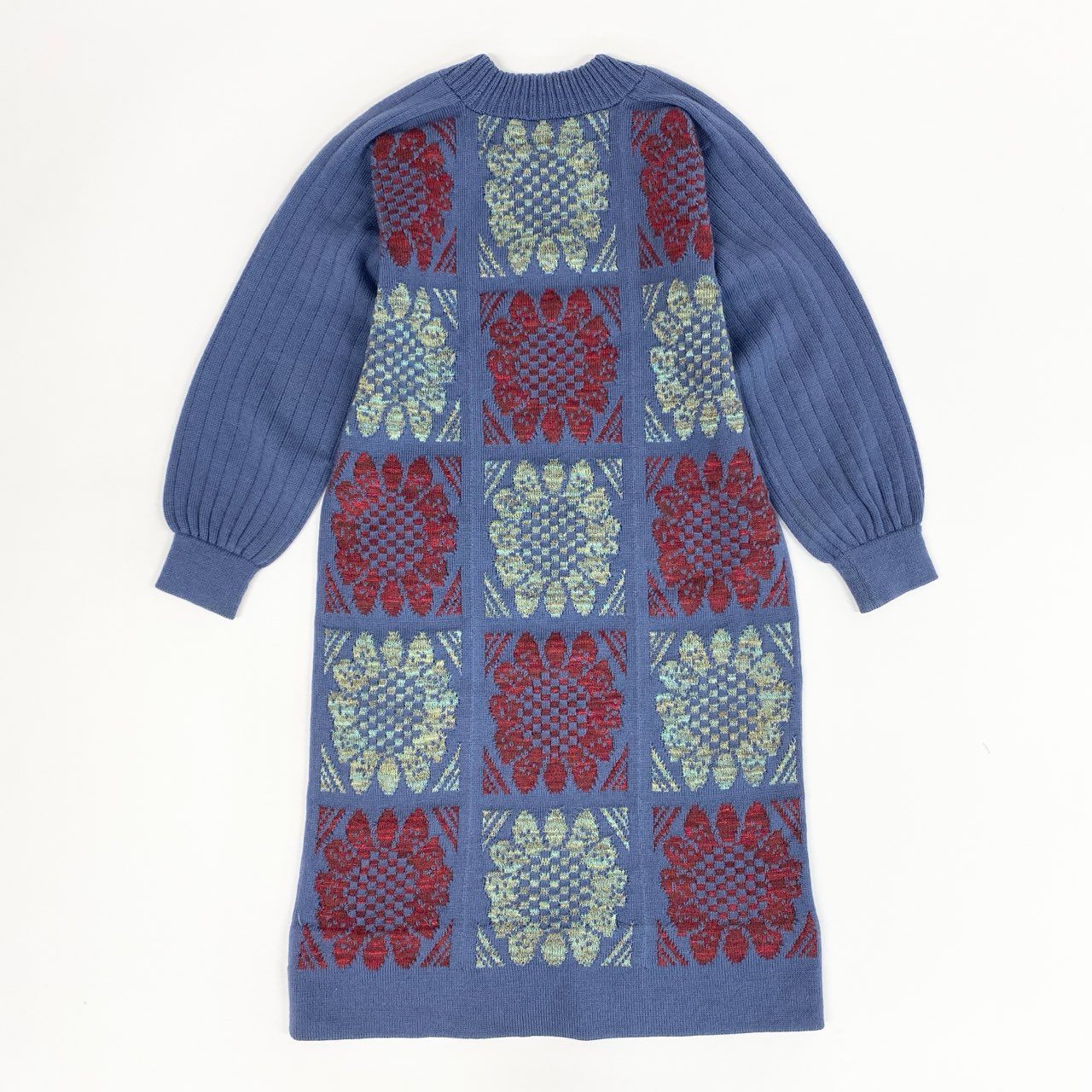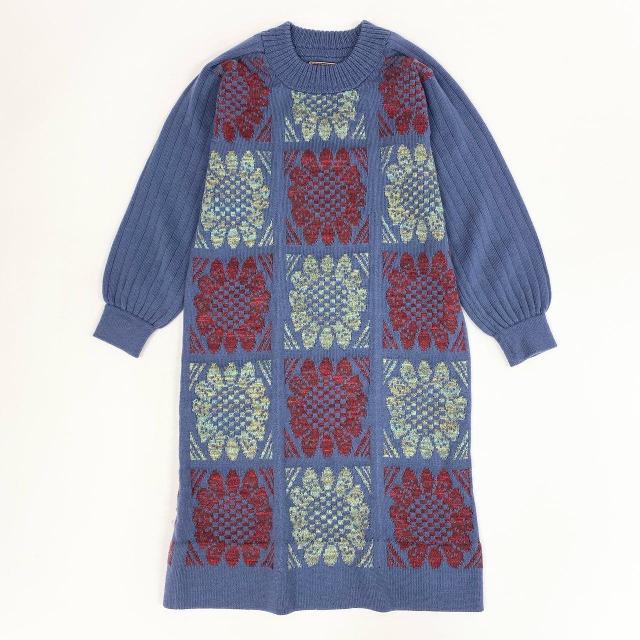 ブルーを基調に、ボルドーレッドとライトグリーンのフラワーモチーフ調パターンがパネル状に並んだ華やかな総柄ニットワンピースです。マットな風合いのニット素材に、ボリューム感のあるリブ袖がアクセントを加えています。落ち着きあるブルーとマルチカラーの組み合わせが印象的で、1枚でコーディネートの主役になります。秋冬のデイリー使いからちょっとしたお出かけシーンまで、幅広く活躍するアイテムです。