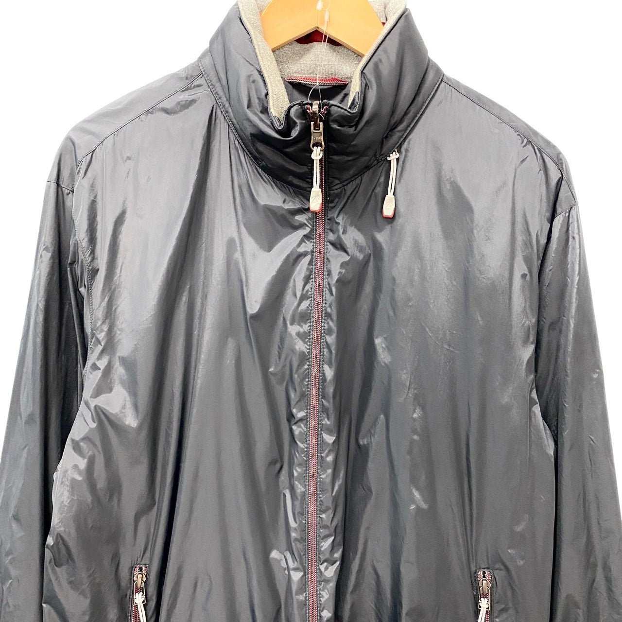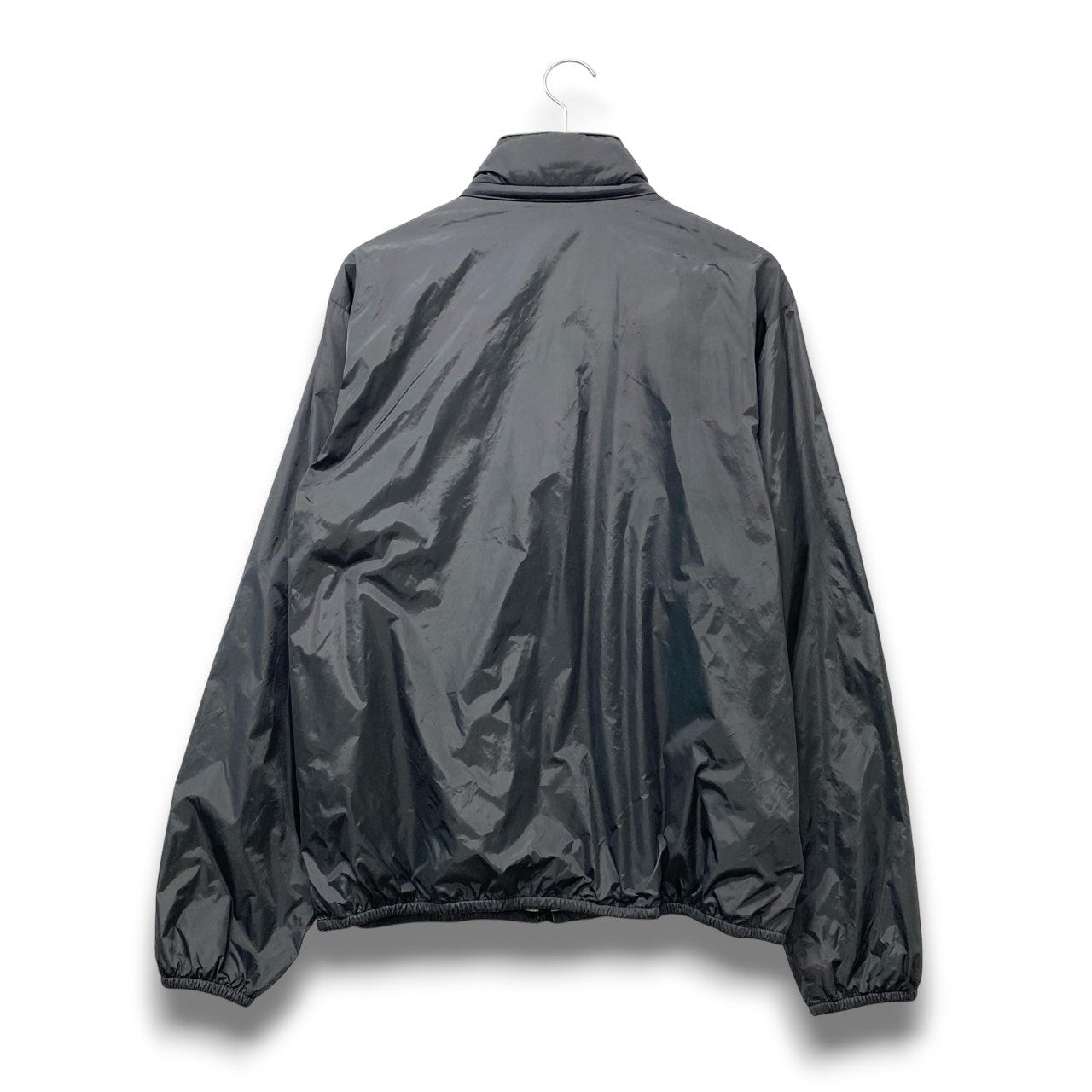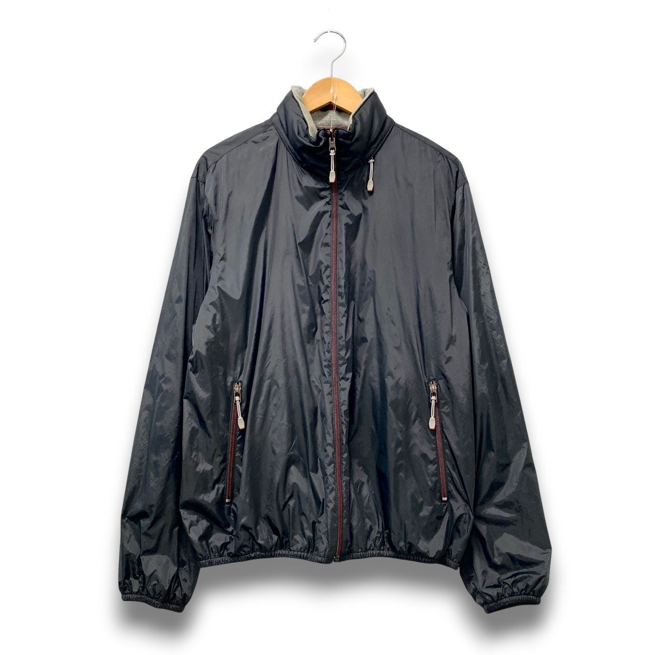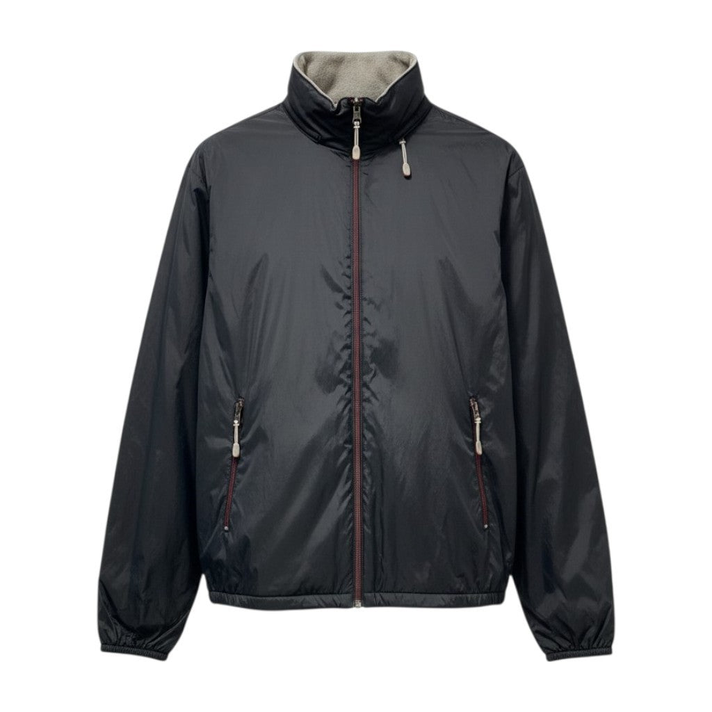 ダークチャコールネイビーの光沢あるナイロン面と、内側にライトグレーフリースを配したリバーシブル仕様のジャケットです。 マットと微光沢のコントラストが上品で、ジップやドローコードなどスポーティなディテールも洗練された印象。 シンプルな無地デザインで、ビジネスカジュアルにも合わせやすい一着です。 季節の変わり目のライトアウターとして、通勤から週末スタイルまで幅広く活躍します。
