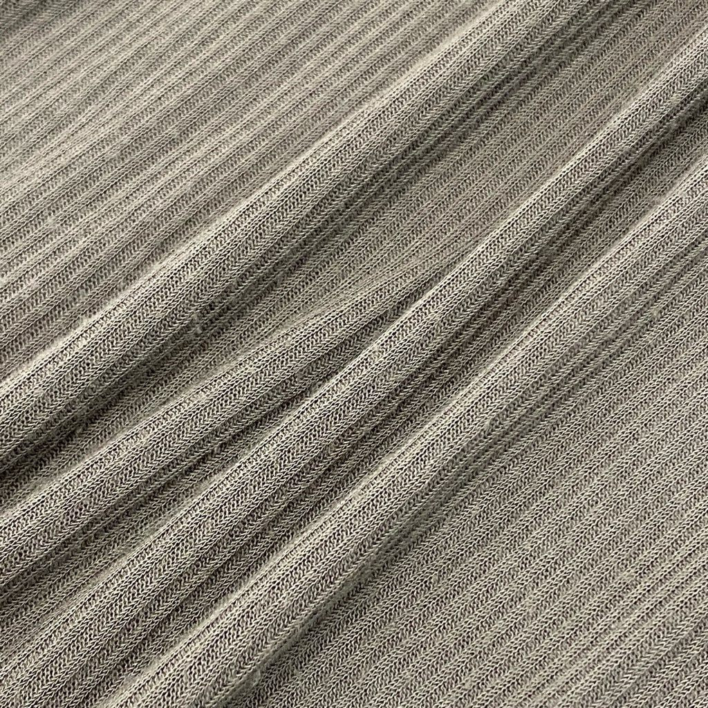 Rick Owensらしいミニマルかつ前衛的な雰囲気が際立つ、リブ仕様のロングカットソーです。カラーはオリーブブラウン〜カーキ系で、無地ながら縦畝リブが陰影のある表情を演出します。シルク混の薄手素材で、やや透け感のあるマットで繊細な質感が特徴です。ロングスリーブと縦長シルエットにより、単体でもレイヤードでも映える一着で、モード・ダークトーンコーデの軸として活躍します。