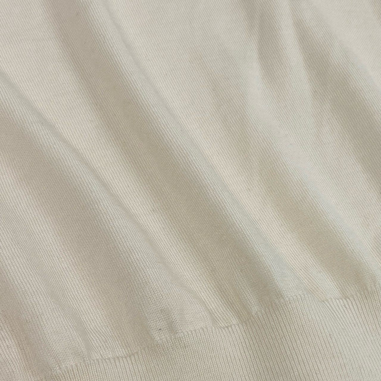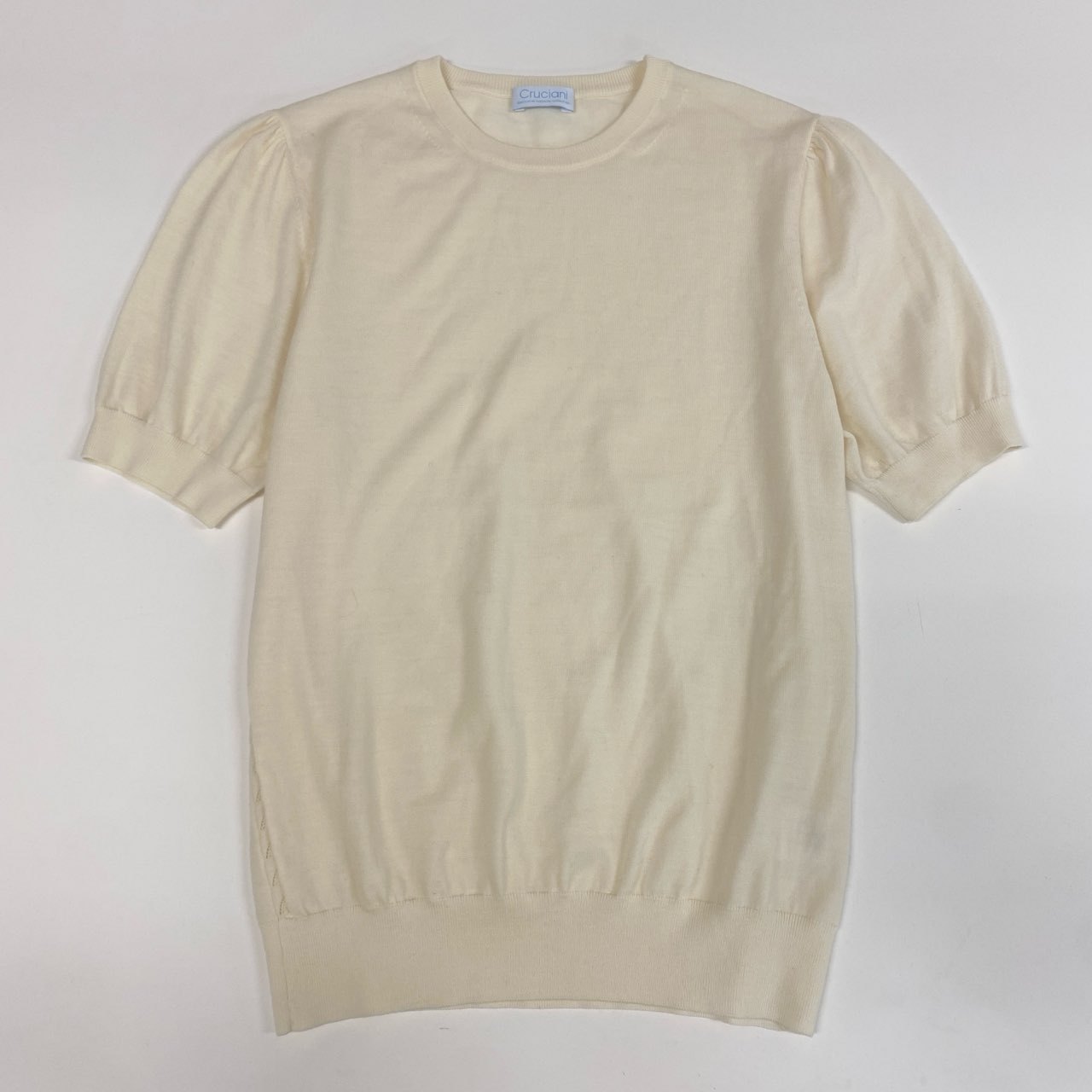 柔らかなアイボリーカラーが上品な印象のクルチアーニの半袖ニット。ウール100%の薄手素材で、しなやかな肌触りと軽やかな着心地が魅力です。パフスリーブ調の袖デザインがさりげないフェミニンさを演出し、1枚でも上質感のあるスタイルに。通勤やお出かけ、春秋のレイヤードスタイルにも最適な汎用性の高い一着です。