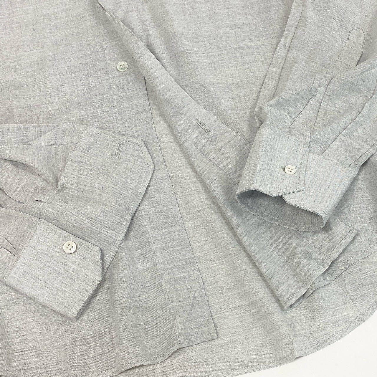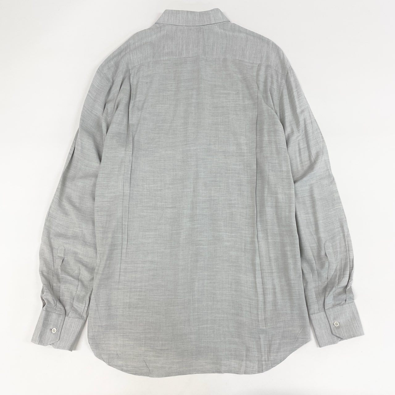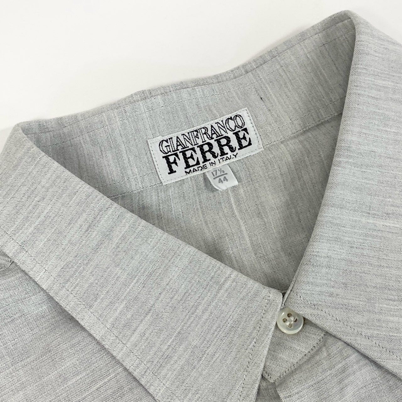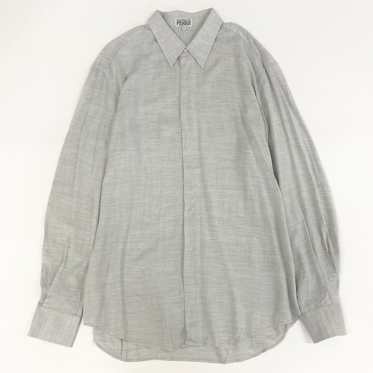 ジャンフランコフェレの長袖シャツ、ライトグレーの落ち着いたカラーにレーヨン特有のテロっとした素材感が映えるヴィンテージアイテムです。90s〜00sのオールドフェレらしいオーバーサイズデザインで、独特の抜け感とモードな雰囲気を楽しめます。比翼仕立てでフロントはすっきりとした印象に仕上がり、羽織りとしても活用可能。ラフに着こなしてストリートやモードスタイルに取り入れやすい一着です。