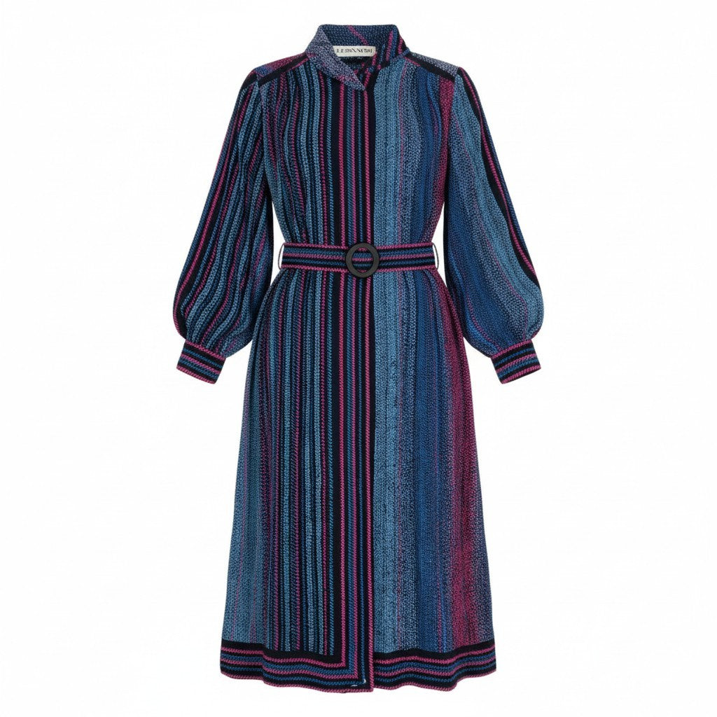 ミッドナイトネイビーをベースに、ターコイズブルーとフューシャピンクの縦ストライプ柄が印象的な一着です。 細やかなドット調ストライプが織り込まれたようなデザインで、視覚的にすっきりとしたラインを演出します。 マットでさらりとしたシルク素材で、軽やかな着心地です。 共布ベルトとラウンドバックルがアクセントとなり、メリハリのあるシルエットを実現。 デイリーからお食事会、秋冬のジャケット合わせまで幅広く活躍する上品なワンピースです。
