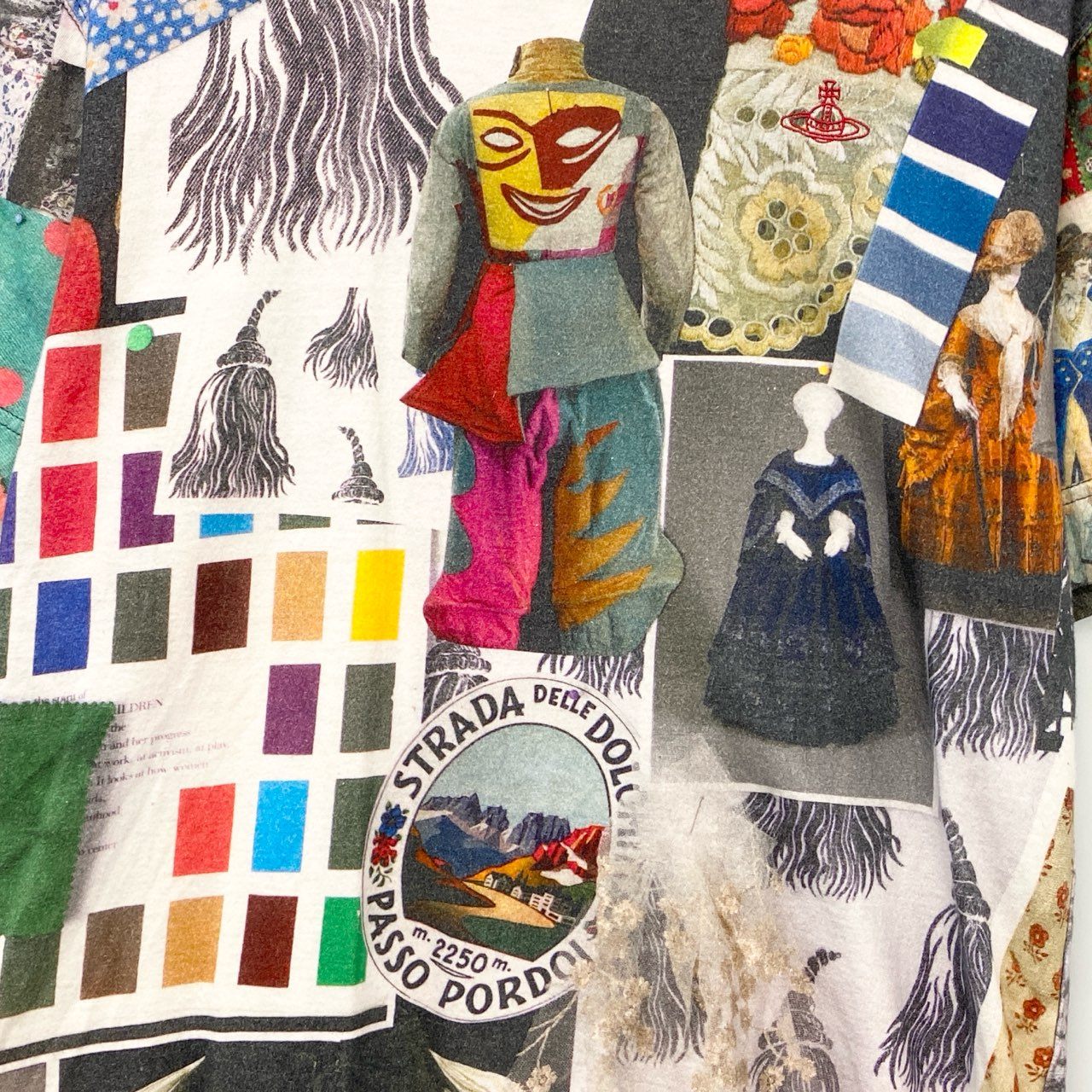 アイボリーベースにレッド・グリーン・ブルーなど多色使いのアートコラージュ柄が全面に施されたデザインです。 絵画や幾何学モチーフを組み合わせたパッチワーク風パターンが、ヴィヴィアンウエストウッドらしい個性的な印象を演出。 やや前後差のある裾デザインが、動きのあるシルエットを作ります。 シンプルなボトムスと合わせるだけで主役級のスタイリングが完成する一着です。