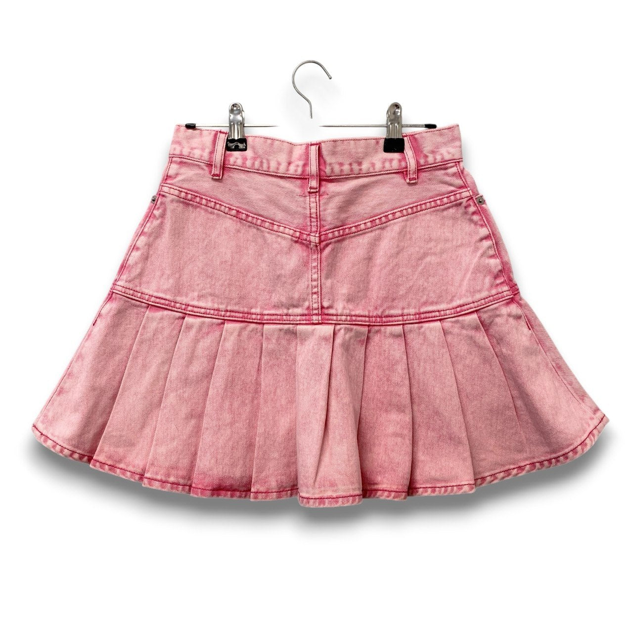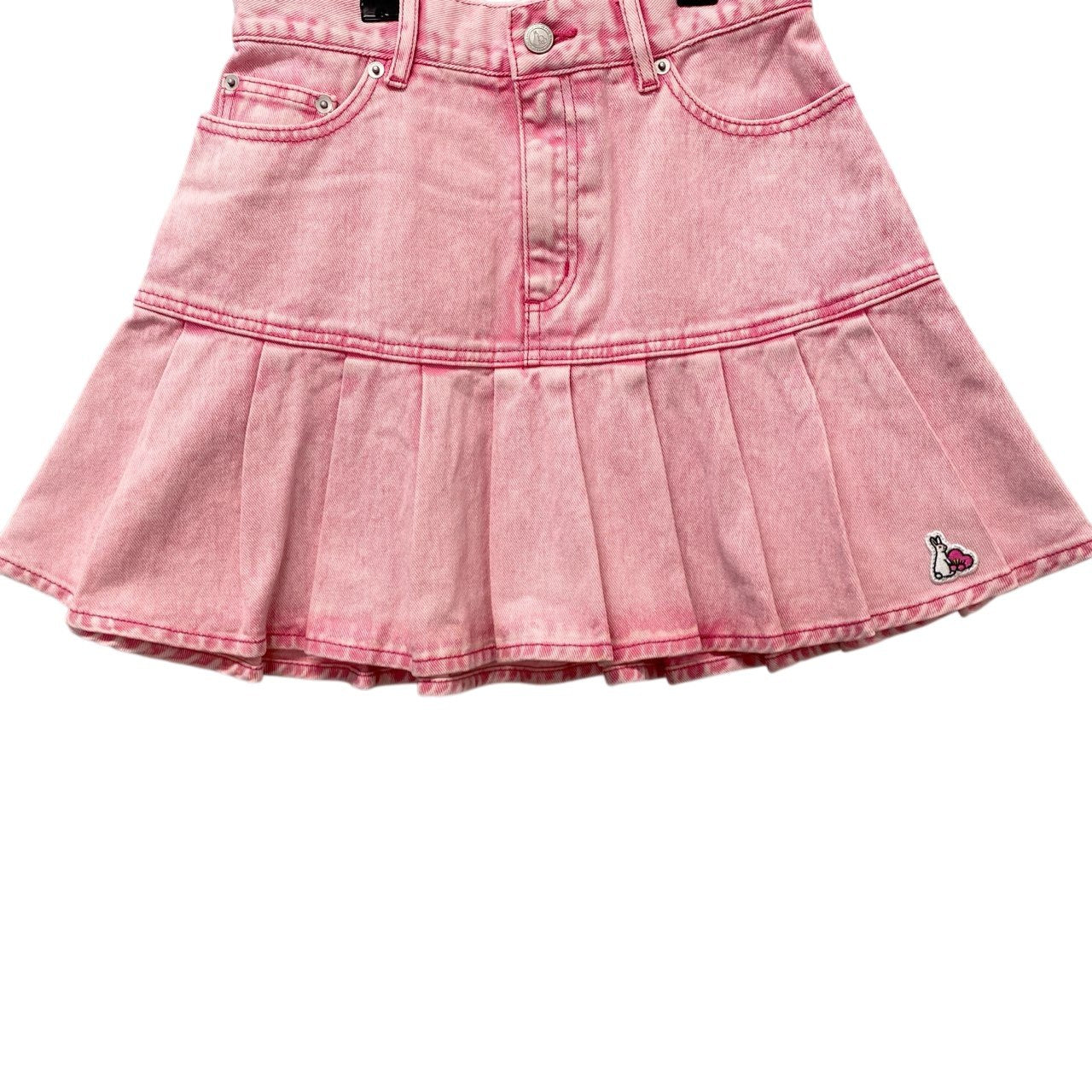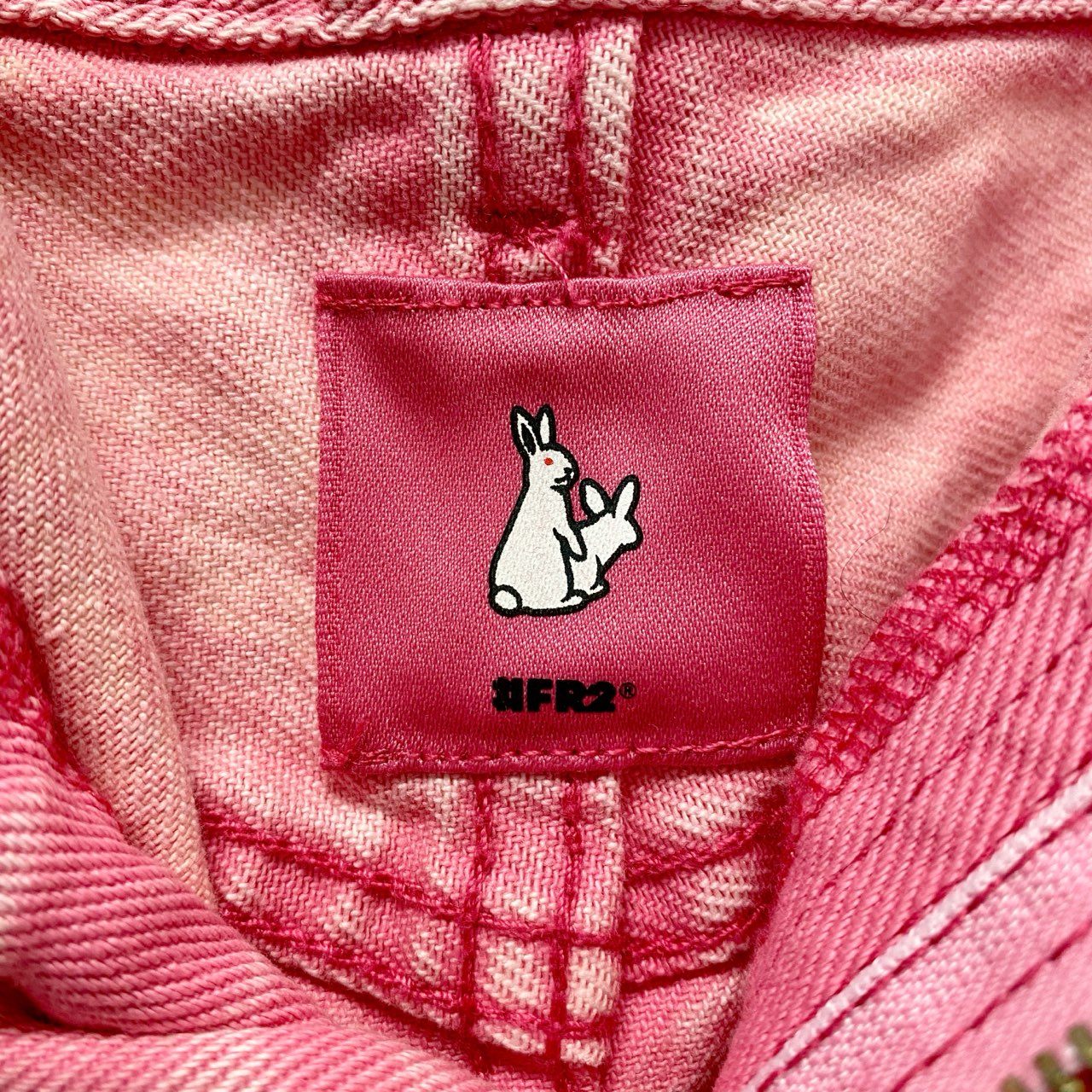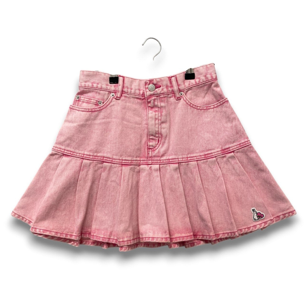 #FR2 のピンクデニムを使用したプリーツミニスカートです。色味はウォッシュ加工のスモーキーピンクで、マットなコットンデニムならではの柔らかな風合いが魅力。フロントのデニムポケットディテールと、裾にあしらわれたラビットモチーフ刺繍がワンポイントになっています。プリーツが動きのあるシルエットを作り、Tシャツやクロップドトップスと合わせたストリートカジュアルスタイルにおすすめの一着です。