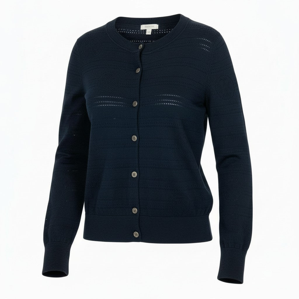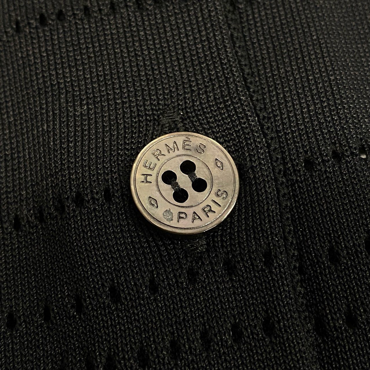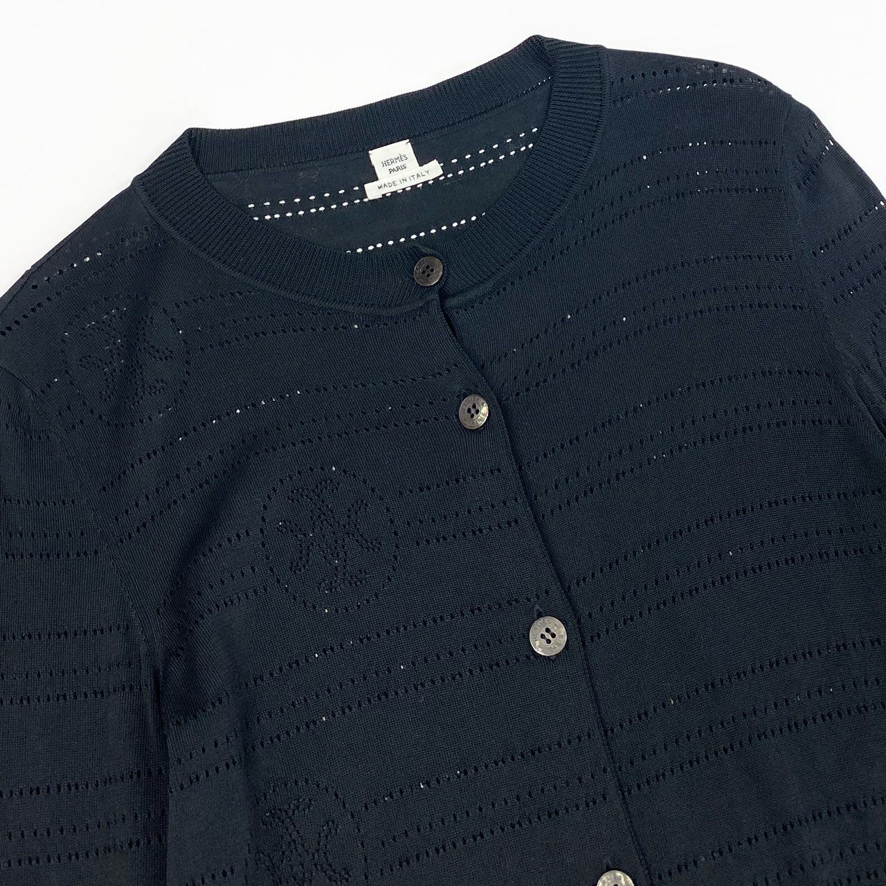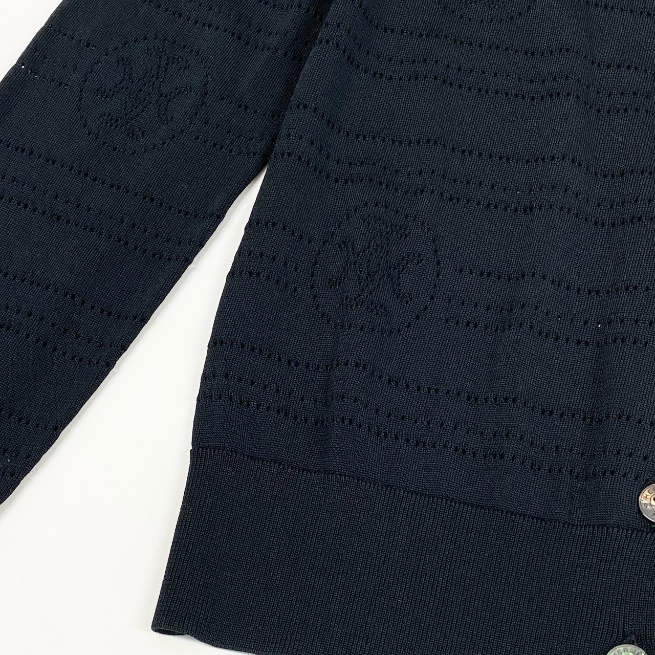上品なブラックカラーに、全体へさりげなく入ったの透かし編みパターンが印象的な、HERMÈSのカーディガンです。マットな質感の上質ニット素材で、軽やかさと高級感を両立。フロントはシンプルなボタン仕様で、羽織りとしてもトップス感覚でも着用可能です。通勤やきれいめカジュアル、季節の変わり目の温度調整にも活躍する一着です。