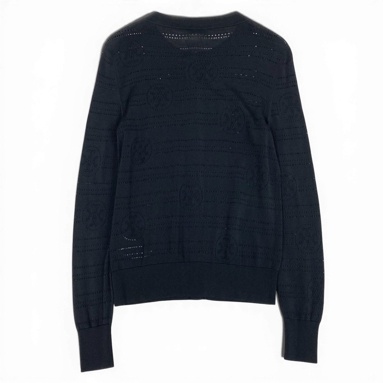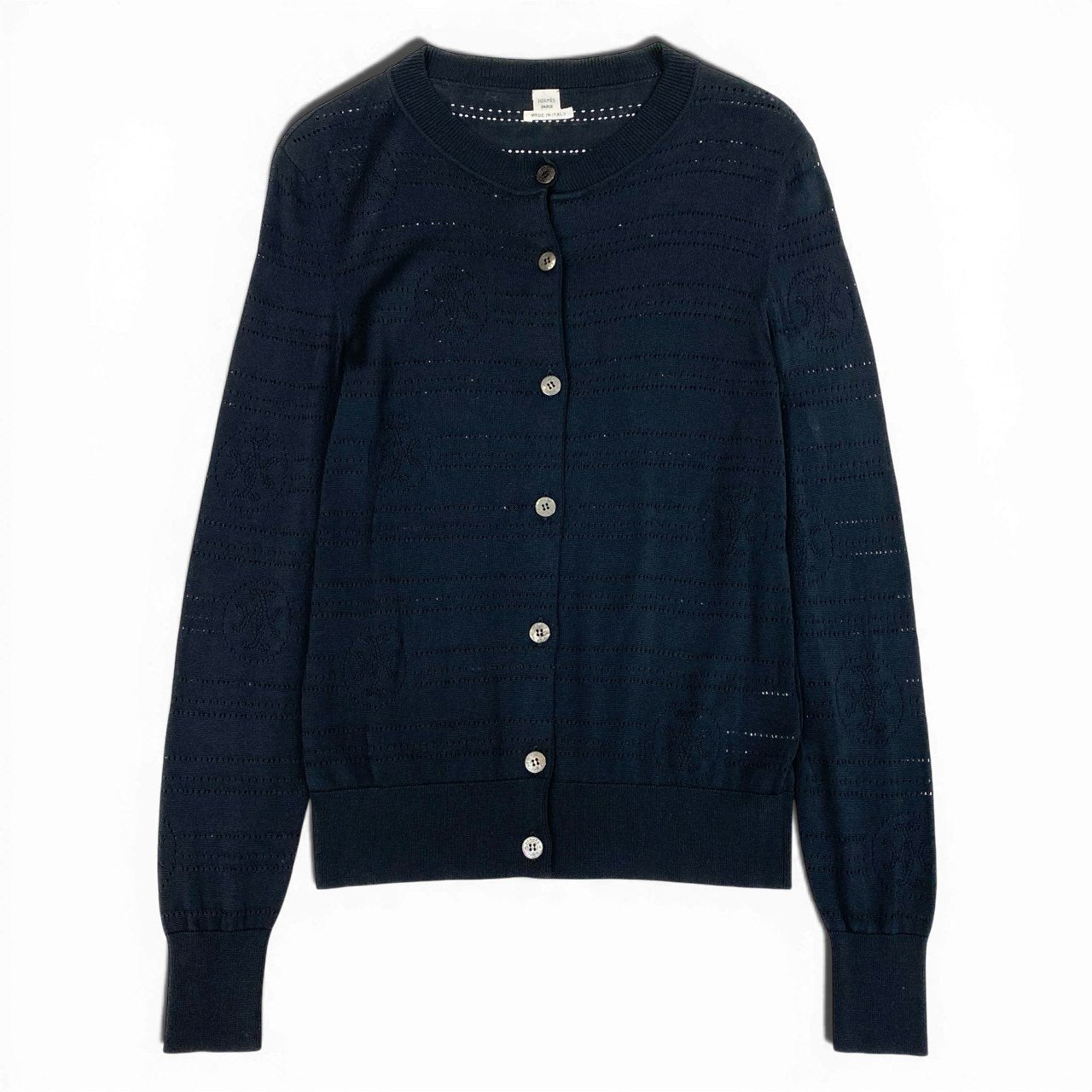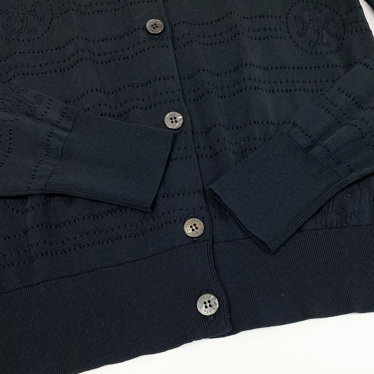65a14【美品】 HERMES エルメス ニットカーディガン ロングスリーブ 総柄 ロゴ コットンブレンド〇 イタリア製 レディース 女性用 サイズ36 ブラックo07t