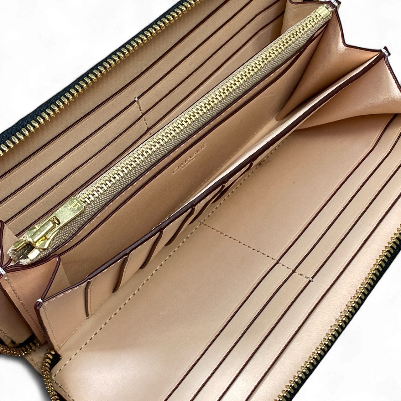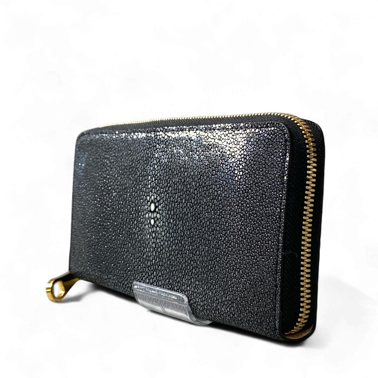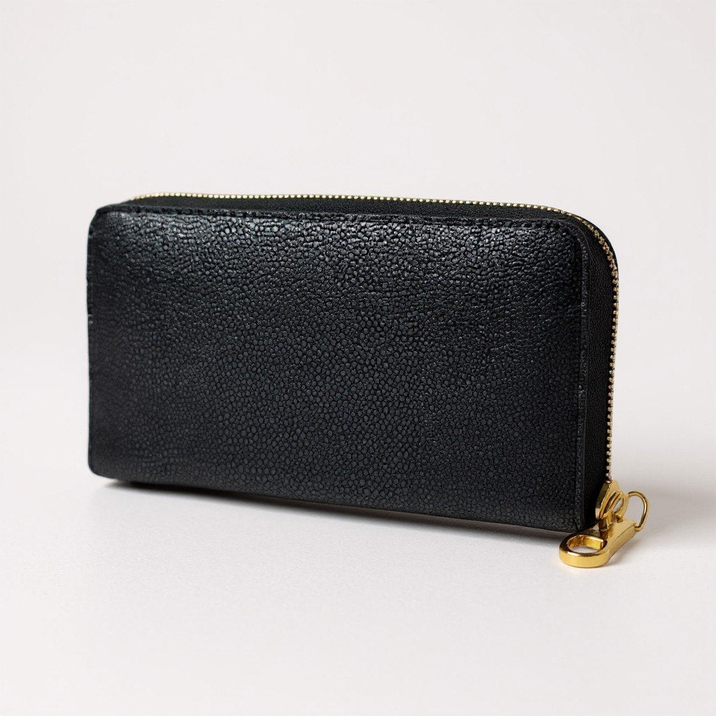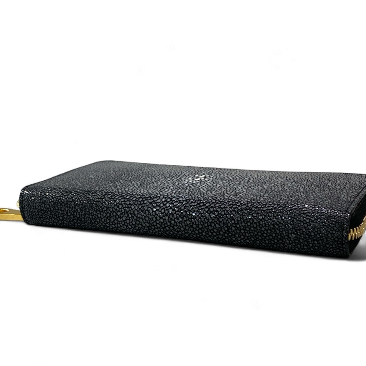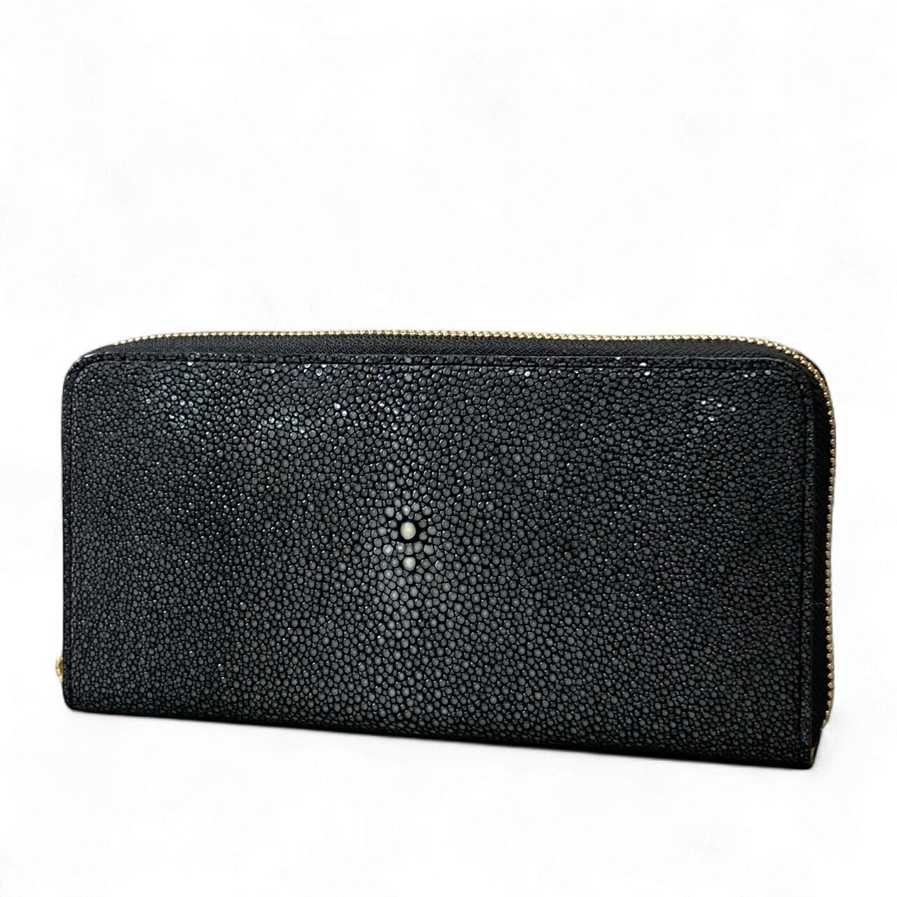 CIMABUEの長財布。表面はきめ細かな凹凸が美しいブラックのスティングレイ(エイ革)調レザーで、上品な光沢がありラグジュアリーな印象です。ジップの引き手には存在感のあるゴールド金具を採用し、高級感をさらに引き立てています。耐久性が高く傷が目立ちにくい素材のため、日常使いでも長く美しい状態を保ちやすい点が魅力。シンプルかつ洗練されたデザインで、男女問わず上質な長財布をお探しの方におすすめの一品です。