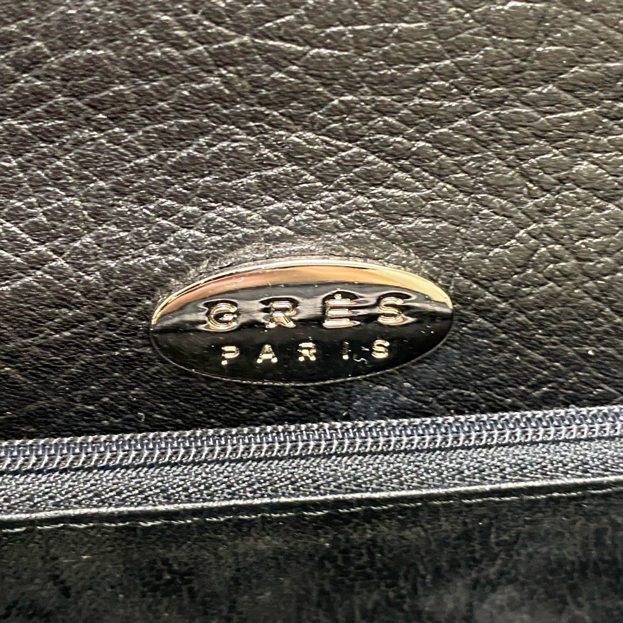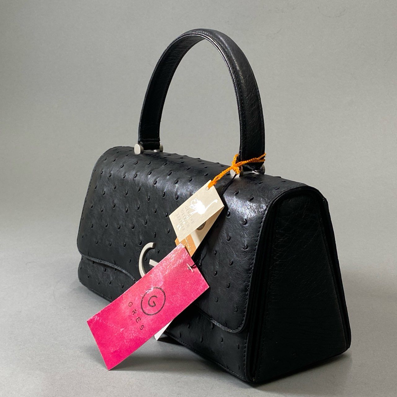 GRESのレディースハンドバッグです。写真からは深みのあるブラックカラーに、オーストリッチ特有の羽根毛穴模様が確認でき、上質な光沢を放っています。フロントにはシルバートーンの「G」ロゴ金具があしらわれ、シンプルながらも存在感のあるデザイン。JRA認定のオーストリッチレザーを使用し、耐久性と高級感を兼ね備えています。フォーマルな場や特別なシーンにふさわしい、エレガントな印象のアイテムです。