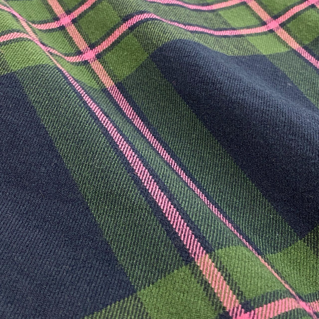 Vivienne Westwood RED LABELらしいブリティッシュテイストが際立つ、ダブルブレストのテーラードジャケットです。カラーはミッドナイトネイビーをベースに、グリーン×ピンクのチェック柄を配した存在感のあるデザイン。マットなウール調素材に、**ベロア調のブラック切替(襟・ポケット)**がアクセントとなり、ブランドらしい遊び心を演出します。裏地は総柄仕様で、見えない部分までこだわった仕立て。スカートやスラックスはもちろん、デニム合わせでモードカジュアルにも映える一着です。