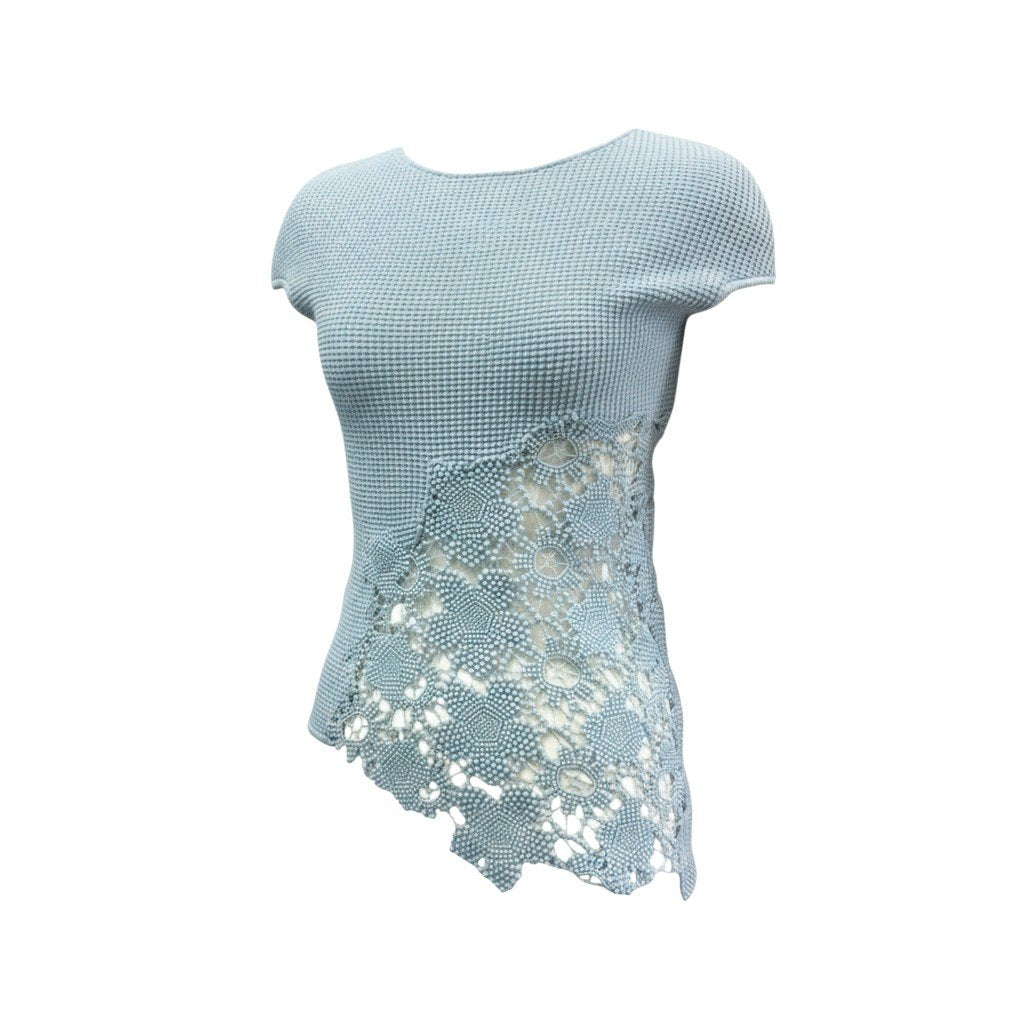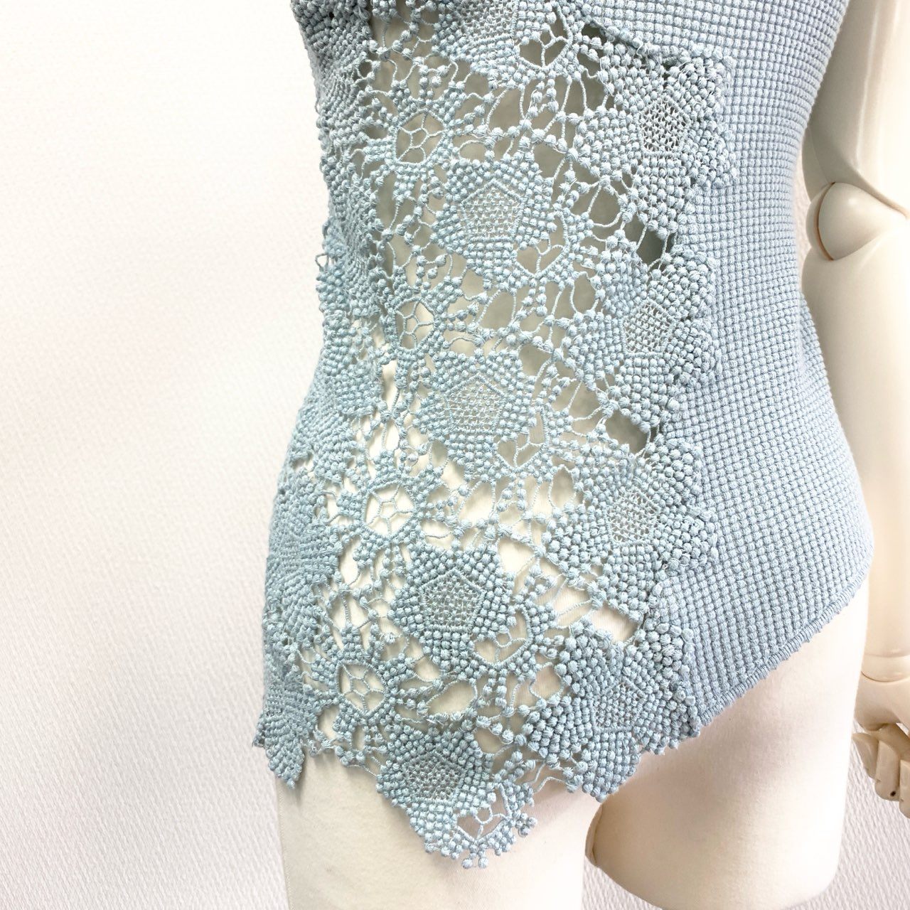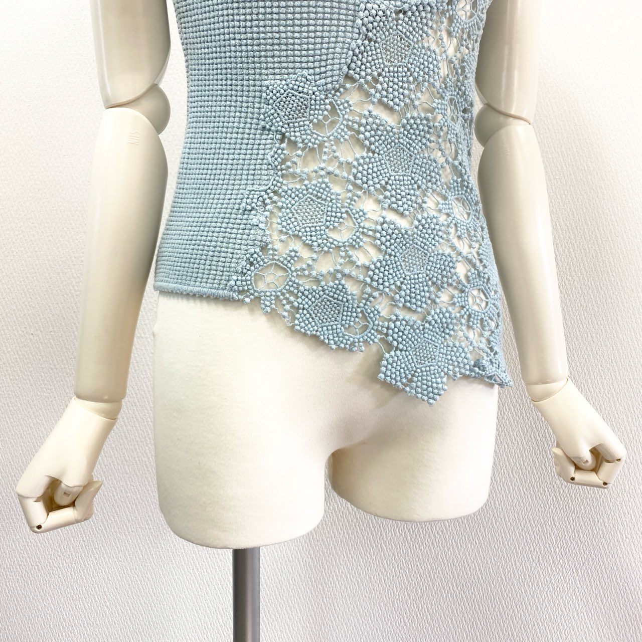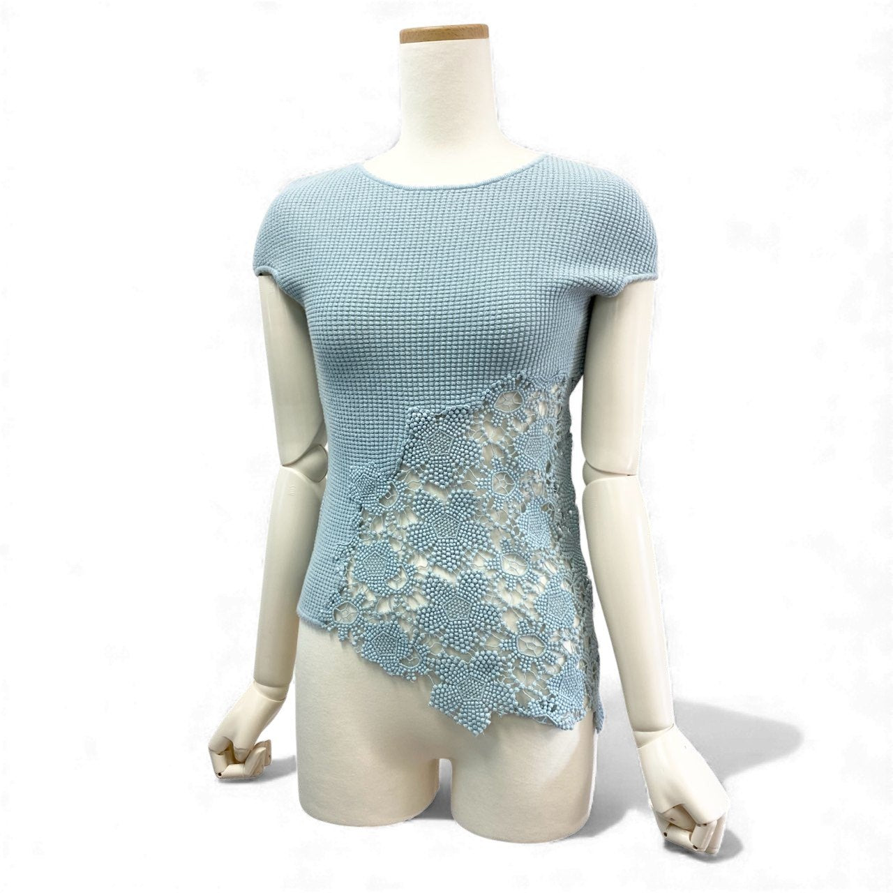 淡いペールブルーが上品なCHANELの半袖ニットトップス。立体的な編地のワッフル調ニットと、アシンメトリーに重ねられたフローラルレースパネルが華やかで、他にはない存在感を演出します。レース部分は透け感があり、軽やかでフェミニンな印象に仕上げられています。コンパクトなショート丈で、スカート・デニムどちらにも合わせやすく、ドレスアップから日常のエレガントコーデまで幅広く活躍します。CHANELらしいディテールの美しさが際立つ特別な一枚です。