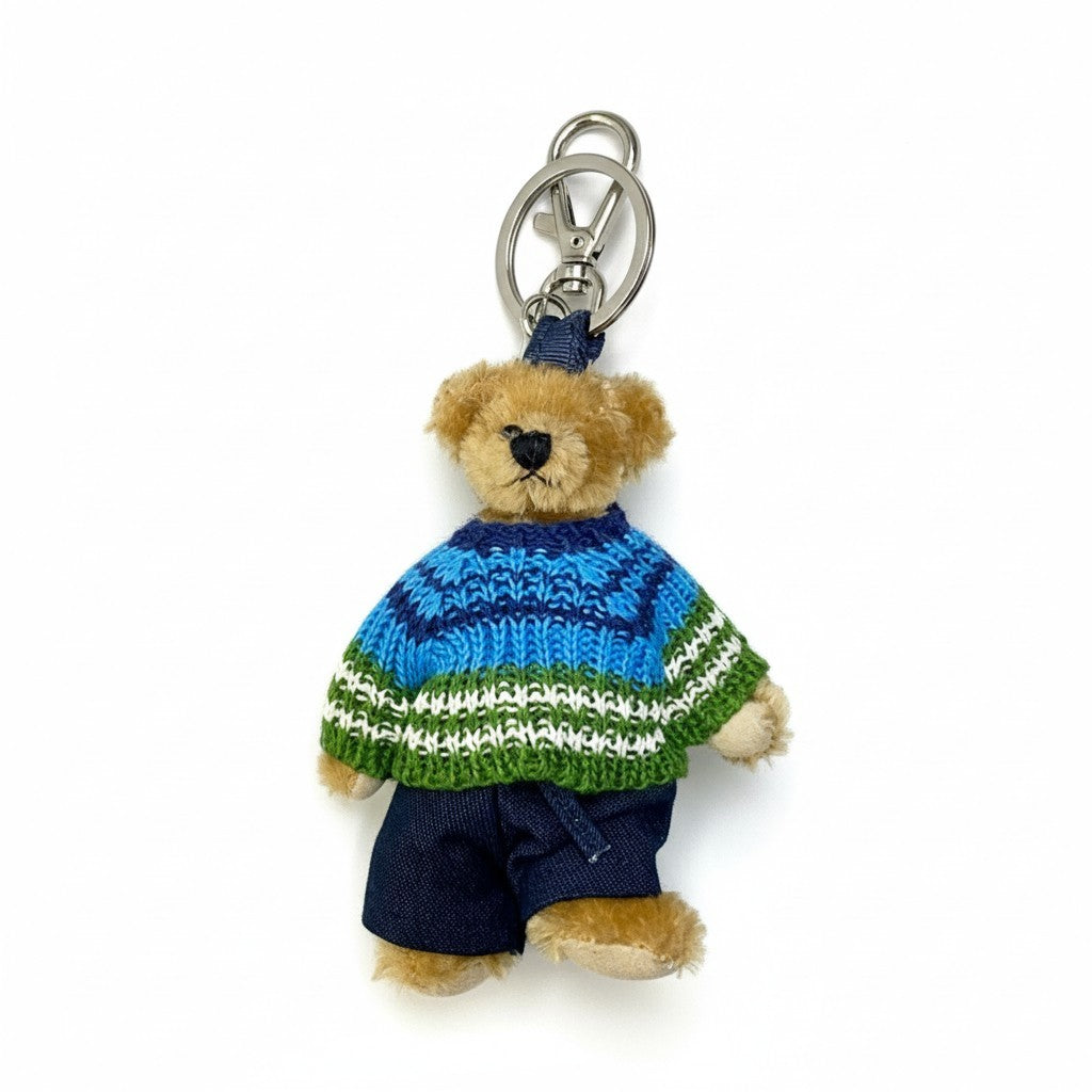 キャメルブラウンの毛足のあるファー素材テディベアに、ターコイズブルー・ロイヤルブルー・グリーンのボーダーニット(ノルディック調パターン)を合わせた温かみのあるデザイン。マットな質感のネイビーパンツとのコントラストが可愛らしさを引き立てます。メタルキーリング付きで実用性も兼備。バッグに付けるだけでコーディネートのアクセントになる、遊び心あふれるプラダのバッグチャームです。