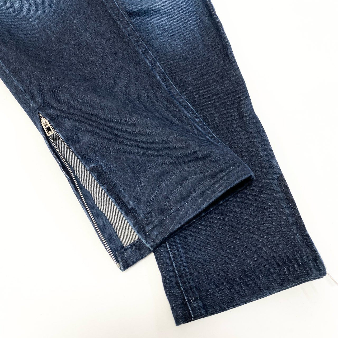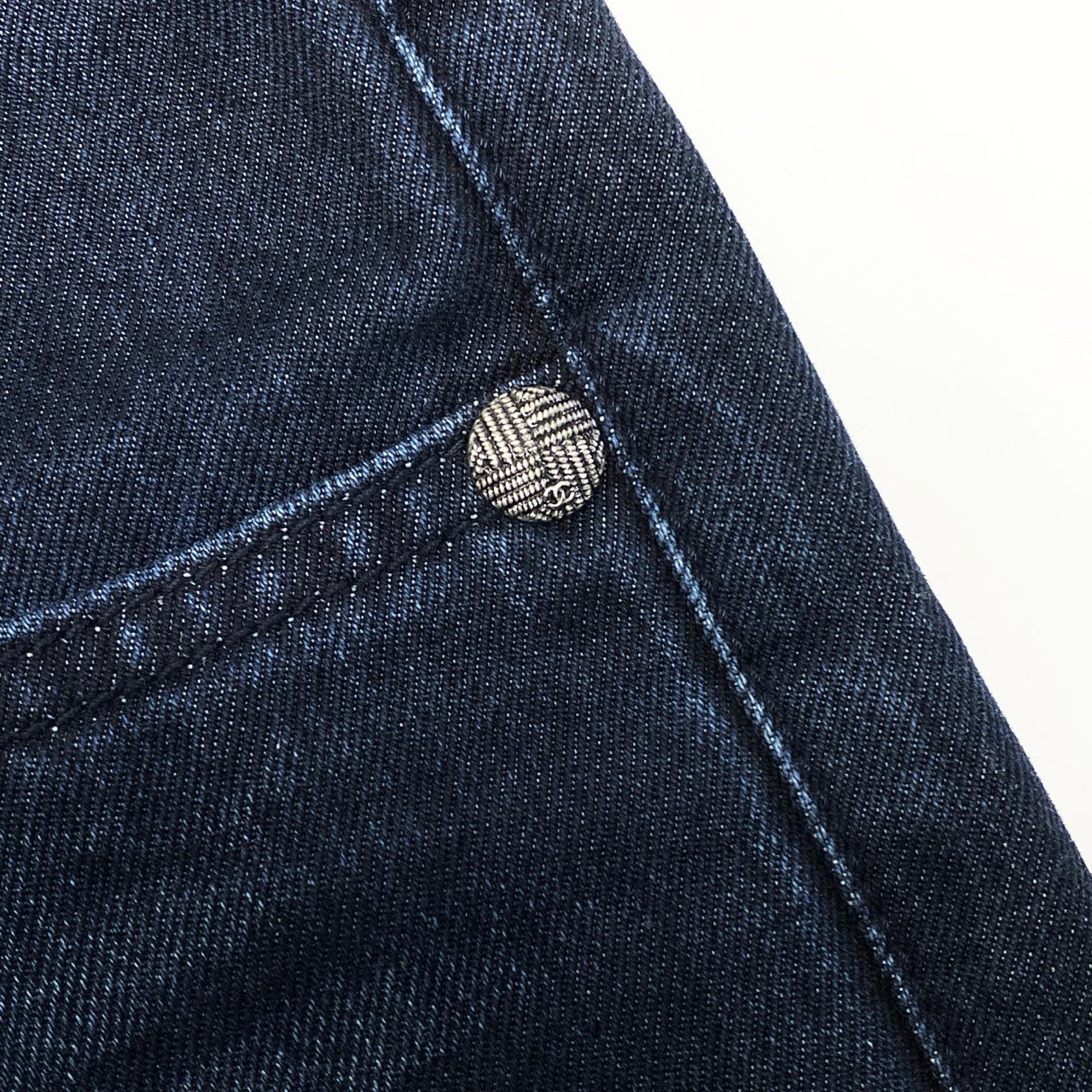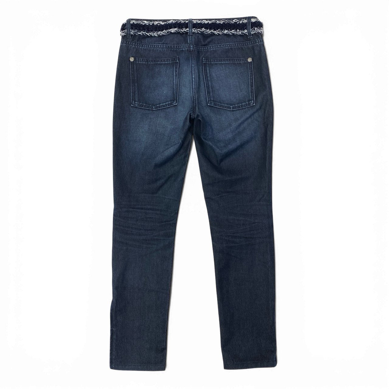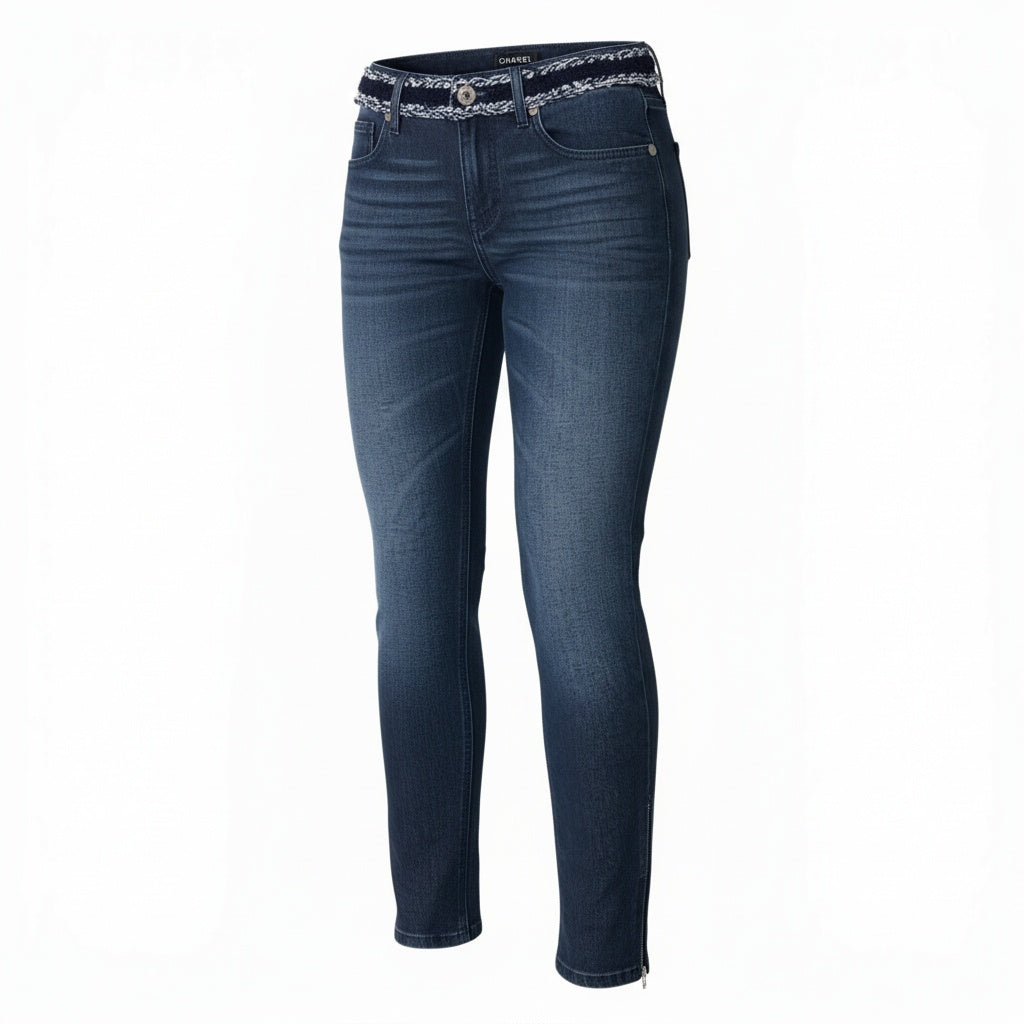 深みのあるインディゴブルーが美しい、シャネルのデニムパンツ(2016年モデル)です。ウエスト部分には編み込みデザインが施され、さりげないココらしさを演出。マットな質感のデニムに、裾ジップ仕様がアクセントとなり、シルエット調整や足元アレンジも可能です。トップスを選ばず合わせやすく、日常使いから上品なカジュアルスタイルまで幅広く活躍します。
