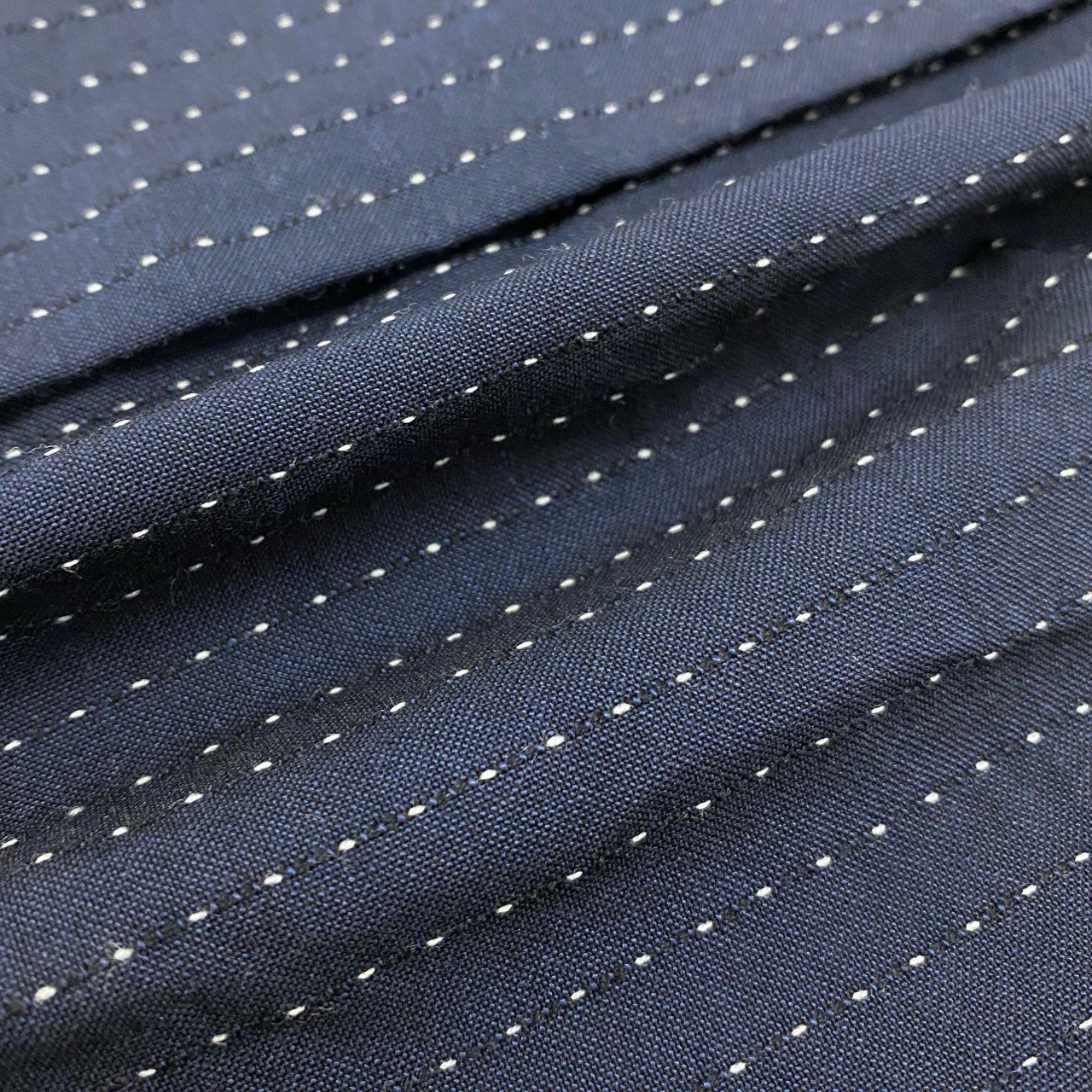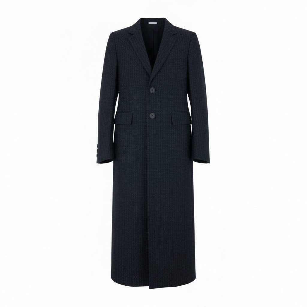 コムデギャルソンオムプリュスの13SSロングジャケット。深いネイビーに細かなピンストライプが入った上品でモード感のある一着です。マットな質感のウール系素材に、2ボタンとシャープなラペルが特徴的なデザインです。超ロング丈のシルエットが存在感を放ち、レイヤードスタイルやドレススタイルとも好相性です。ギャルソンらしい独自のバランス感を楽しめるコレクションピースです。