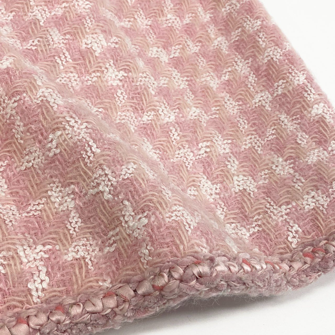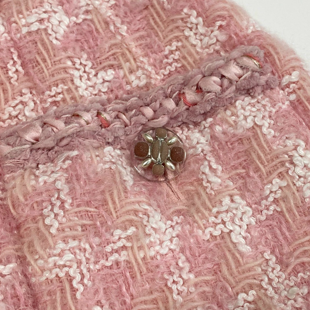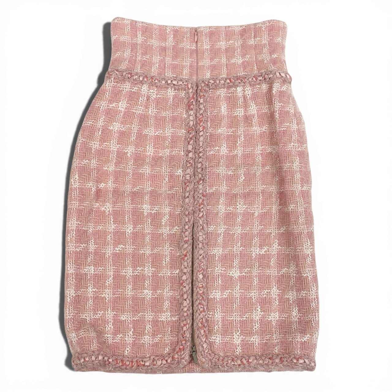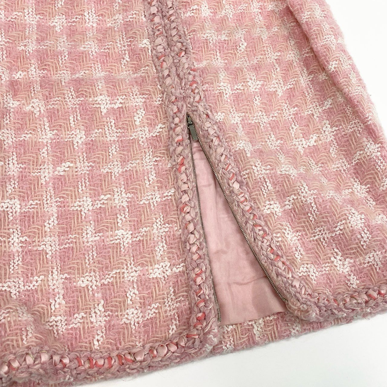 やわらかなペールピンク×ホワイトの配色が上品な、CHANELのツイードトリムスカートです。 細かなチェック調のツイード生地で、マットかつ立体感のある優しい素材感が特徴です。 ウエストや裾、ポケット周りには編み込みトリムをあしらい、さりげなくシャネルらしさを演出しています。 ブラウスやツイードジャケットと合わせたフォーマルスタイルはもちろん、ニット合わせのエレガントな日常使いにもおすすめの一着です。