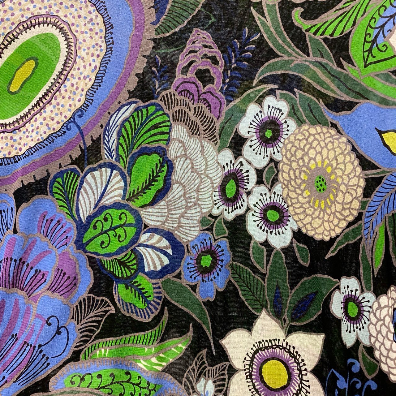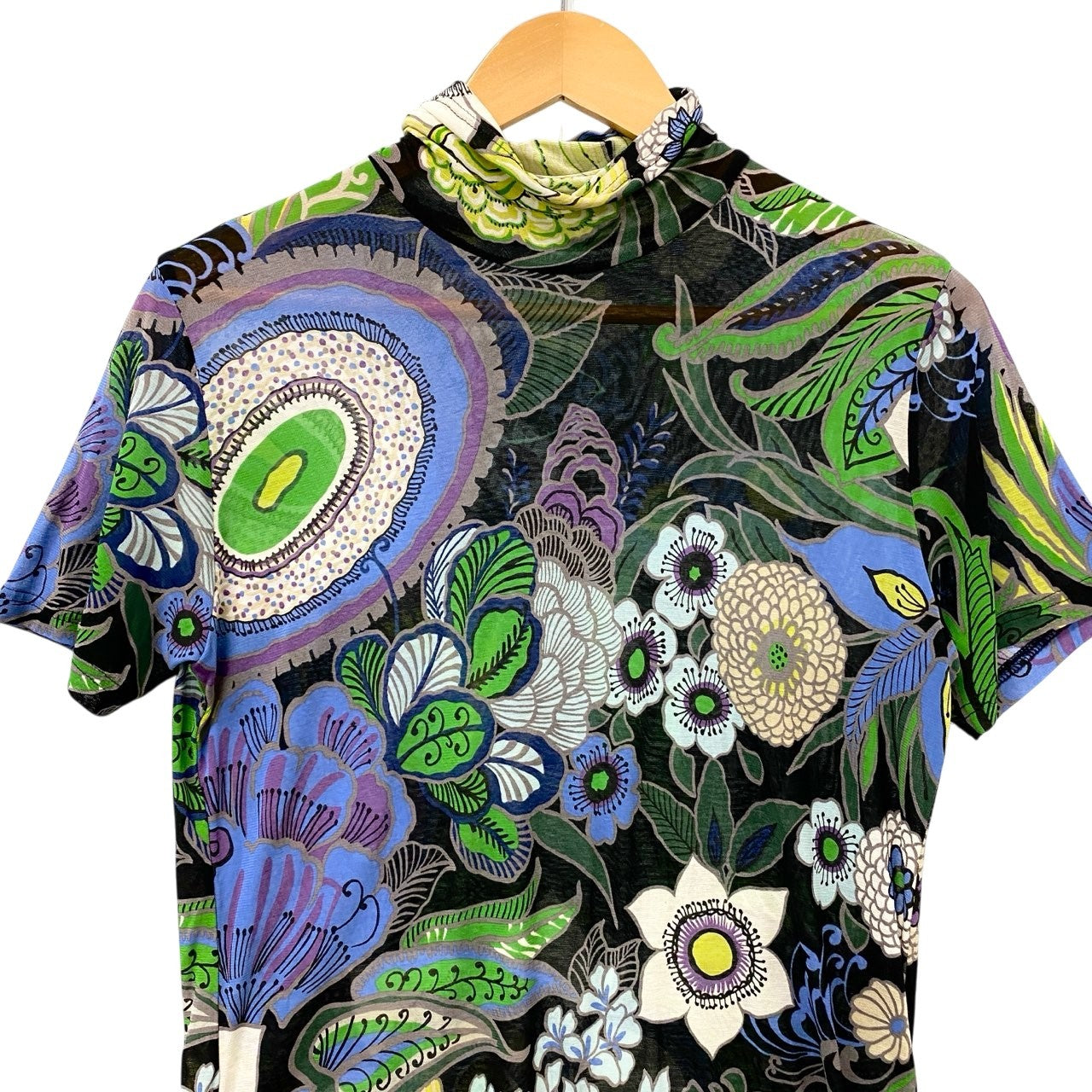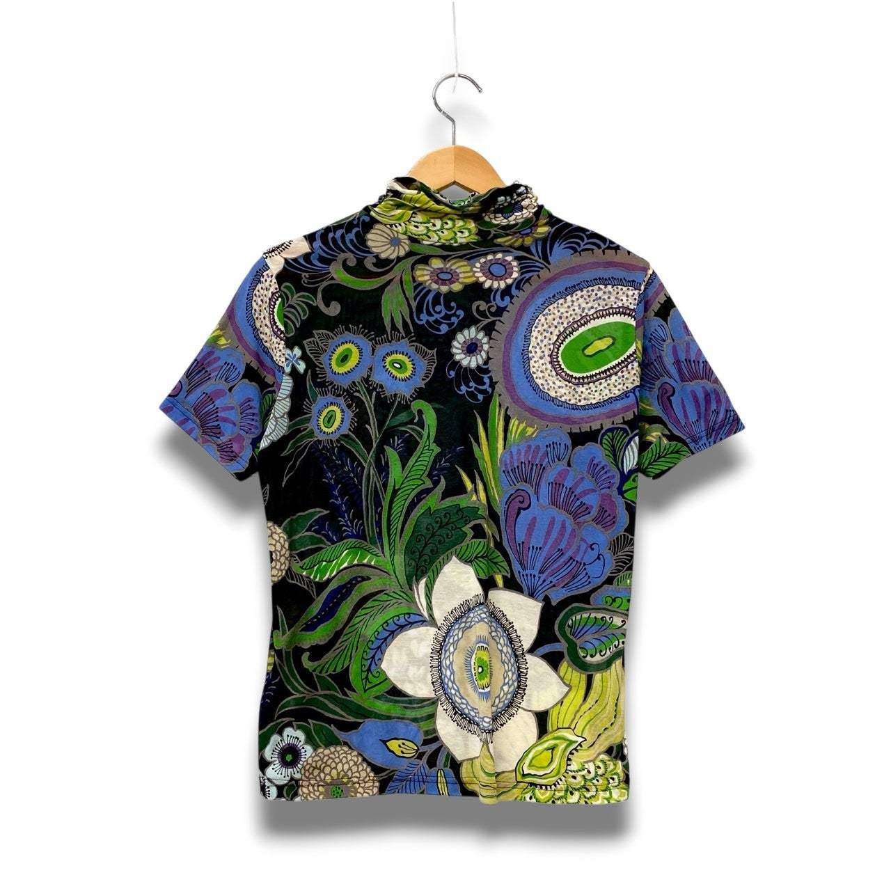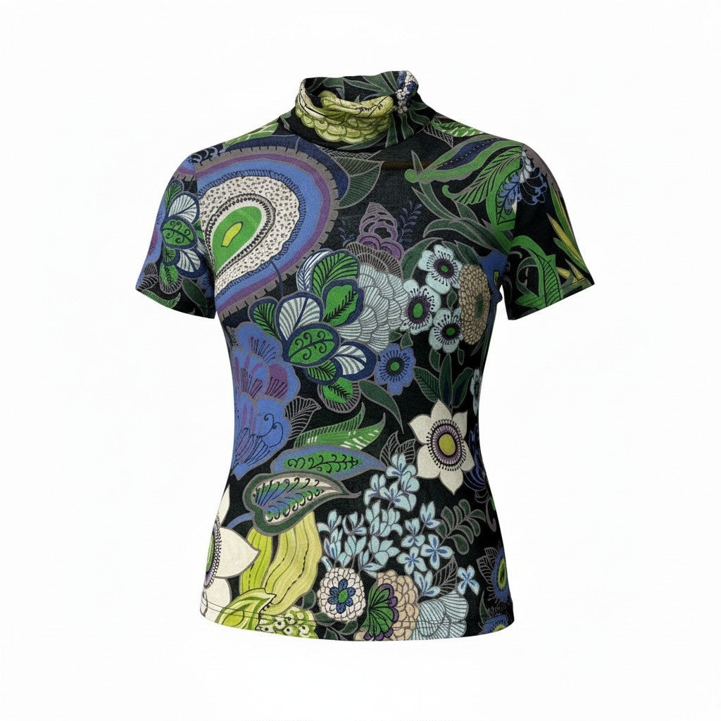 ブラックベースにエメラルドグリーンやオリーブグリーン、ブルー、ラベンダーなどを配した総柄フラワープリントが目を惹くハイネック半袖カットソーです。ペイズリー調やボタニカルモチーフが立体的に広がり、華やかでアート性の高いデザインが特徴。マットな質感のコットン100%素材で、さらりとした着心地も魅力です。一枚で主役になる存在感があり、シンプルなボトムスと合わせるだけで洗練された大人のコーディネートが完成します。