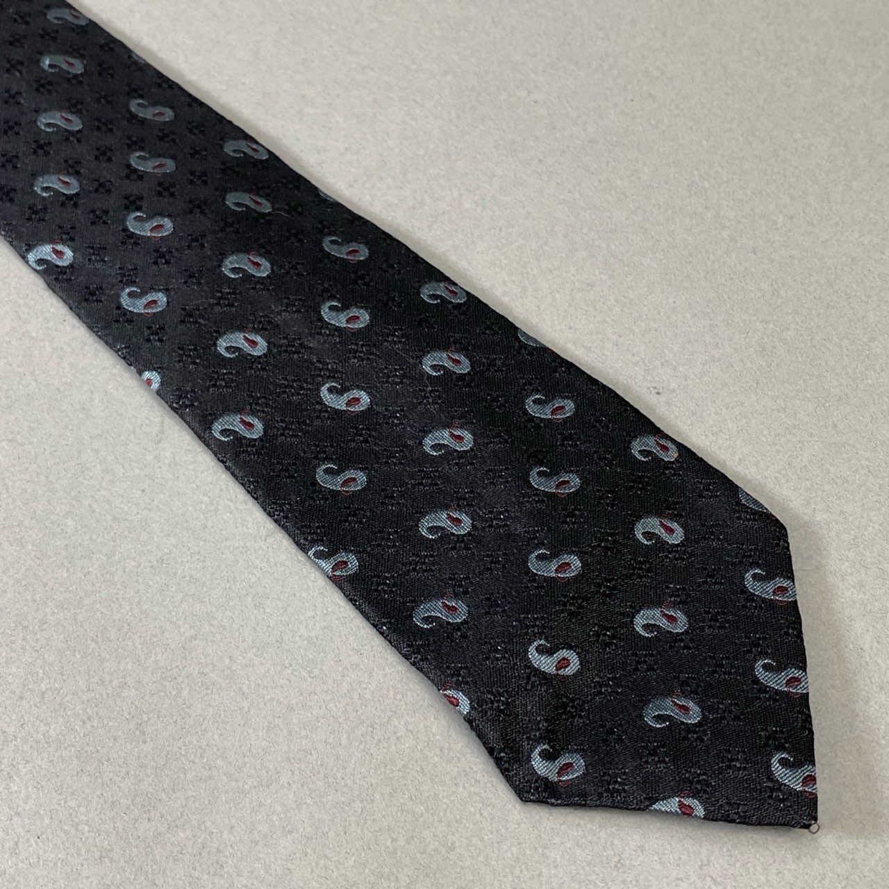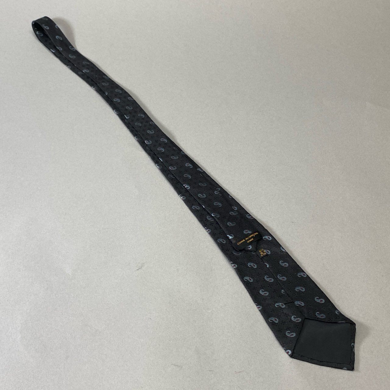 COMME des GARÇONS HOMME(コムデギャルソン オム)のシルクネクタイ。ブラック地にグレーのペイズリー柄を織り込んだ上品なデザインです。光沢のあるシルク素材が首元に華やかさを添えつつ、落ち着いた色味で大人の印象を演出。スーツやジャケットスタイルに合わせやすく、ビジネスシーンやフォーマルな場にも活躍します。繊細な織りの表情が、ブランドらしい洗練された雰囲気を漂わせる一本です。