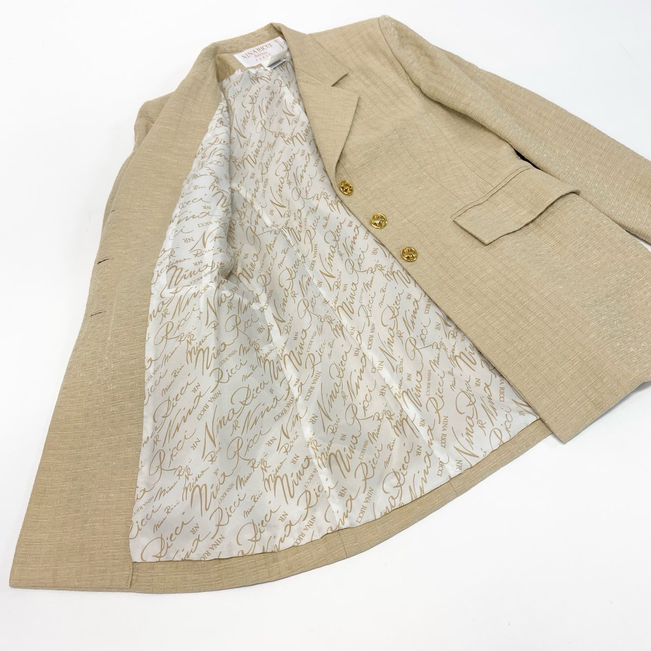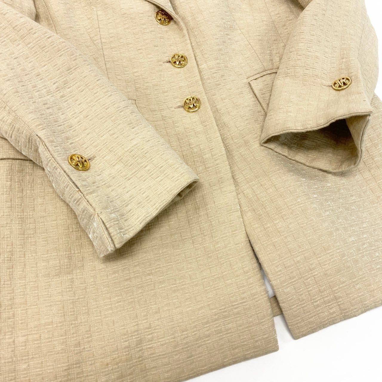 15K18 NINA RICCI Edition ニナリッチ フランス製 テーラードジャケット ロングジャケット 金ボタン 裏地総柄 レディース 女性用 42 ベージュu02t