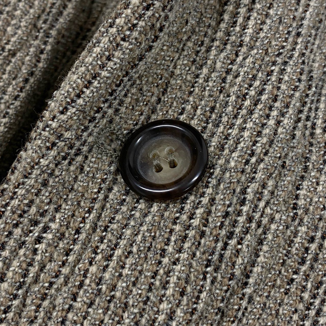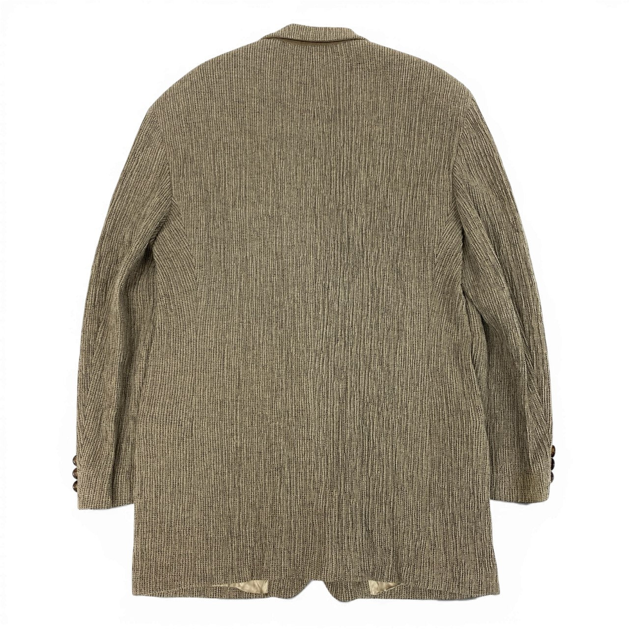 エンポリオ・アルマーニの90’sムードが漂う、ベージュ系ツイードテーラードジャケットです。ざっくりとしたマットなツイード素材に、奥行きのある織り柄がクラシカルな表情を演出します。無地調ながら素材感で魅せるデザインは、羽織るだけでスタイリングに深みをプラス。カジュアルからきれいめまで幅広く対応し、秋冬の主役アウターとして活躍する一着です。