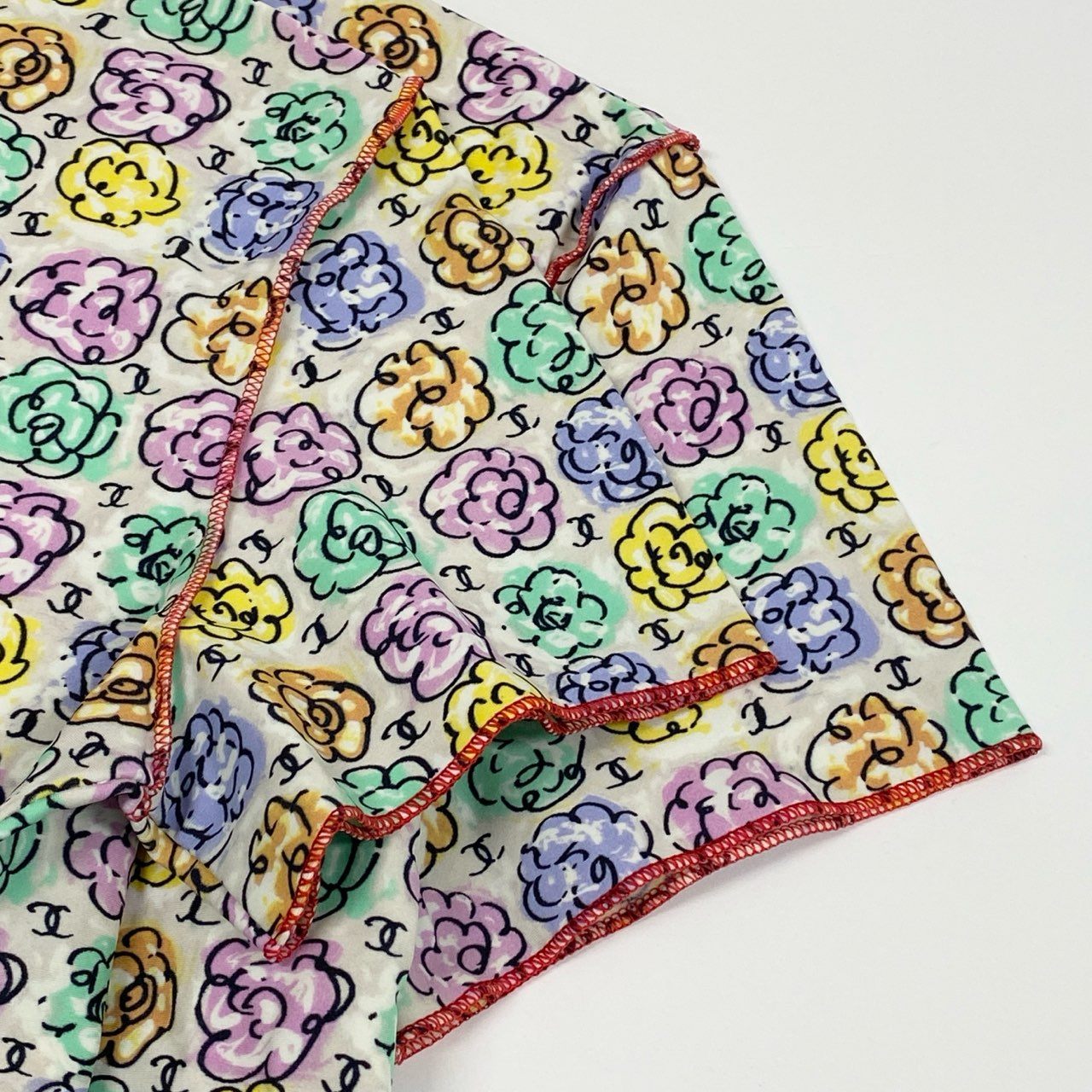 アイボリーベースに、ラベンダー・ミントグリーン・レモンイエロー・ベビーピンクなどのパステル調フラワーとココマークが全面に配された華やかな一着。 細かな総柄フラワーパターンで、ポップかつフェミニンな印象を演出します。 素材はしなやかなマイヨ(やや伸縮性のあるマットなカットソー生地)で、着心地も軽やかです。 デニムやホワイトパンツと合わせた爽やかな春夏コーデや、ジャケットインのアクセントとしてもおすすめです。