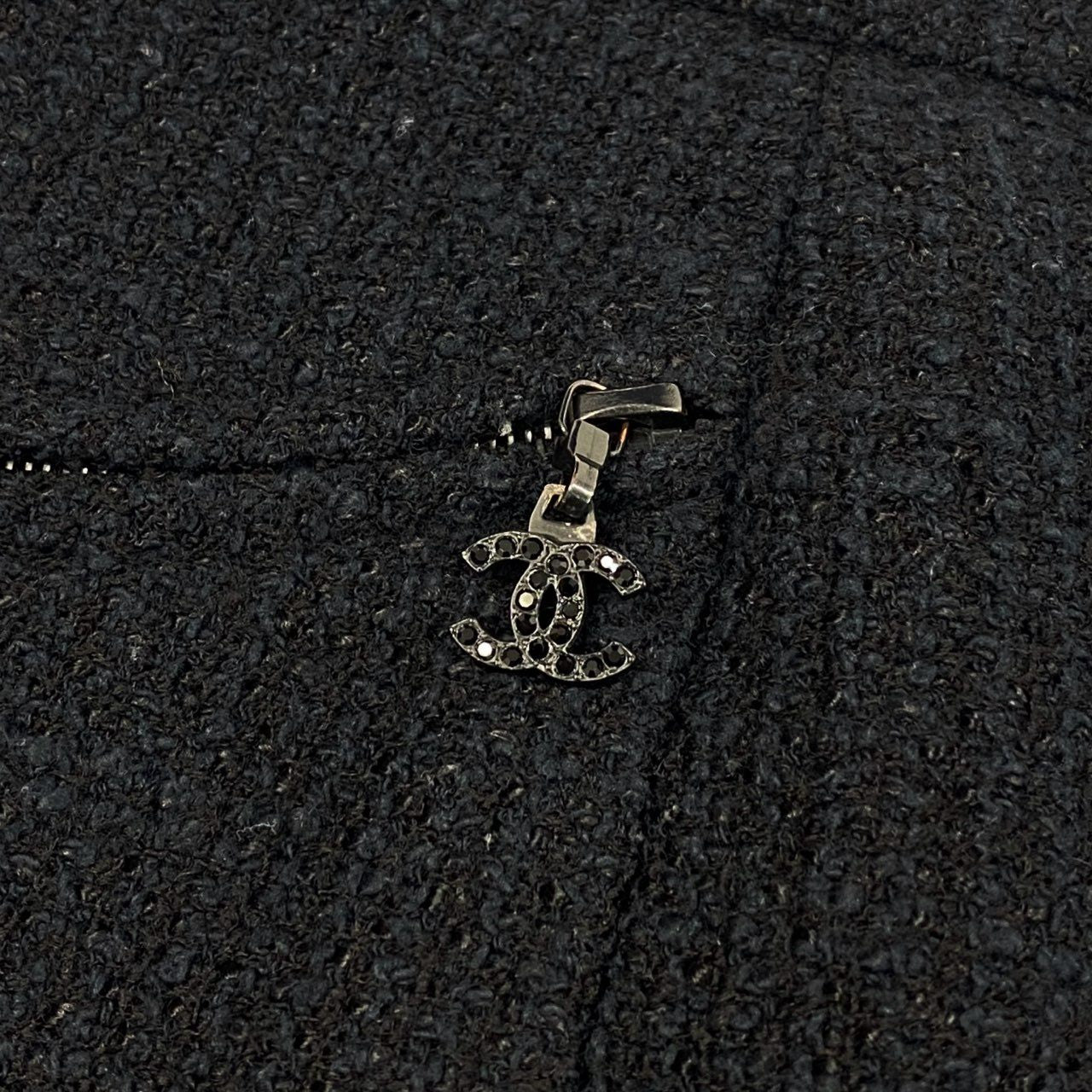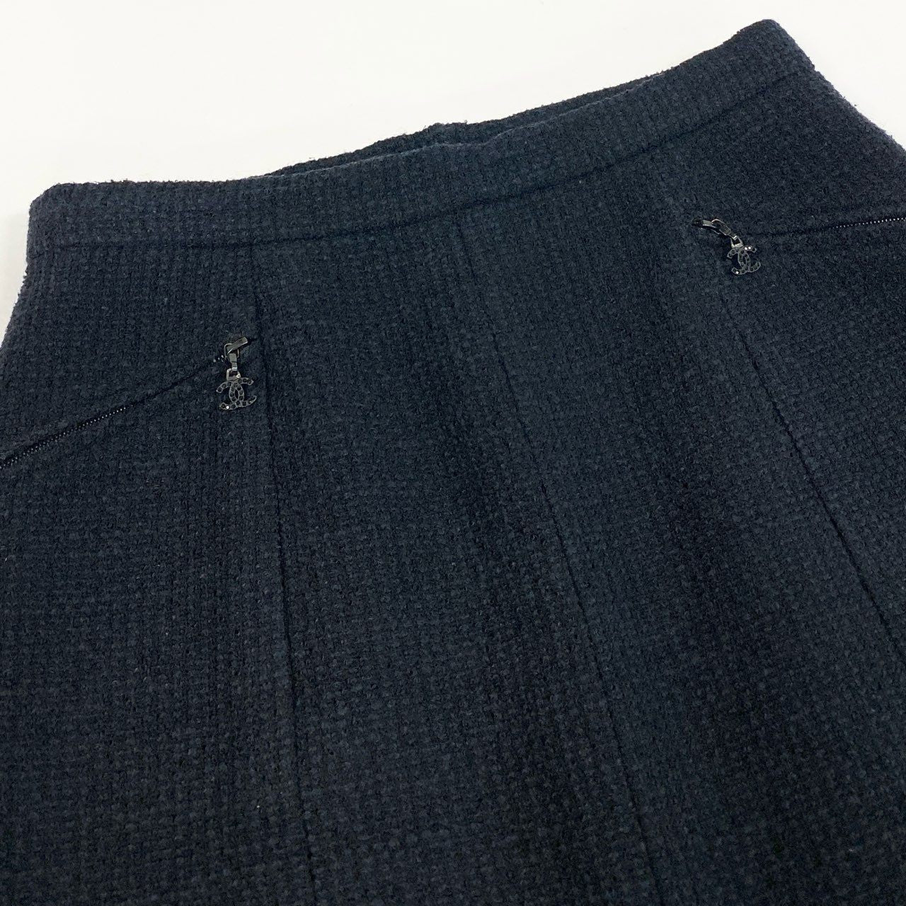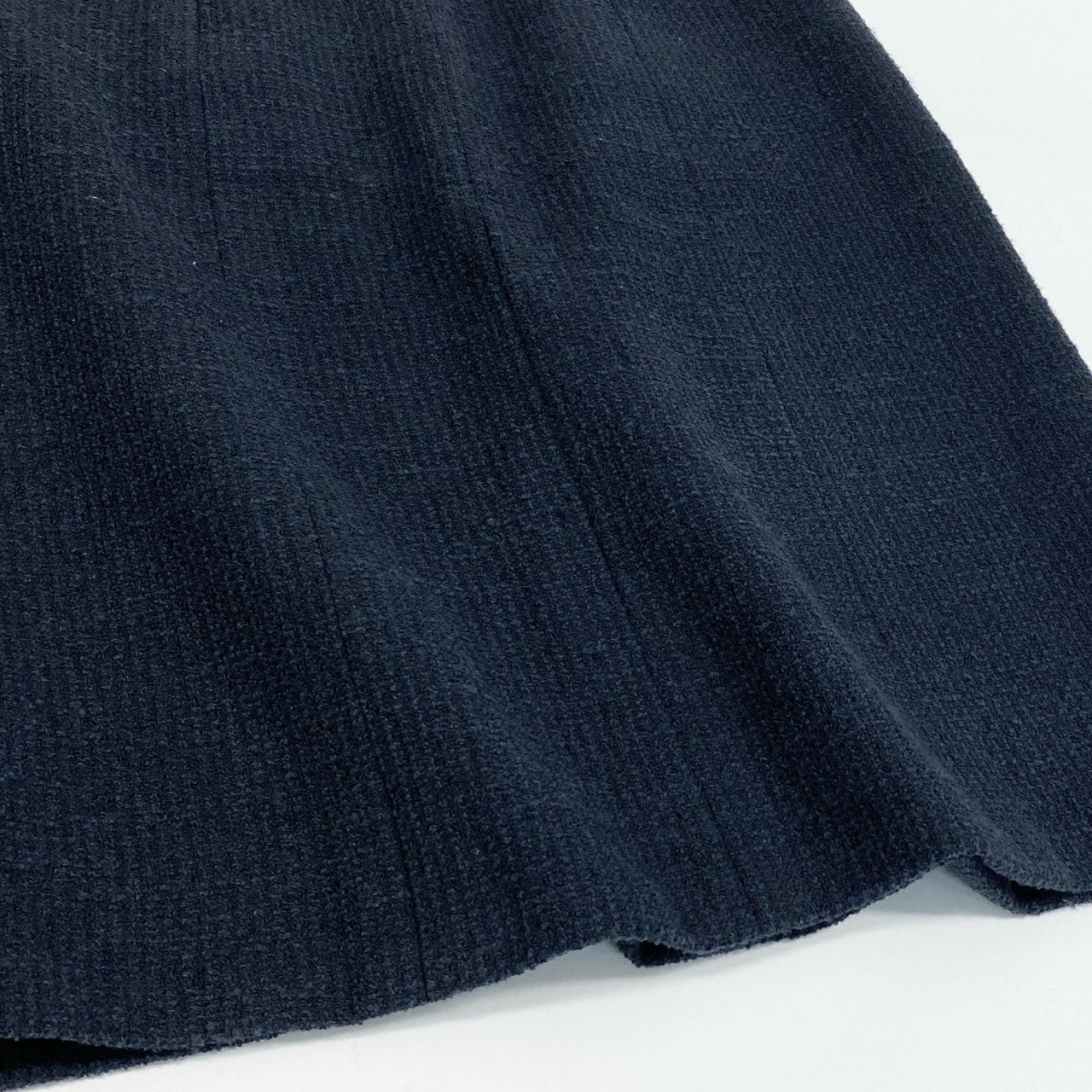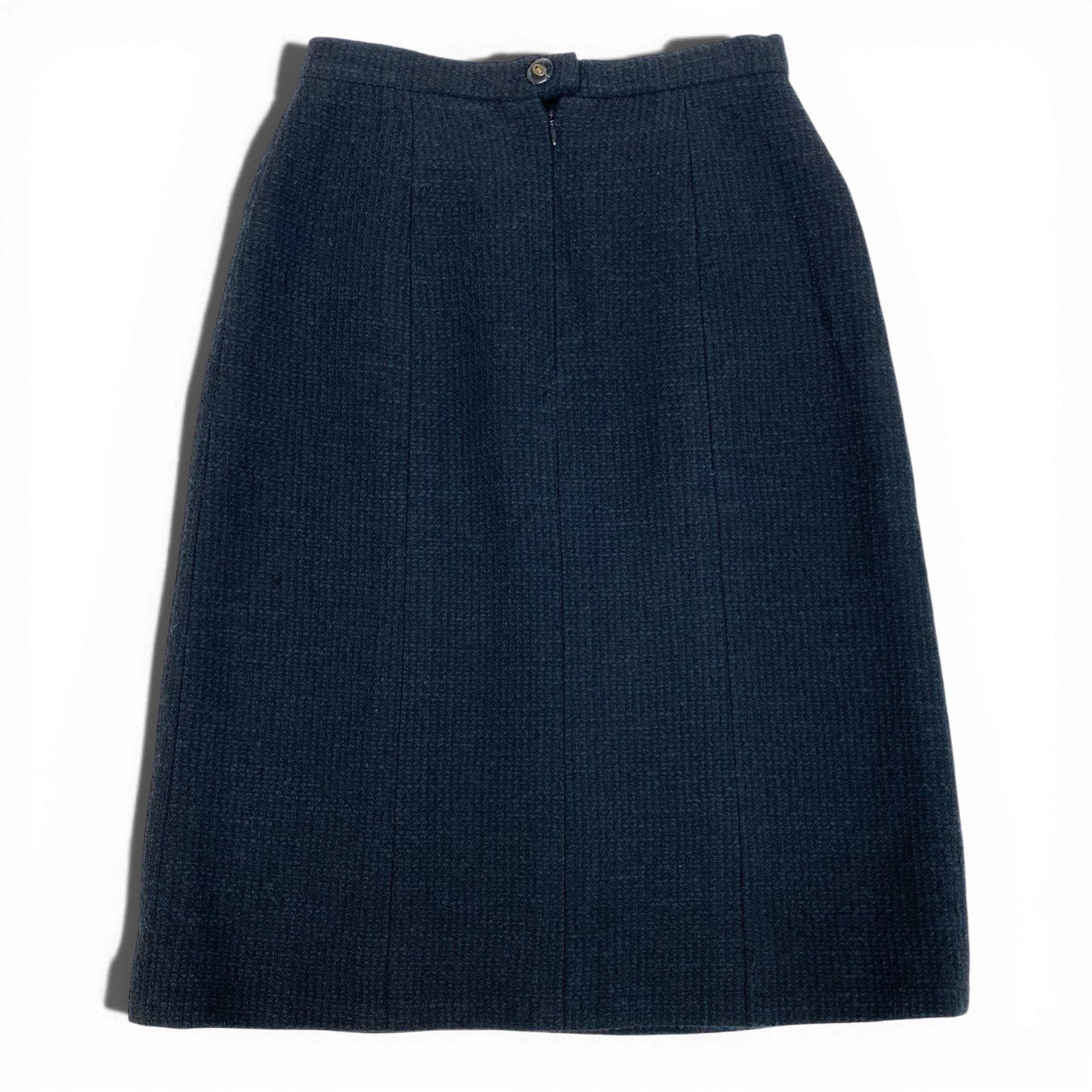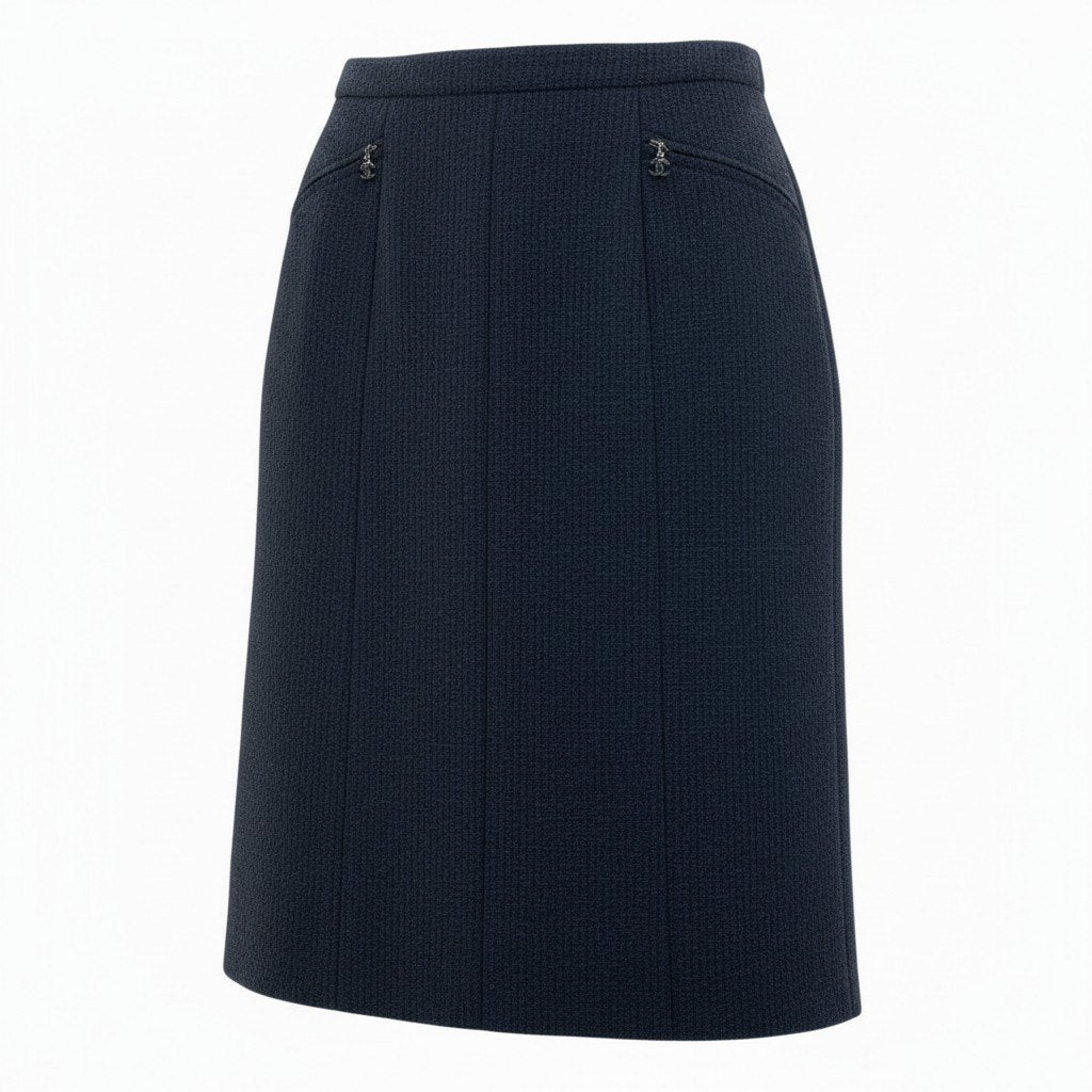 シャネルのミッドナイトネイビーが上品なツイードスカートです。無地ながら細やかな織り模様が浮かぶマットなツイード素材で、クラシックな存在感を放ちます。フロントポケット部分にはさりげないココマーク装飾が施され、ブランドらしい気品を演出。オフィススタイルからセレモニー、ジャケットとのセットアップ風コーデまで幅広く活躍する一着です。